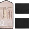 About this itemnThis travel jewelry box keeps your jewelry organized and can prevent your necklaces from tangling. This lightweight and compact case comes with 5 slot rolls, 2 small rectangular divisions, a pocket enclosure, interior mirror, and two larger hidden compartments.nA spacious and compact travel jewelry organizer, there is room to hold multiple earrings, rings, necklaces, and bracelets yet its small enough to fit in your luggage or in your small bag.nPerfect gift for Mother’s Day, Valentine’s Day, anniversaries, birthdays and morenCrafted with vegan leather in a rich caramel colorn7