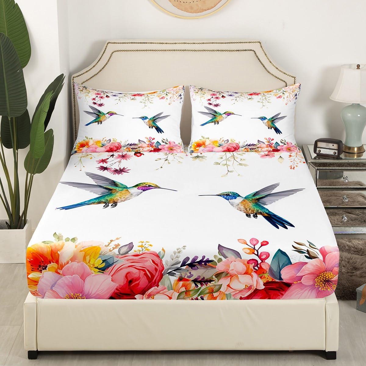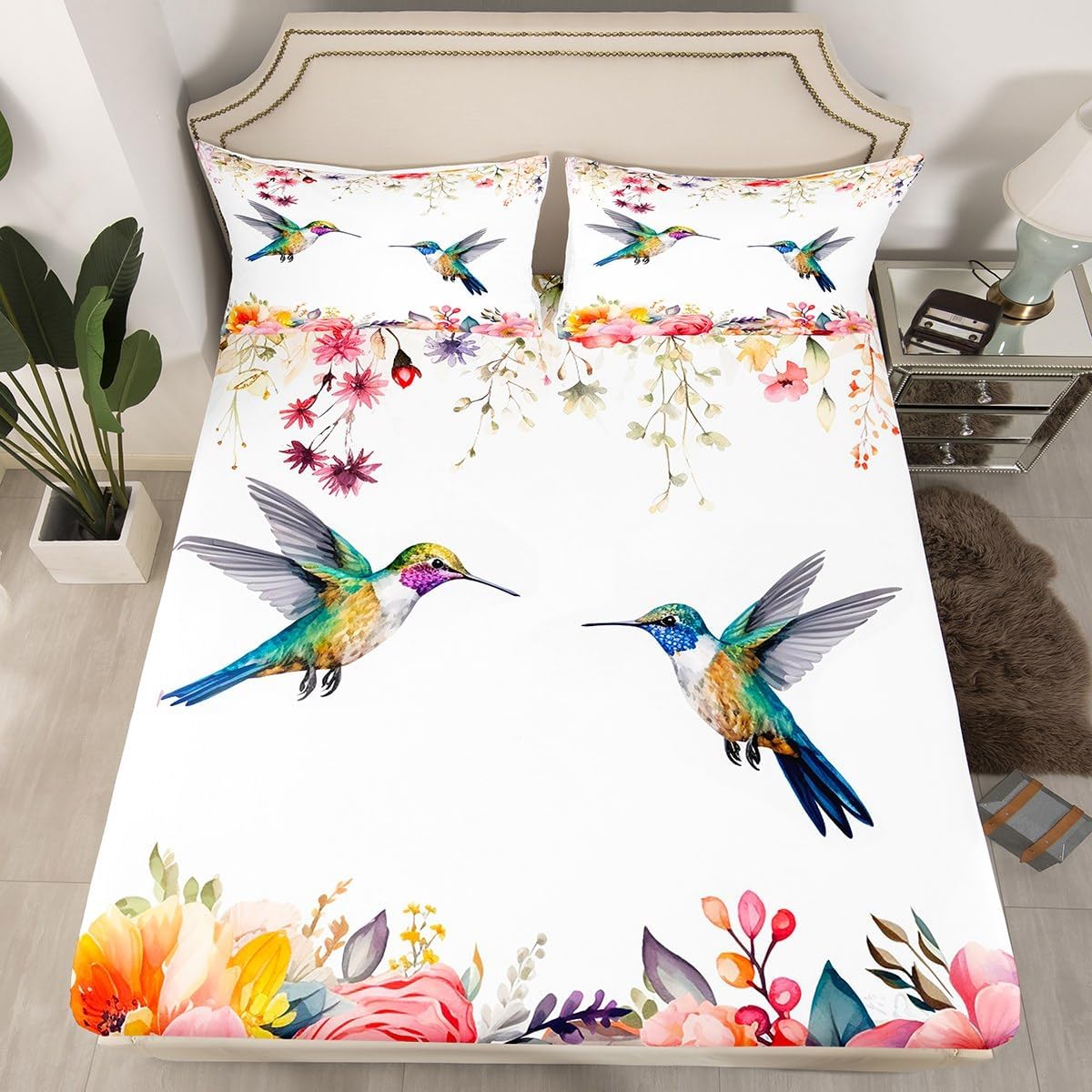 Hummingbird Sheet Set Twin Size Tropical Birds Sheets with Deep Pocket Fitted Sheet Hummingbird Flowers Bed Sheets Set Breathable Farmhouse Garden Bedding Set Blossoming Iris Flowers Bed Sheets Set