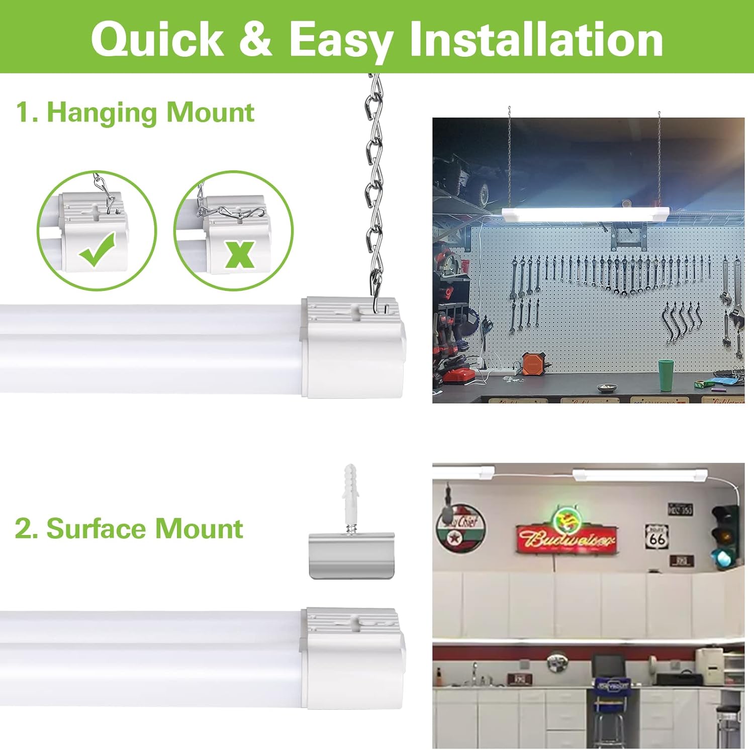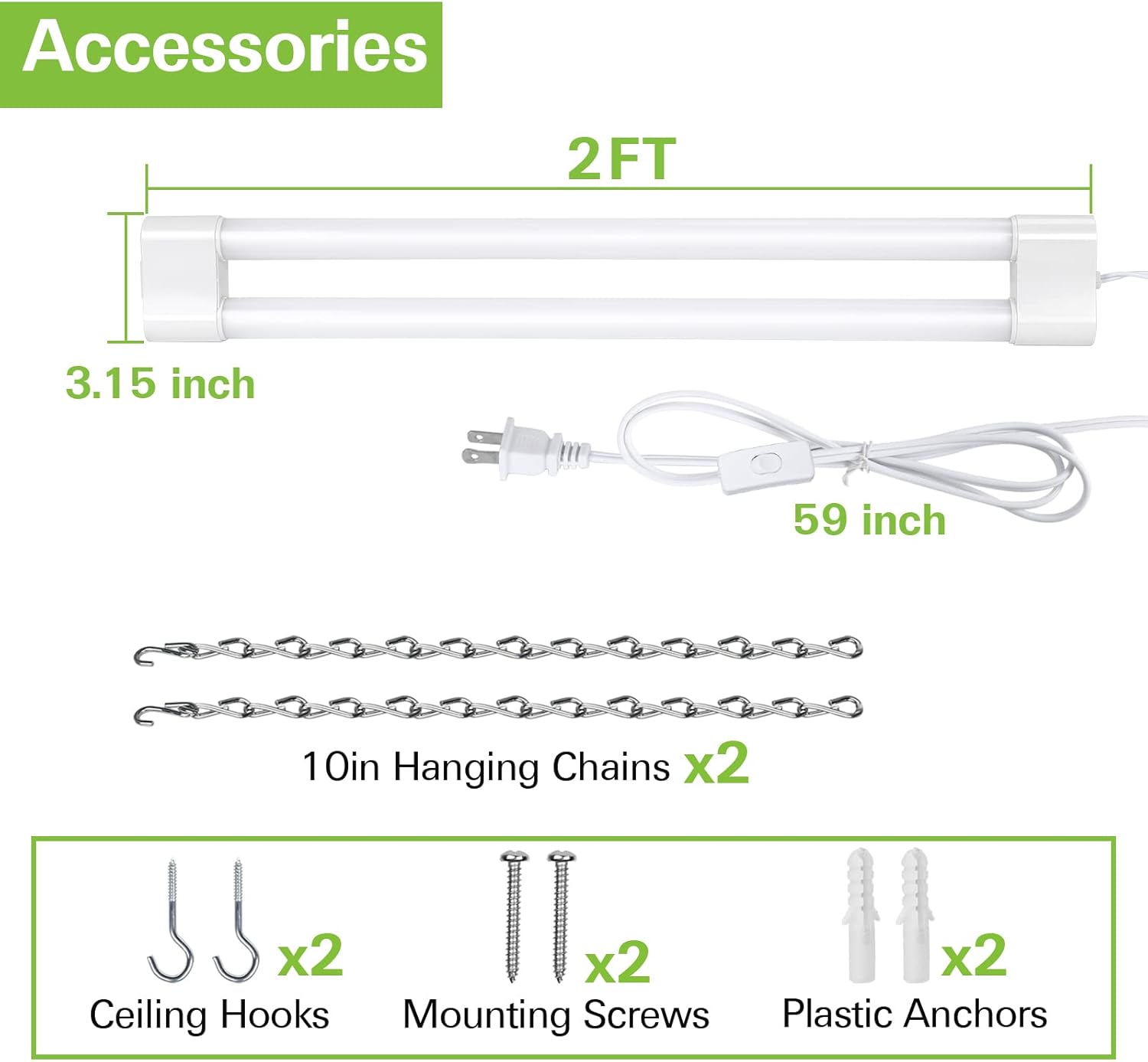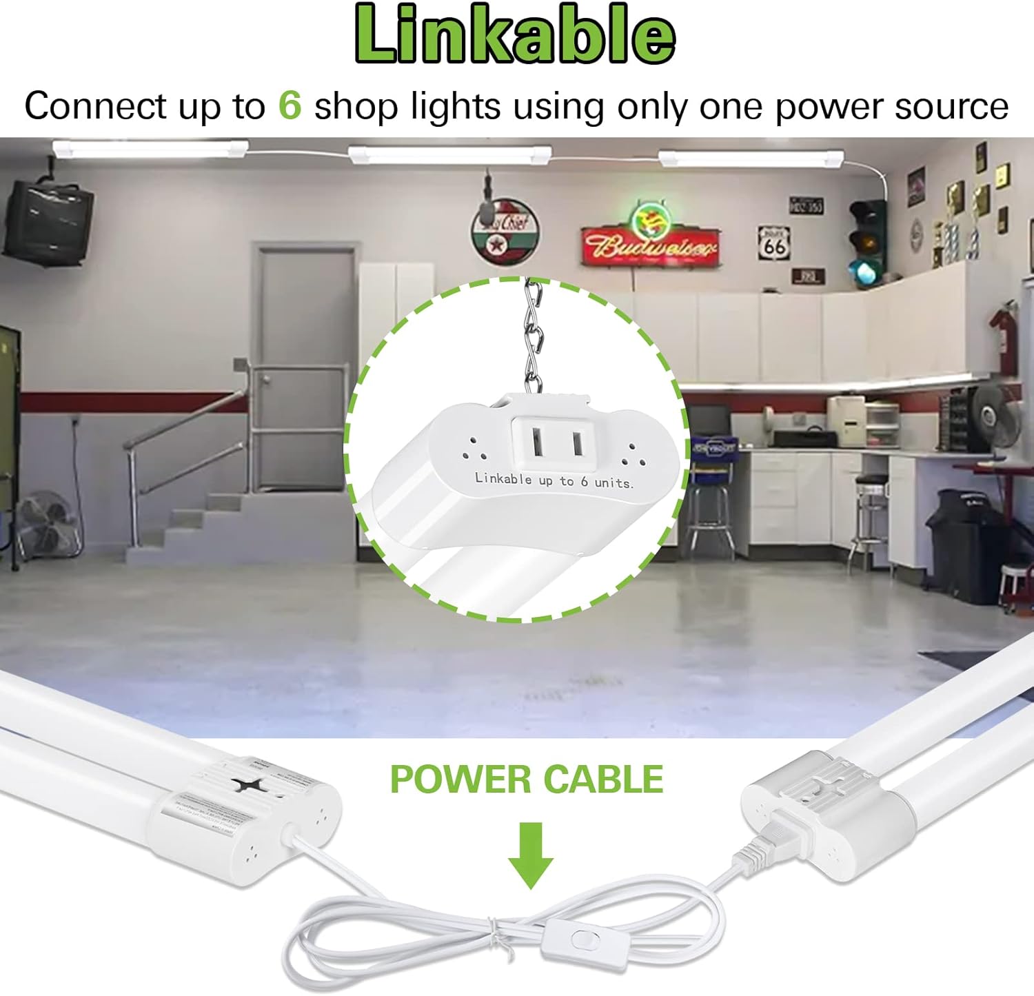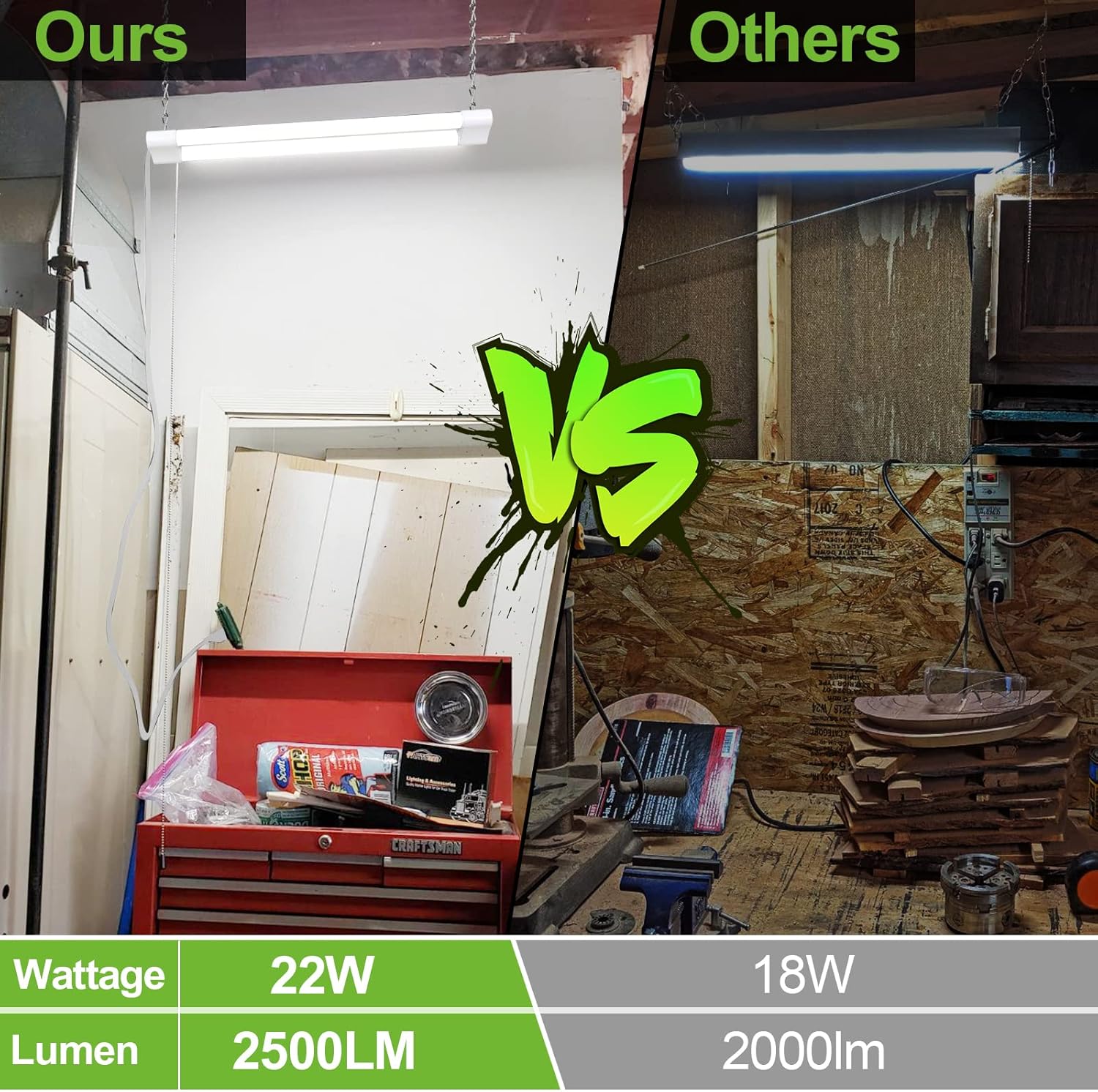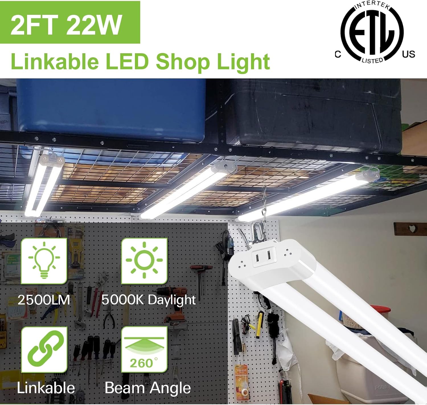 About this itemn? Super Bright – Our 2ft utility light fixture feature 2500 lumens brightness at 5000K Daylight White by using only 22W. That is a staggering LED Efficiency of 115 lm/w! Excellent replacement of conventional fluorescent fixture. Energy Savings of up to 75%.n? High Quality – ETL certified for better quality, safety and reliability. Turns on instantaneously, no more waiting. This long-lasting LED shop light provides up to 50,000 hours of light before any maintenance is required.n? Linkable – 2ft led shop light use plug connection to connect up to 6 pcs together in your garages, workshops, workbench areas, storage areas, basements, equipment rooms, etc.n? Easy Installation – Plug & Play. Come with 59