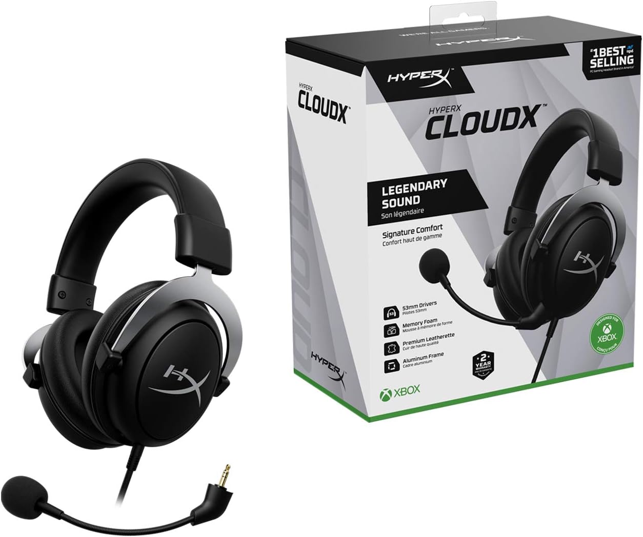 About this itemnOfficial Xbox Licensed Headset: The HyperX CloudX is a wired over-ear gaming headset designed and tested to work seamlessly with Xbox controllers featuring a 3.5mm headphone jack.nSignature HyperX Comfort: Engineered with a durable aluminum frame and plush memory foam ear cups, the CloudX ensures lasting comfort during extended gaming sessions.nDetachable Noise-Cancelling Mic: The flexible, detachable microphone allows you to conveniently toggle between voice chat and immersive game audio.nImmersive Audio Experience: With enhanced bass reproduction and crystal-clear highs and mids, the CloudX delivers an immersive in-game audio experience.