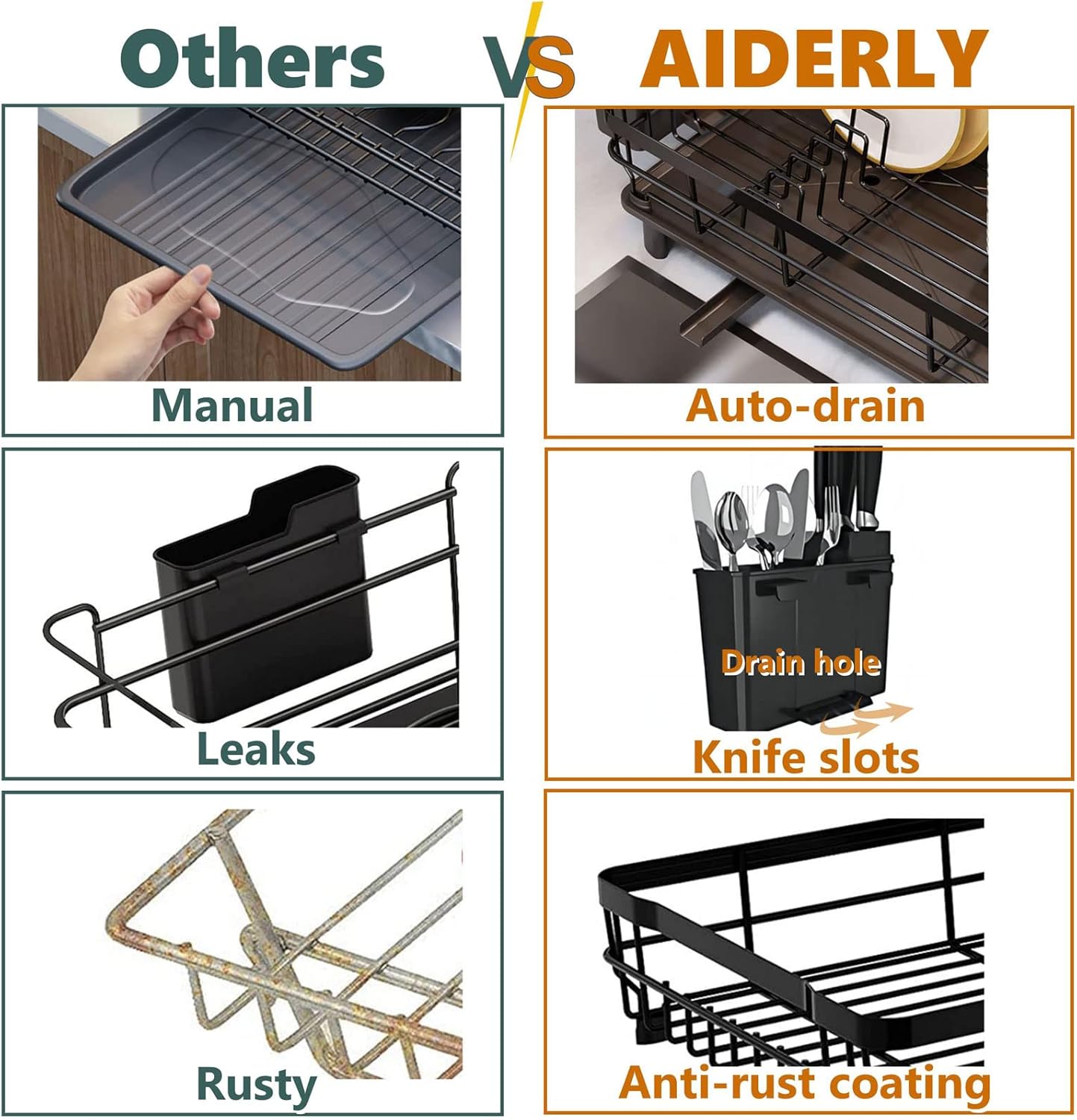 About this itemnDrain Directly into the Sink: You can move it up to the sink with the spout extended so that no more water on the countertop while you are washing or putting items innSave Space: It takes up minimal counter space, you can do all the dishes in one sweep instead of stopping halfway to dry and make room for morenEasy to Assemble: Packed with racks, water collector tray, utensil holder, knife slot, and drainage board feet, only took 5 minutes or less to get it all put together, no extra tools needednSuited to Smaller Households: It suffices for a quick washing and draining of breakfast, lunch or dinner plates, cups, spoons, forks, knives, and bowls for family of threenSturdy and Convenient: Dimensions 16.9