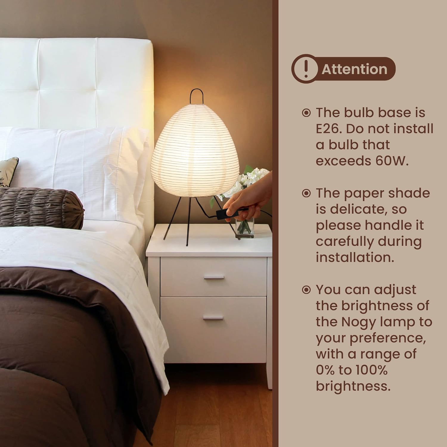 About this itemnEASY ASSEMBLY WITH NO TOOLS: Don’t you hate hard to assemble a paper desk lamp? This lamp is assembled quickly and easily, and is a perfect paper lamp size for bedrooms and dorm rooms. Use a table paper lamp one on each side of your bed for easy reading. Dimmable switch, which increases the flexibility of the style lamp and is convenient and simple.nELEGANT DESIGN High-quality paper shade, this unique rice paper desk lamp is a sleek addition to any small apartment, bedroom or dorm room.nLONG LIFESPAN & ENERGY SAVING TABLE PAPER LAMP: This modern unique paper shade lamp is easy to replace the bulb at any time. The advanced lighting paper lamp design will make the lamp endure and last long for years, help save much money on electricity bill than standard halogen floor lamp or other traditional incandescent light fixtures.nELEGANT JAPANESE DESIGN: Enhance your home with a touch of Zen with this Nogy paper lamp, perfect as a table lamp with its warm 2700K white light, adding a peaceful ambiance to any room.nQUALITY AND CONVENIENCE: Made with durable washi paper and a sturdy metal base, this lamp is not only eye-catching but also includes a dimmable feature to adjust lighting to your mood, measuring 11