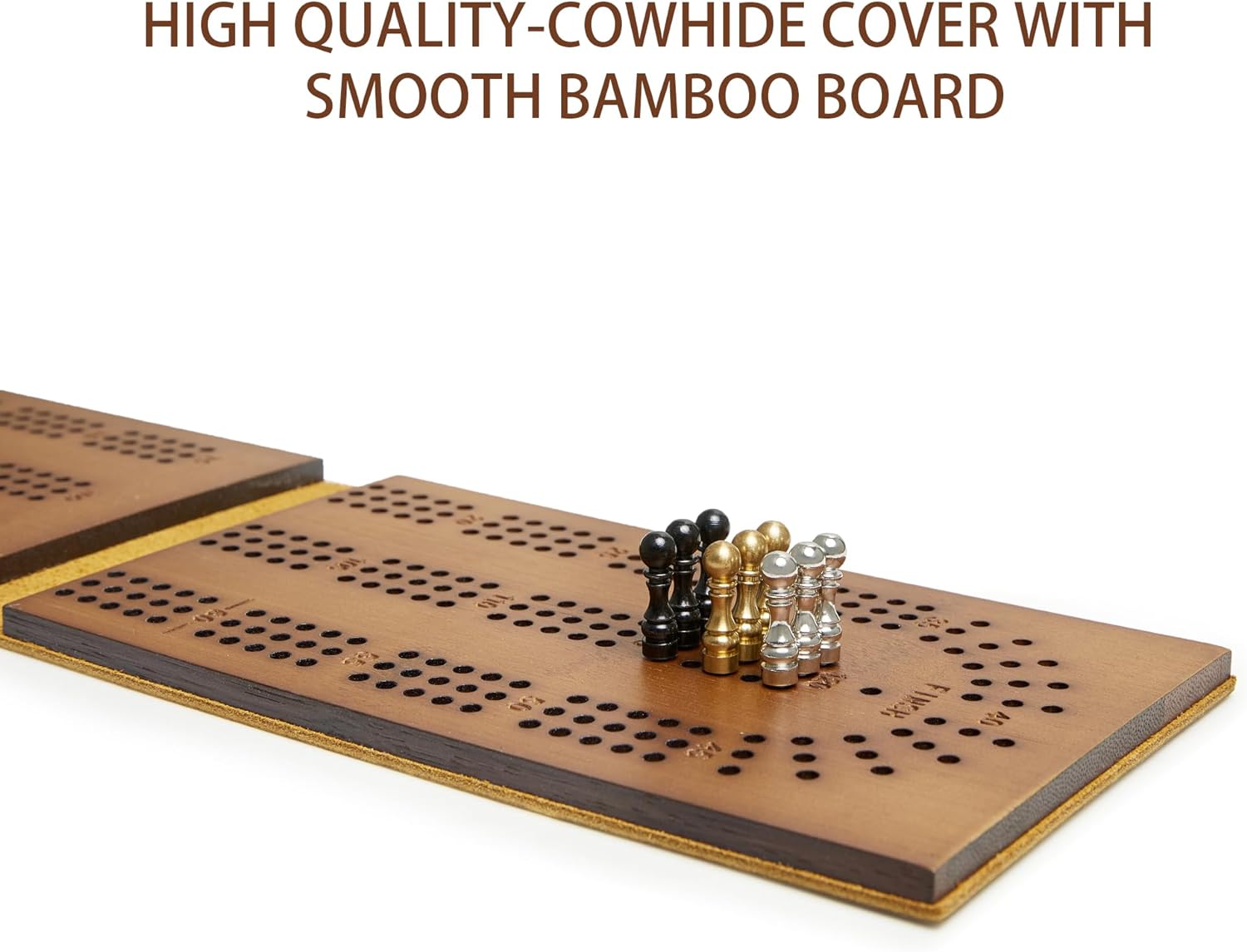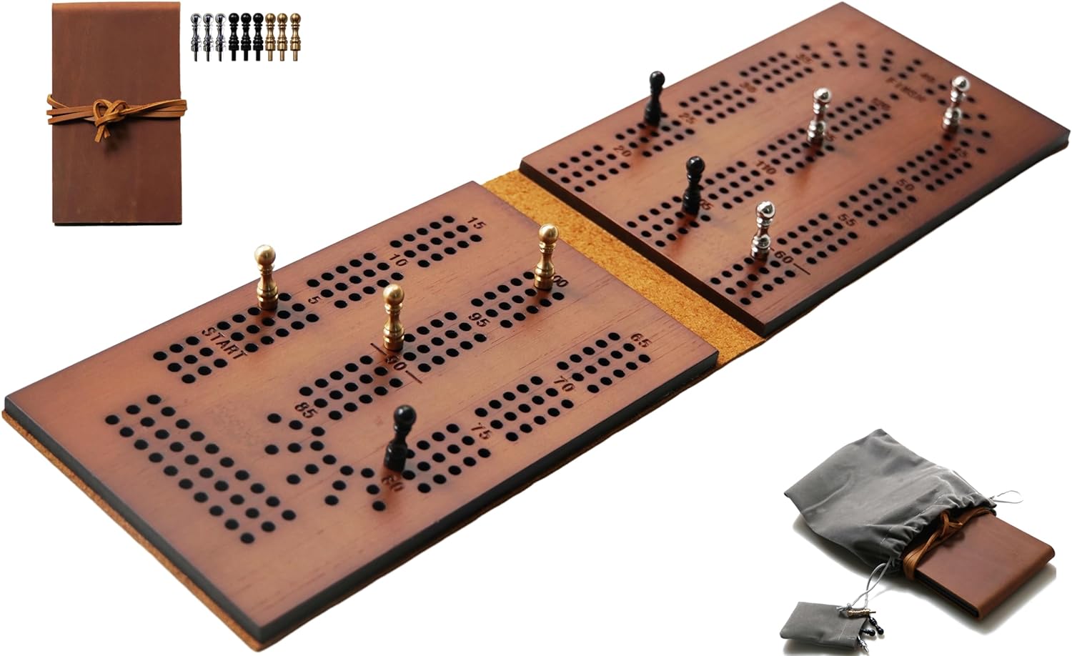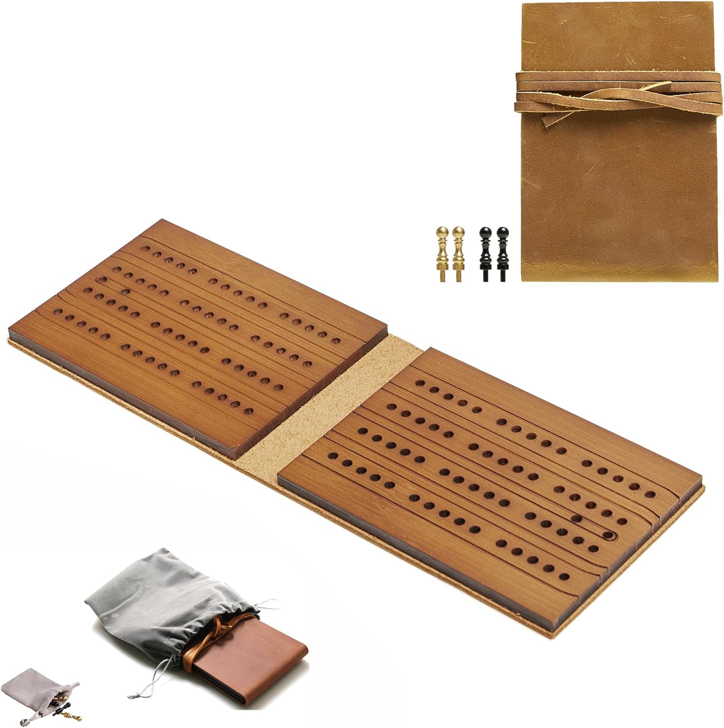 TRAVEL CRIBBAGE BOARDS – Pocket Size, Great Little travel Game Board, Fits into a Pocket for Convenient Travel Play, Easy-Carrying Bag included for Storage and CarrynCRIBBAGE BOARDS SIZE – Closed Size in 16.5x9x1.5(cm), Open Size in 32cmx9cmx0.7cm, small enough to be portable and lightweight but large enough to be legible and substantial in the handnHIGH QUALITY – Cowhide Leather Cover with Leather Board, Great for self-use and Perfect Gift for your friendnCOPPER CRIBBAGE PEGS INCLUDED – 9 pcs Brass Pegs Included (3 in 3 colors) the 120-points laser-engraved Bamboo board comes complete with 9 pegs for 3 players.nLIFETIME GUARANTEE – We offer you a lifetime guarantee and pursue 100% satisfaction from you
