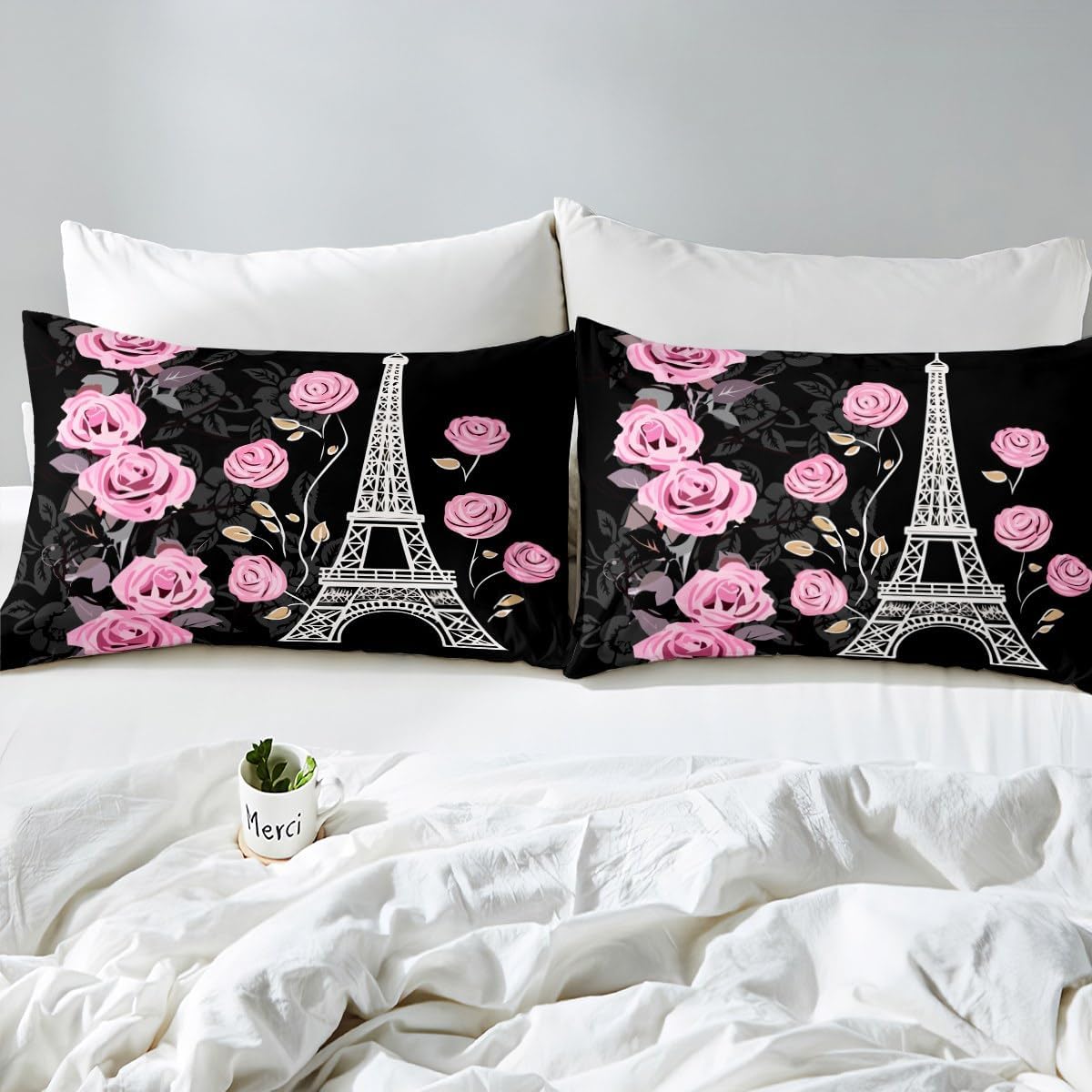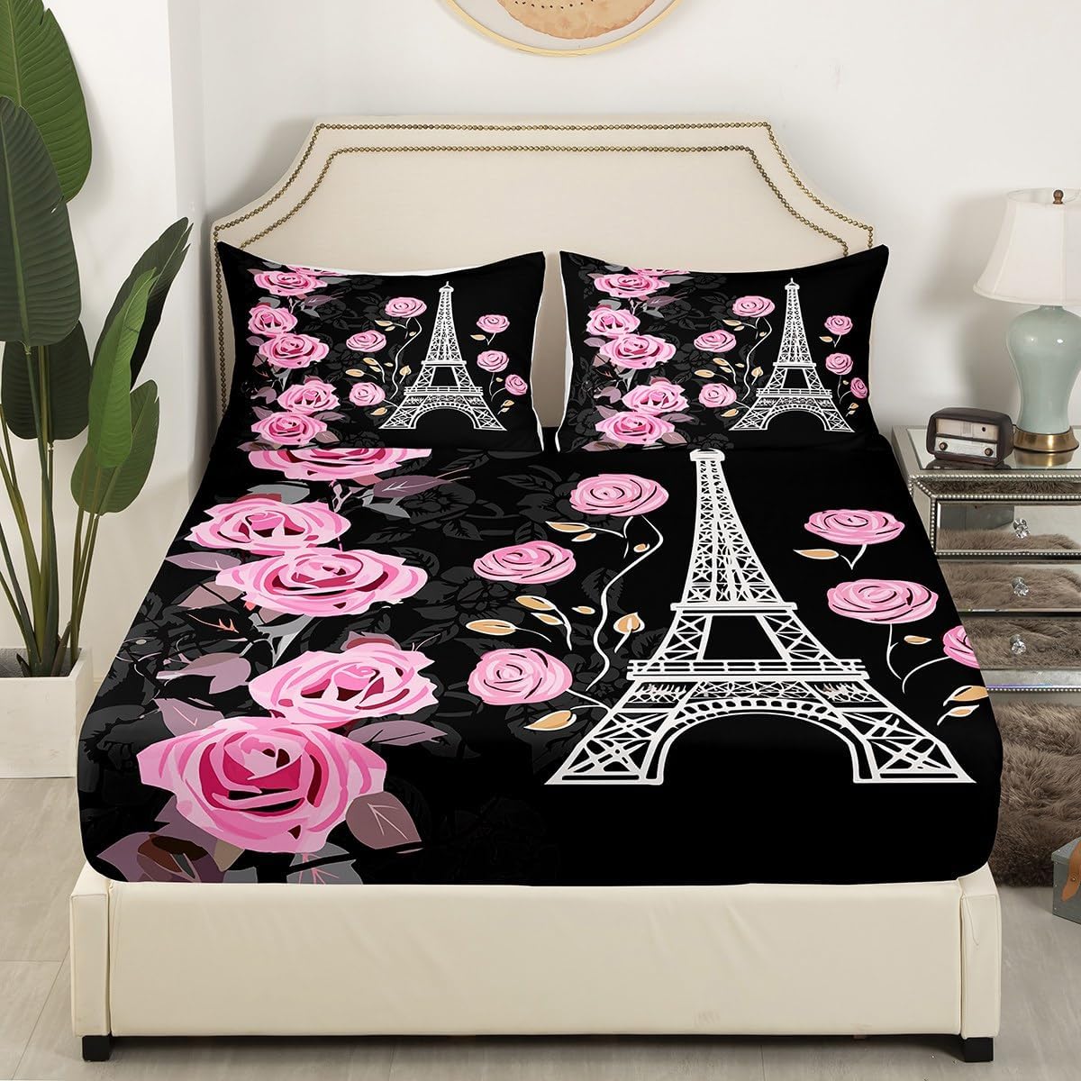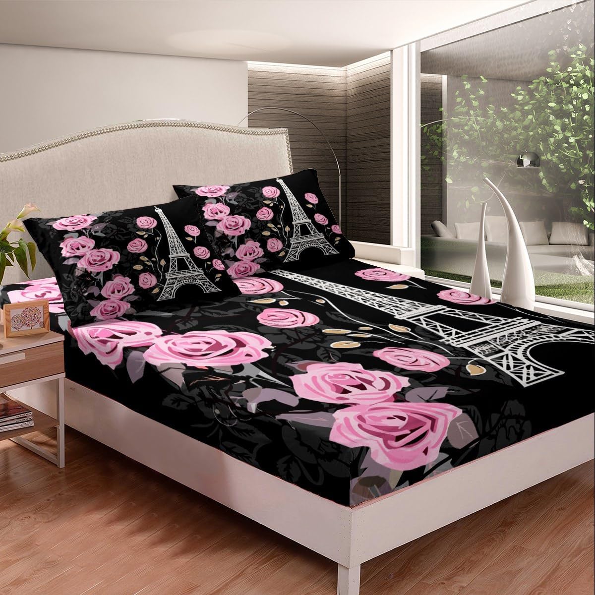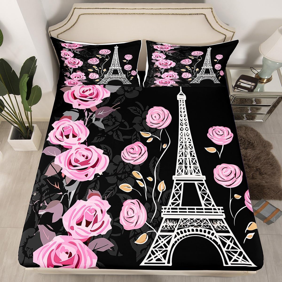 jejeloiu Eiffel Tower Sheet Set Queen Size Couple Pink Paris Rose Floral Sheets with Deep Pocket Fitted Sheet for Lover Romantic Floral Flowers Botanical Bed Sheets Set Valentine’s Day Bedding Set