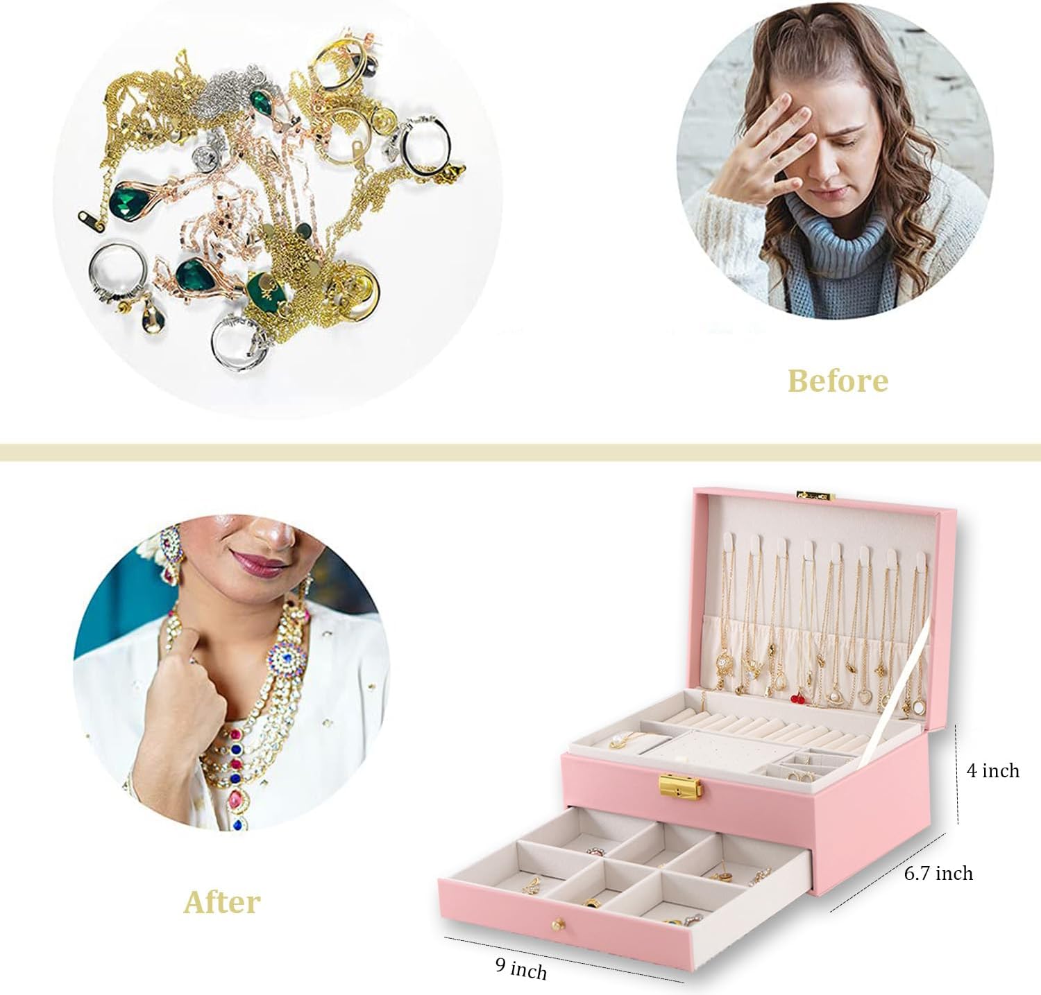 Jewelry Organizer Box for Women – Large PU Leather Jewelry Organizer Storage Case with Two Layers Display for Earrings Bracelets Rings Watches (Pink)