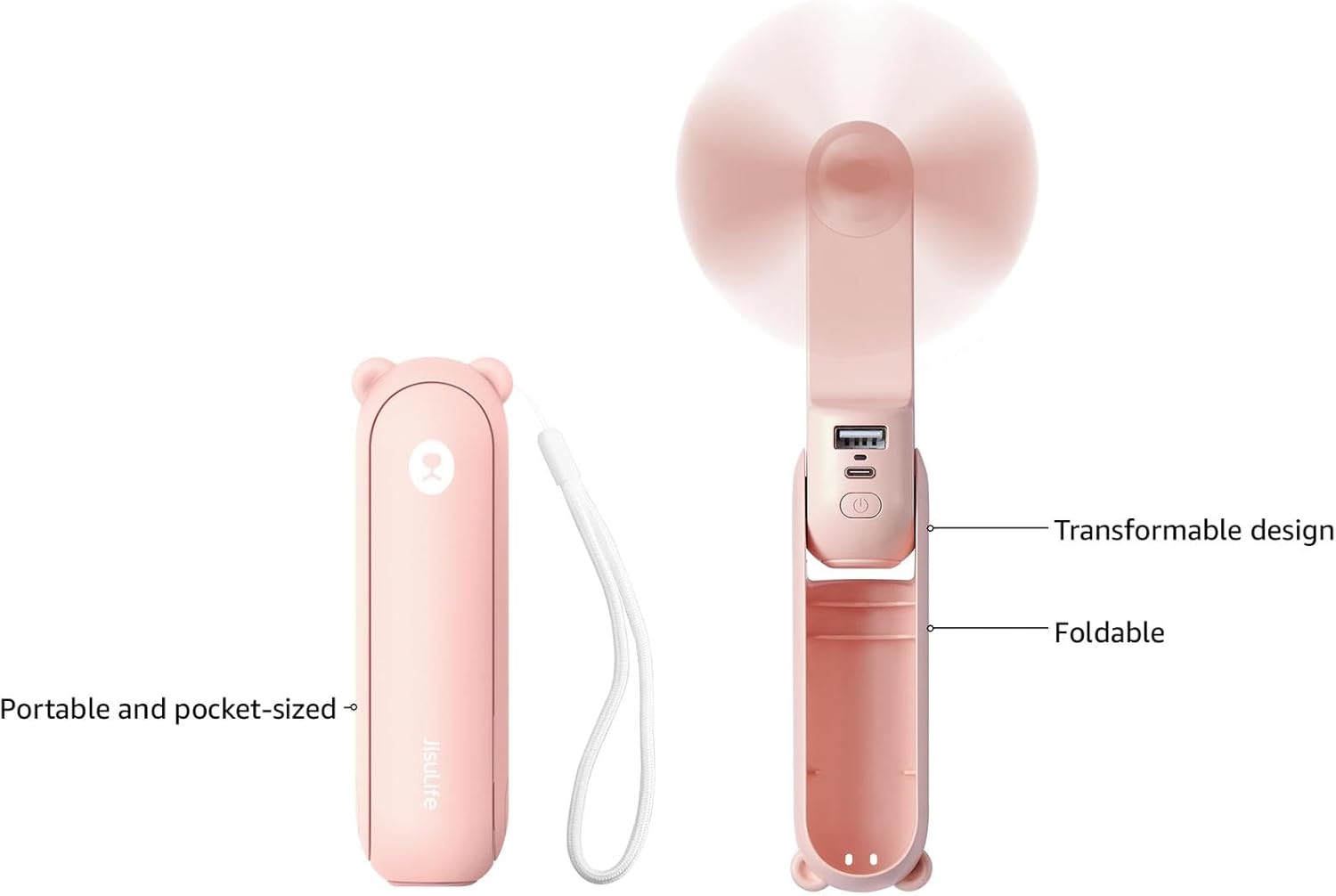 About this itemnSmall In Size, Big On Function: Featuring a Fan, Flashlight, and Backup Power Bank, the JISULIFE pocket bear fan is your summer go-to essential for staying cool on hot days while offering versatile functionality to meet your diverse needsn12-19 Hours Cooling Time: With up to 19 hours of cooling time on a single charge, this mini handheld fan ensures you stay refreshed during travel, concerts, and outdoor adventures; Conveniently rechargeable via USBnA Palm-sized Backup Charger: Designed with a pocket size, this portable fan easily fits into any bag for on-the-go convenience; Doubling as a backup power bank, it keeps your devices charged when needed, making it your travel and summer essentialsnAlso A Flashlight: Designed with a flashlight function, You may not look for a flashlight first but you will find that this is quite helpful when going out for a walk at nightn3-Stage Transformable Fan: 3-stage transformable design allows for easy storage with hidden blades, making it compact enough to carry in your pocket; Use it as a handheld fan at 180° fold or as a desktop fan at 270° fold for added versatilitynYour Travel Essentials: 3 IN 1 Mini fan would be a partner for travel; concert; makeup; eyelash; commute; wedding; camping; office; school; It is also a halloween/Thanksgivings/white elephant/ Christmas gifts/stocking stuffer for women; girl; kids; grandma; friends