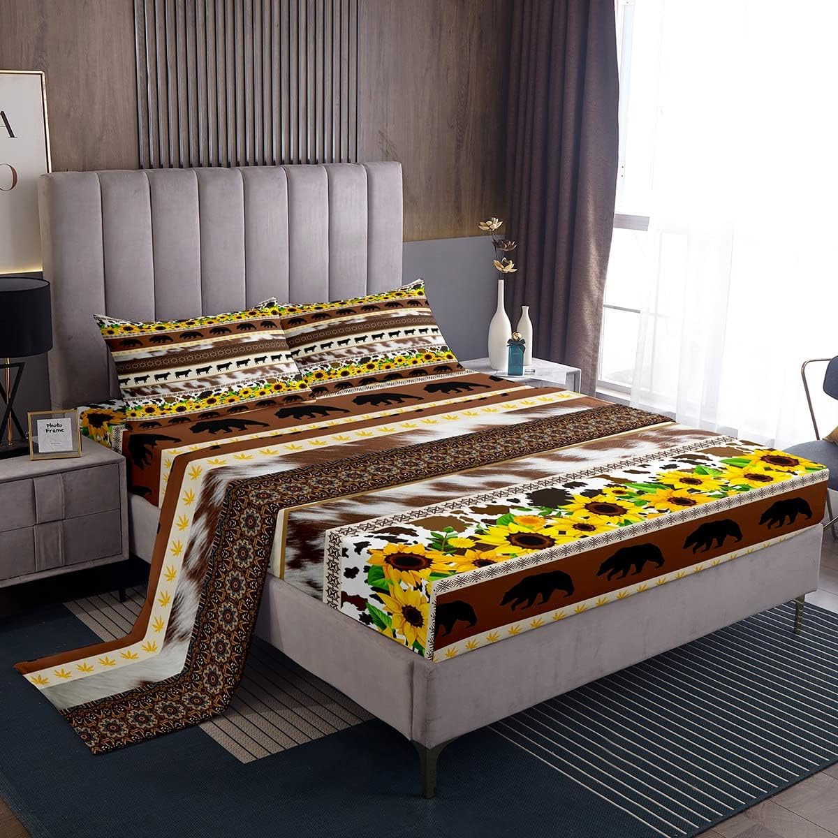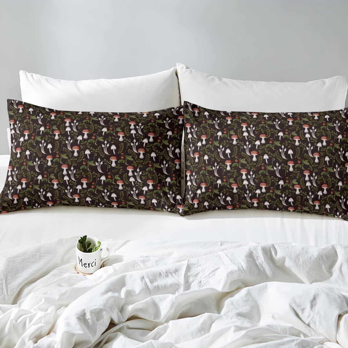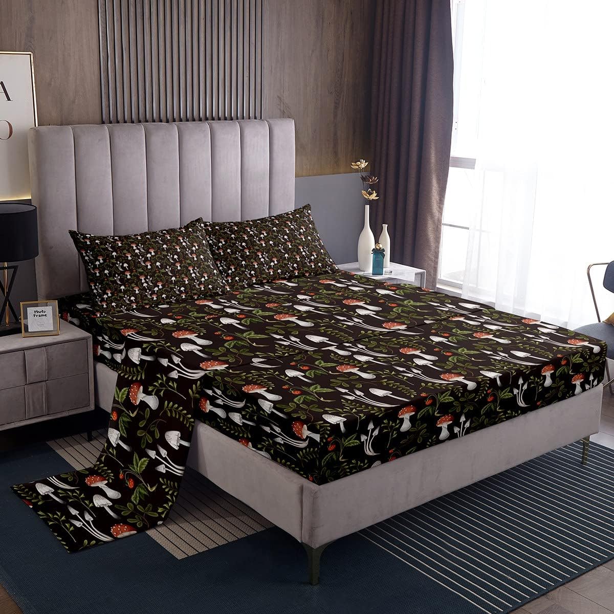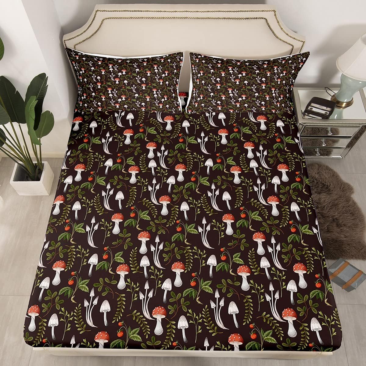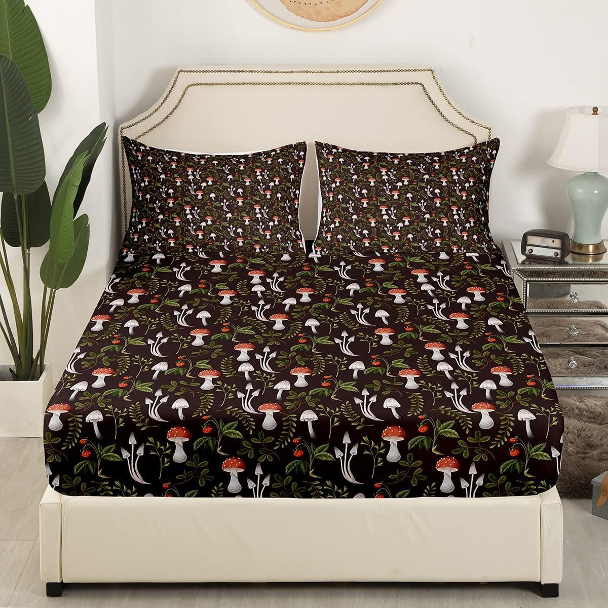 Jungle Mushroom Bed Sheet Set King Size Farmhouse Style Rustic Plants Herbs Bedding Set for Bedroom Strawberry Trippy Mushrooms Bedding (1 Fitted,1 Flat,2 Pillowcases) Microfiber Fitted Sheet