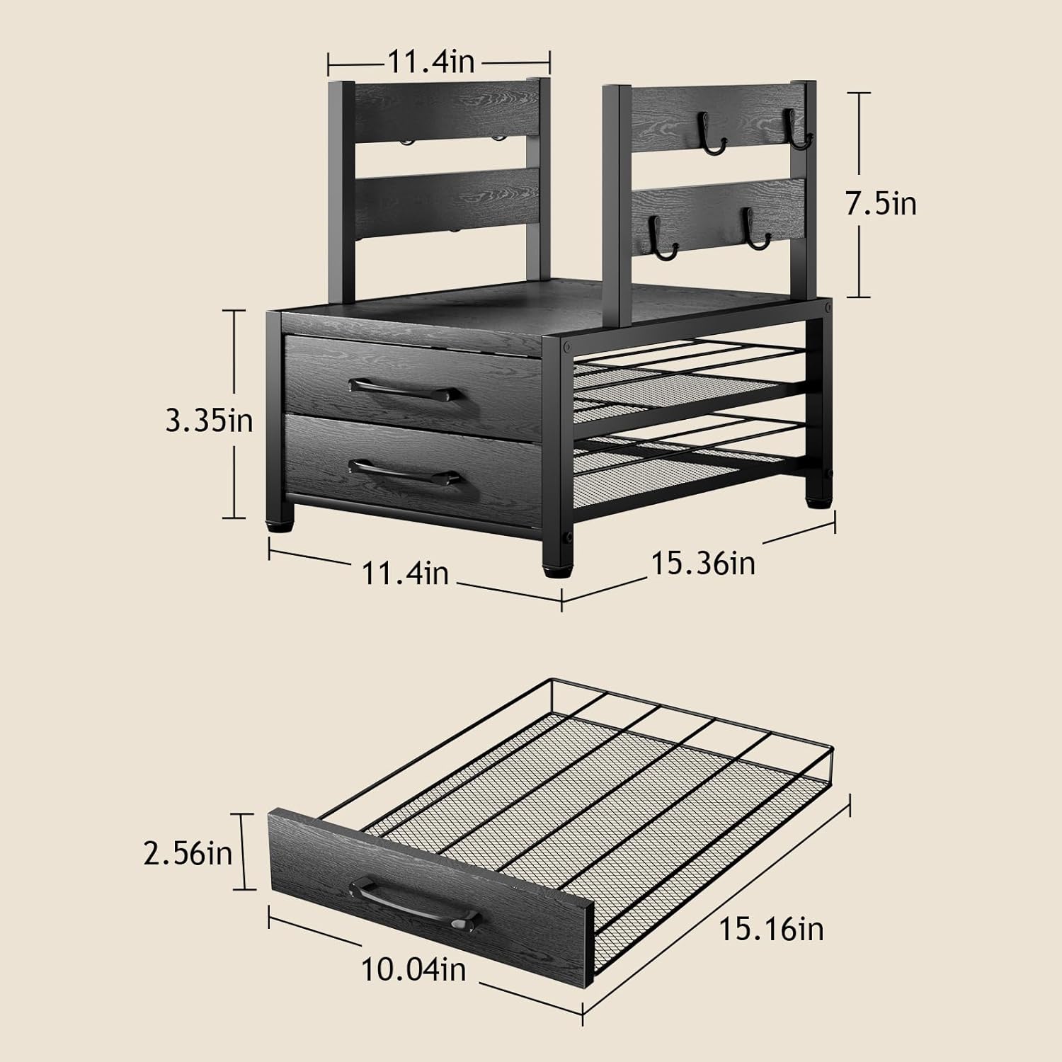 About this itemn?Two K-Cup Storage Organizer Drawers ?: The Coffee Pod Storage Drawer is compatible with K-Cups and can hold up to 70 of your favorite pods, allowing you to neatly organize your coffee and easily find them according to your taste, brand, or mood.n?Side Mug Storage Space?: With 8 mug holders on the side of the coffee pod organizer, it fully meets a family’s needs. The holders are lined to fit most mugs and are spaced properly for convenient coffee cup storage.n?Rustic and Sturdy Design?: The coffee pod holder’s wooden top firmly supports your coffee maker or brewer, ensuring durability and preventing deformation. The stylish rustic-style K-cup holder seamlessly blends into your office setting and kitchen decor, enhancing your space.n?Space & Time Saving?: Find the flavors you need to make the coffee you want in a perfectly simple and organized way, saving you precious morning time. This convenient home coffee pod storage takes up minimal counter space.n?Easy to Clean?: Don’t let spills or stains get in the way! Coffee stations can get messy, but the Homsorout coffee organizer can be easily cleaned with just a few wipes. Both the exterior and inside drawer can be effortlessly wiped with a cloth or paper towel.n?Wide Compatibility?: The large wooden top provides sufficient space to store your coffee maker and other coffee accessories. It is compatible with all Keurig Classic and Plus series coffee makers. Note: Leave enough space between the coffee machine and cabinets.n?Easy to Assemble & Use?: The K-cup organizer holder comes with detailed instructions, clearly labeled parts, and necessary tools, making assembly easy and labor-saving. The four non-slip pads ensure stability and prevent scratching the counter surface.nShow more