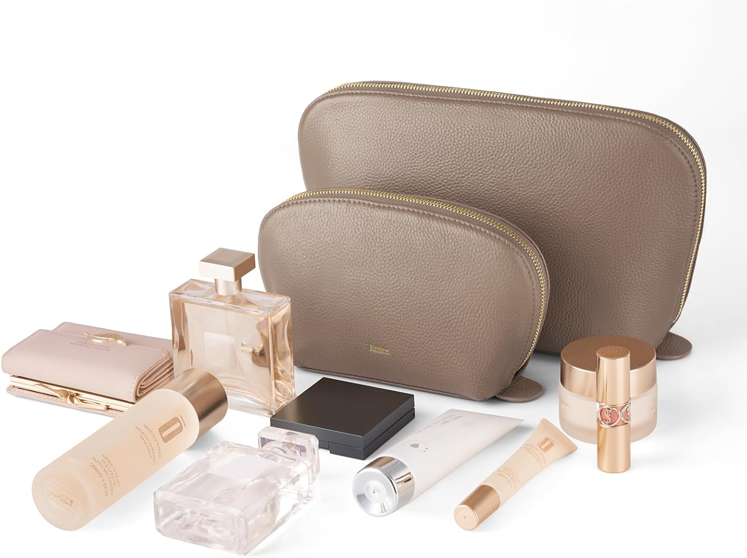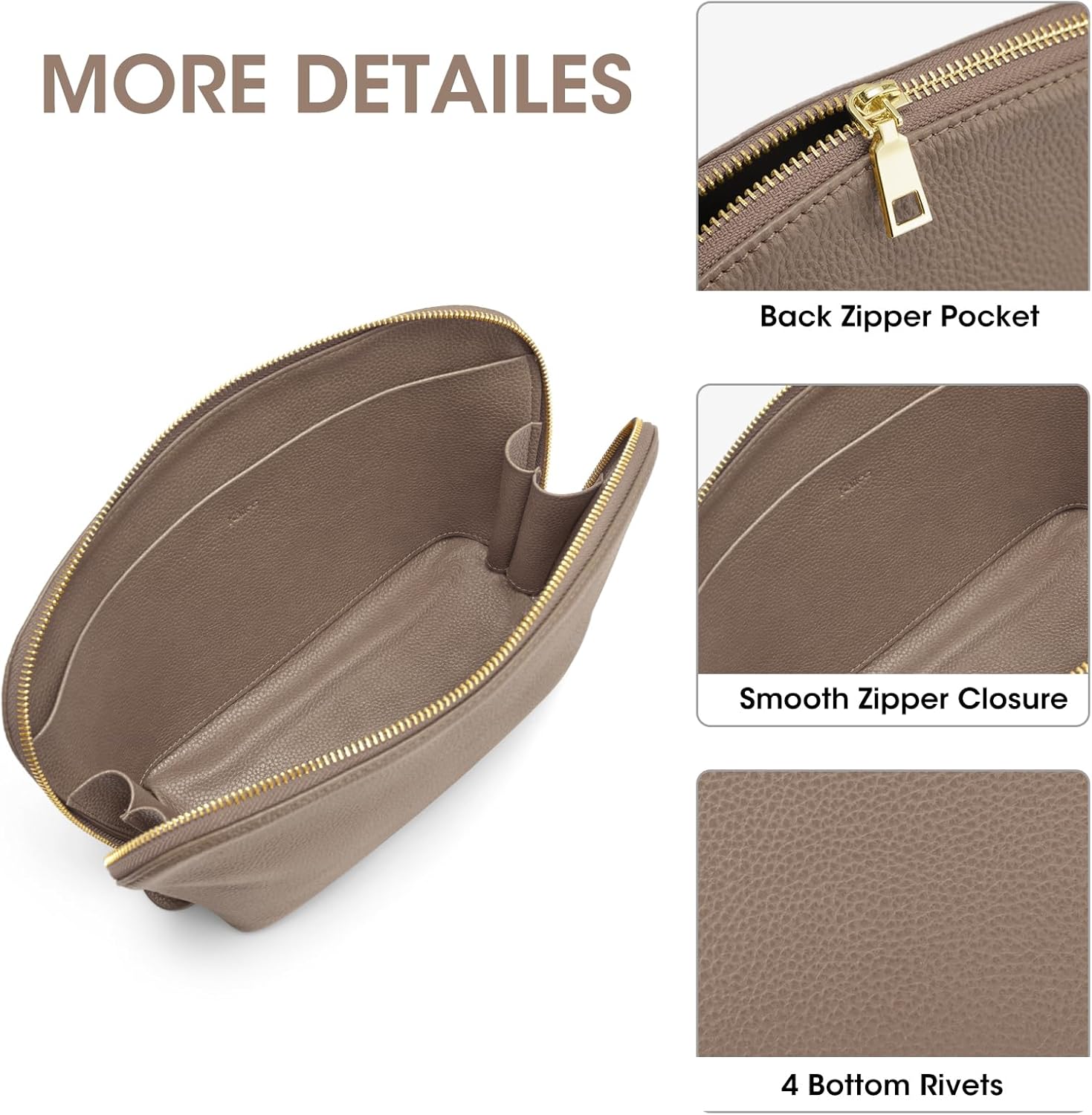 The Elites series showcases our commitment to quality and craftsmanship. Each bag, made from premium Top Grain Pebbled Cowhide Leather with gold-tone hardware and strong stitching, ensures durability and minimalist elegancenMeasuring 8.7 (L) x 3.0 (W) x 5.1 (H) inches for the medium makeup bag and 12.2 (L) x 3.9 (W) x 7.1 (H) inches for the large makeup bag, these bags feature one main compartment and one slot pocket. The leather lining is easy to wipe clean, ensuring convenience and elegancenThe leather makeup bag is the ultimate accessory for any occasion. It can also serve as a toiletry bag, clutch, or tote organizer, ensuring you always step out in style. A must-have addition to every fashion-forward woman’s collectionnSearching for the ideal gift? The designer leather makeup bags are perfect for Christmas, birthdays, anniversaries, or any special event. Delight your loved ones with a present that embodies style, quality, and functionalitynWe stand by the quality of our Elites series bags with a 1-year warranty. If you have any questions or are not satisfied with our products or services, please reach out to us via email for assistance