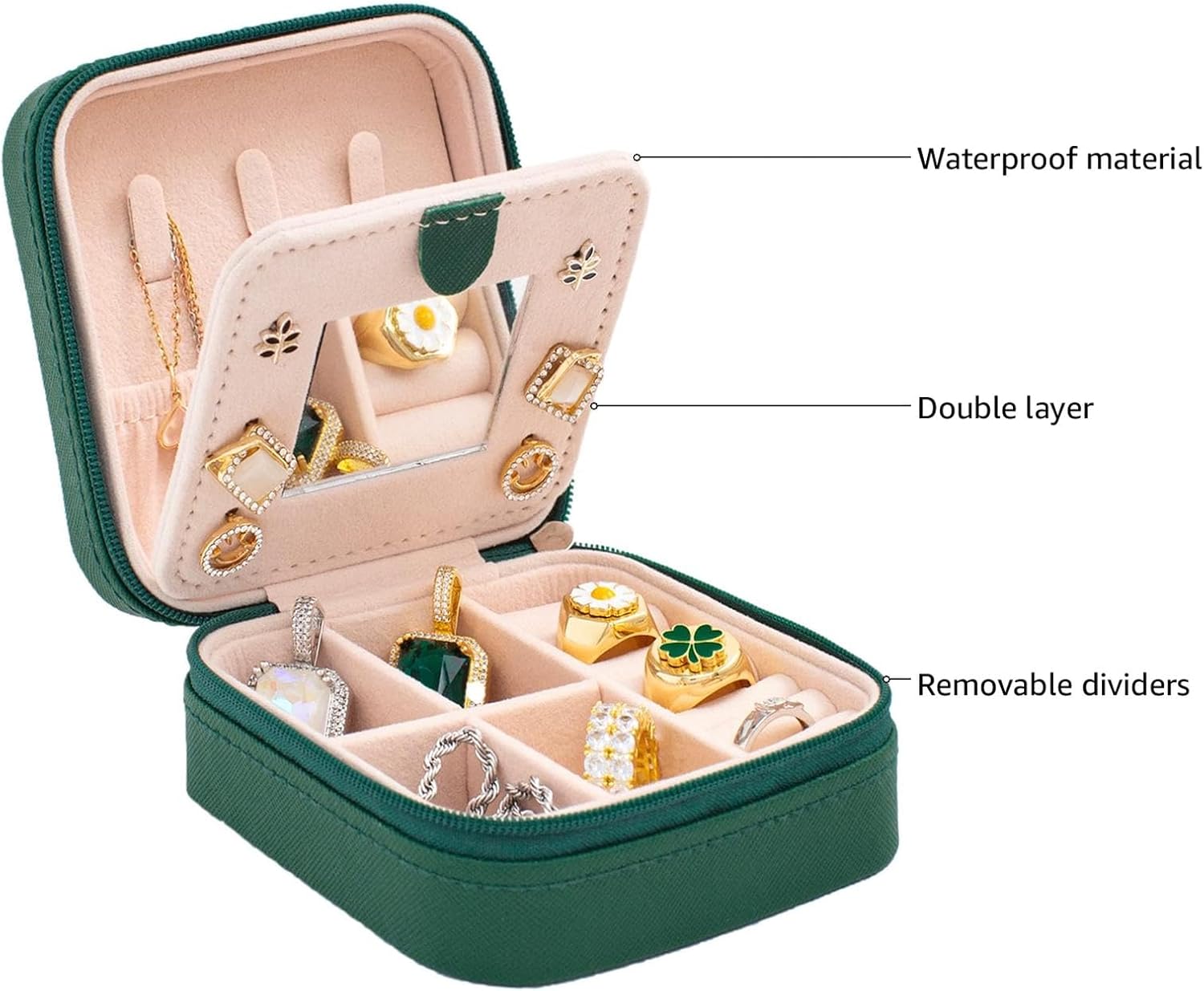 About this itemn[Portable and Compact] Multi-functional Travel Jewelry Storage Box can be put into handbag easily.Jewelry can be put in orderly and will not be entangled. The compact body is very suitable for daily use and traveling.n[All-IN-ONE Place] This jewelry organizer box includes 6 ring rolls, 3 necklace hooks,1 mini vanity mirror and 4 divided compartments to protect your precious pieces.n[Multi-functional]Two removable dividers to meet different needs.The built-in mirror is convenient for you to wear jewelry, and it is also suitable for makeup.n[Travel jewelry case]The appearance of waterproof pu leather has a comfortable touch. The velvet interior can protect your precious jewelry from abrasion.n[Travel jewelry box]:Packaged in a elegant gift box.Available in a variety of colors.