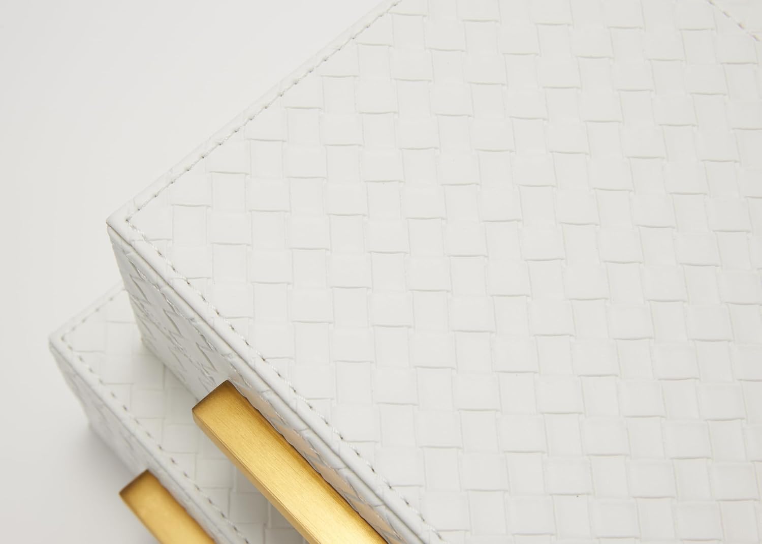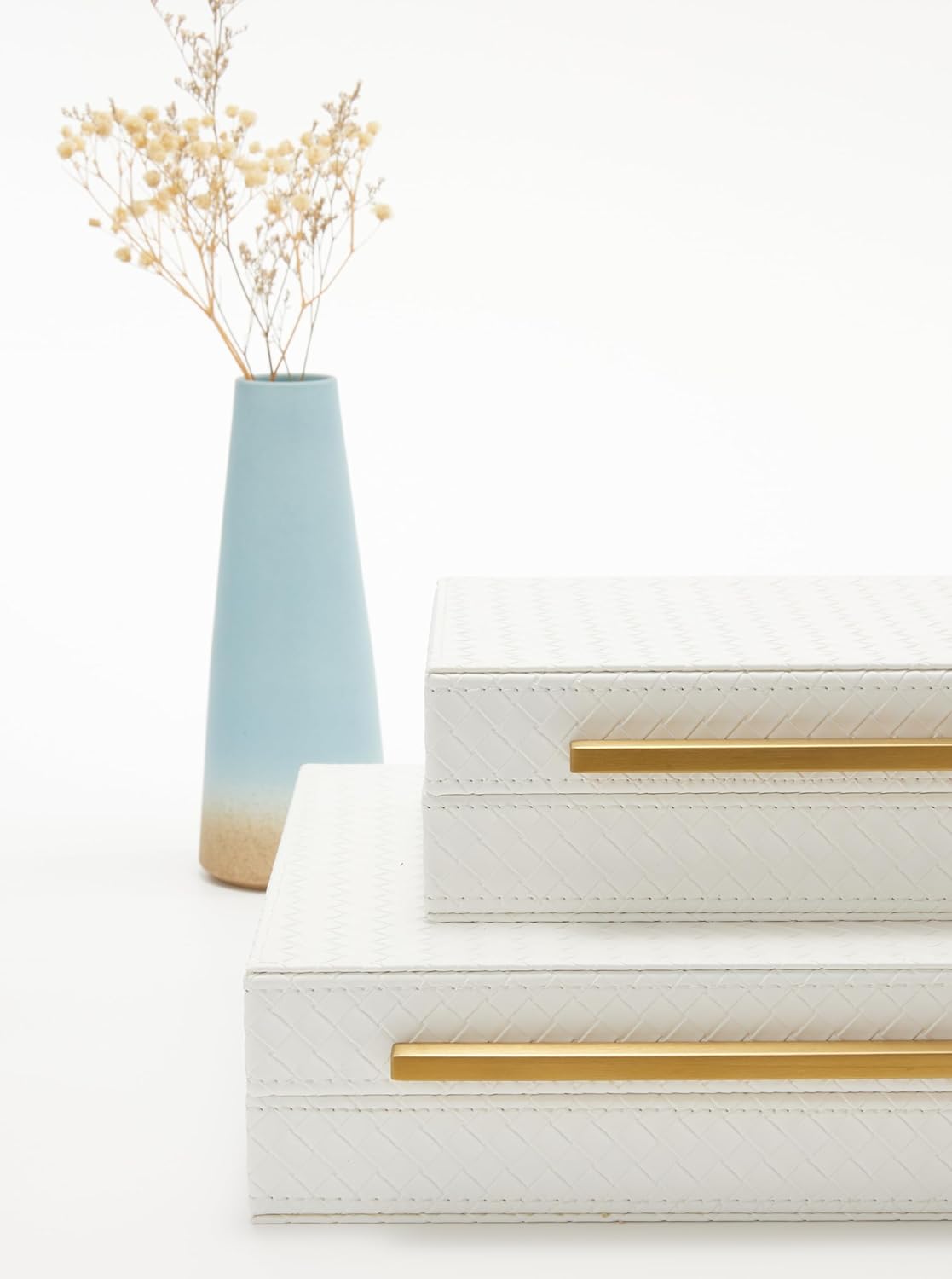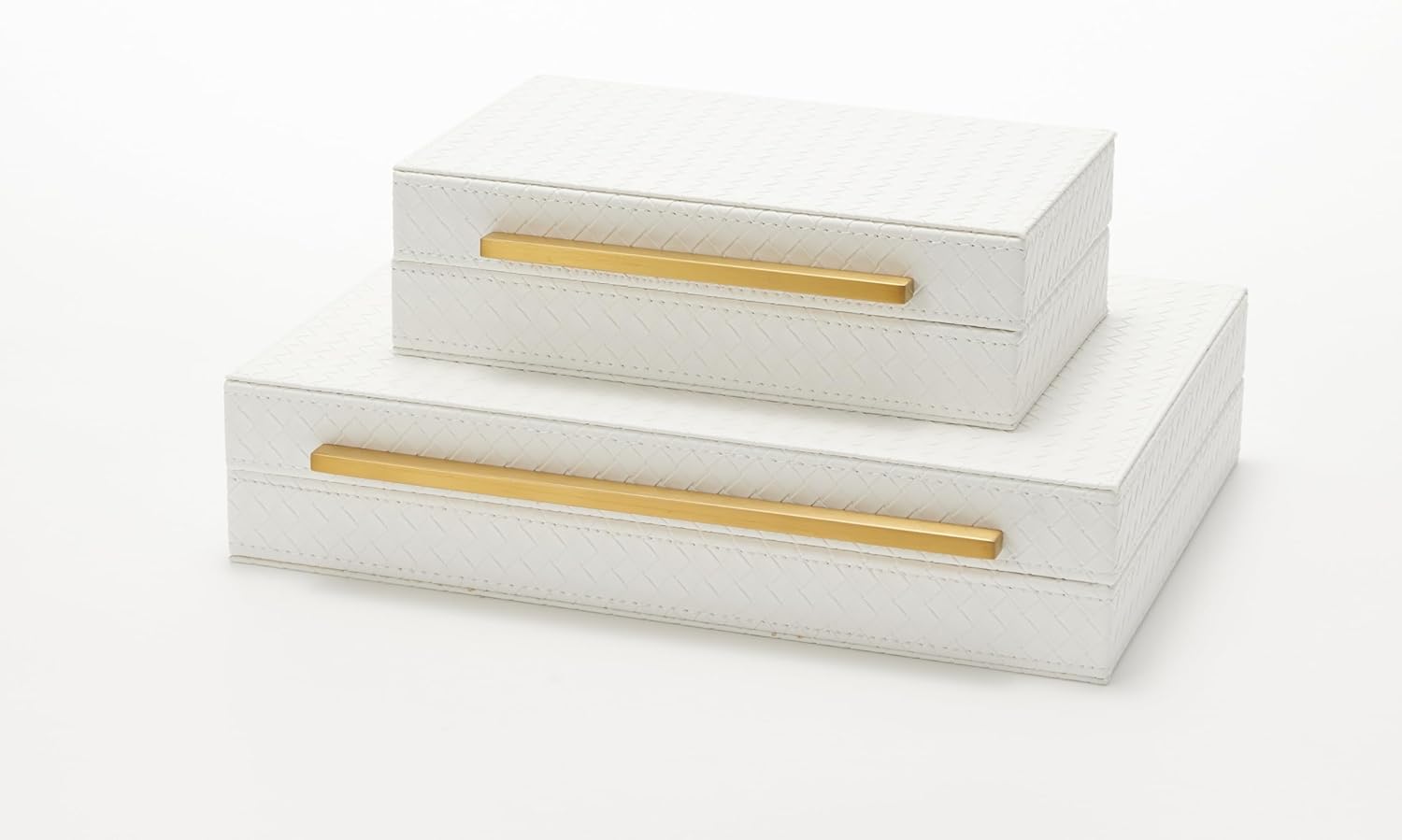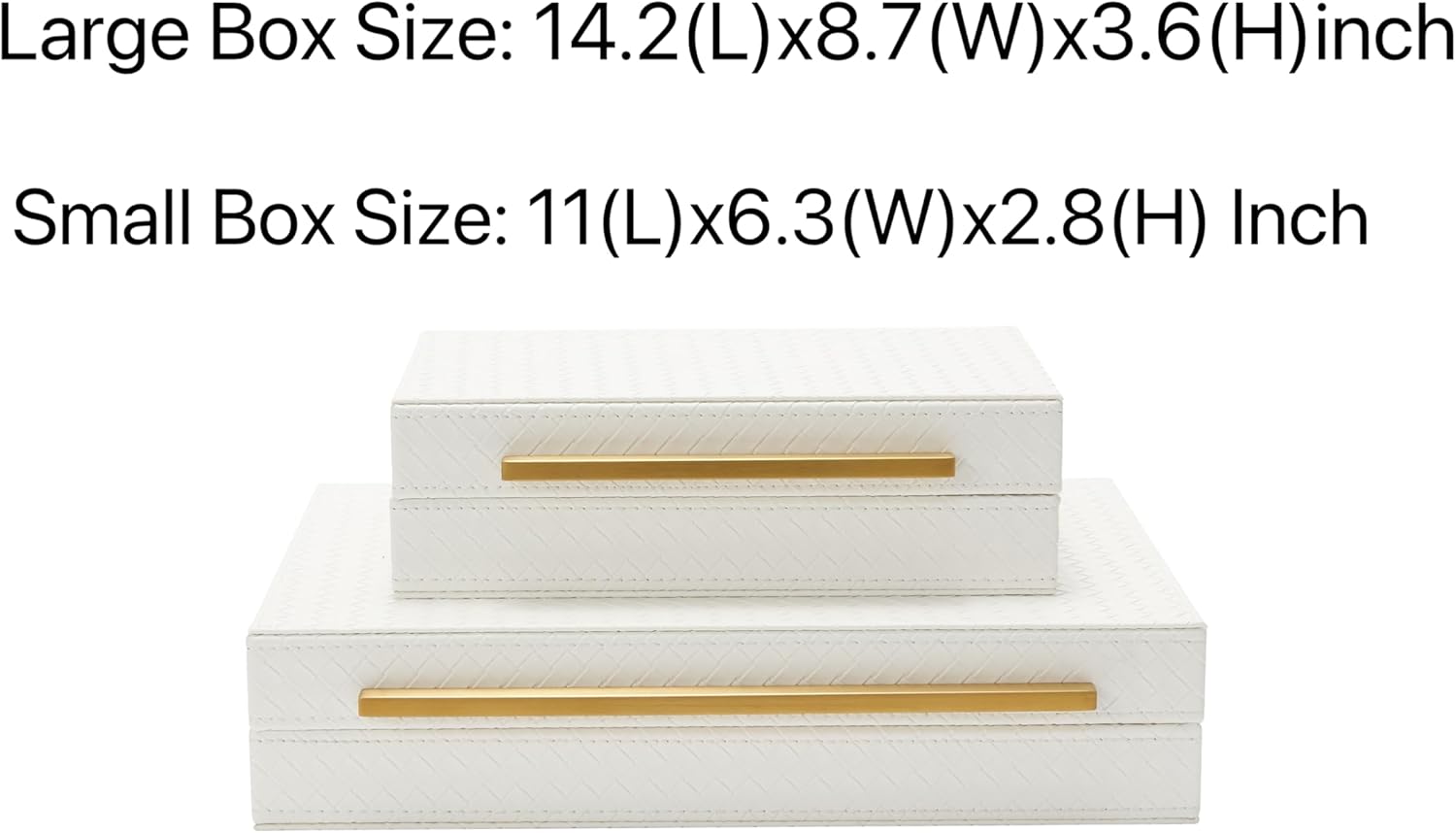 About this itemnStylish and Elegant Design ! This eye-catching decorative box boasts and elegant blend of white and gold, a unique brushed gold metal handle for effortless opening and closing. It is Beautiful and Modern home decor wherever you put it on the coffee table, side table, console table, night stand, shelf, book case, barthroom.2pcs of pack can be stacked piece by piece on your book shelf or console table or any other placed your liked.nMultipurposed Storage Box: This storage box is used for many different purposes such as decorative box, shelf organizer box, storage box, keepsake and memory box, photos box, jewelry box, desk accessory organizer, Women and men’s accessory box.nStrong and Protective! With a robust MDF frame and smooth suede lining, the home organizer box offers good protection for all of your cherished accessories such as remotes, glasses, wathces, stationery, keys, , shielding them from dust and scratches and it also helps to classify your make-up perfume, watches, keys, soap, sunglasses,remote control, charger, necktie,socks, underwear to make your home tidy and nicelynIdeal Gift: The lovely box is wonderful gift for your loveed ones on special occasions such as birthdays, anniversaries, thanksgiving,Chirtmas.nLarge rectangular shaped stoages- The size for large box: 14.2*8.6*3.5 inch, the size for small box: 11*6.3*2.8 inch.n See more product details
