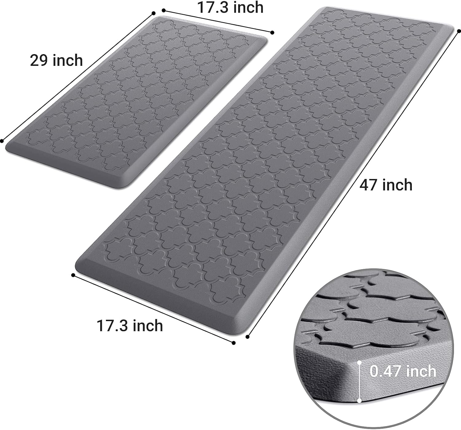 About this itemnANTI-FATIGUE: the anti fatigue kitchen mats are ergonomically engineered to provide greater comfort; for people who stand for long periods of time, to help posture and relieve back pain, and to ensure that you are able to stand comfortably while workingnPERFECT SIZE AND SAFE MATERIAL: the kitchen mat set contains 2 kitchen mats may be used separately or in combination to meet different needs; the kitchen rugs and mats made of premium PVC and thick foam, are built for long-lasting durabilitynWATERPROOF AND EASY CARE: the kitchen floor mat are easily cleaned when water, stains, or oil splashes on the mat; wipe off the dirt with a damp cloth or hand-held vacuum as needed; This care routine saves time and ensures standing mat will last for yearsnANTI-SLIP: the kitchen rugs and mats is designed with a unique beveled edge; The top of the rugs for kitchen floor are designed with an embossed texture while the bottom is made of non-slip material so that the kitchen carpet does not move aroundnVERSATILE: the standing pad provides extra large surface area for standing in laundry room, kitchen, office, farmhouse, or in front of sink or any other high-traffic indoor or outdoor spacenNOTE: open kitchen carpet fully place on even, flat, dry floor; Water under mat may result in slippage; mat must be placed on dry surface during use