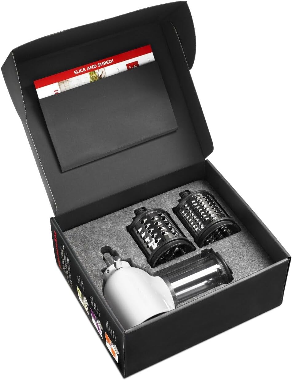 About this itemnGenuine KitchenAid Stand Mixer Attachment – Designed and engineered by the manufacturers of the KitchenAid Stand Mixer, sold separatelynCompatible with any KitchenAid Stand Mixer. Transform your stand mixer into a versatile kitchen appliance that can help you tackle even more culinary tasks.nBlades Included – 3mm Slicing Blade great for cucumbers, carrots, celery and zucchini; 4mm Medium Shredding Blade great for cheeses and firm vegetables, such as carrots, to a finer consistency; 6mm Coarse Shredding Blade great for shredding cabbages, potatoes and more.nSlice or shred into any size bowl for just the amount you need.nIdeal Slicing Performance, with the 2-in-1 Food Pusher for both large and small diameter fruits and vegetables – from cucumbers to celery.nThe attachment and included accessories pack organize inside a convenient storage case for easy access and simple storage.nAll blades are dishwasher safe on the top rack for easy clean up.