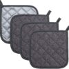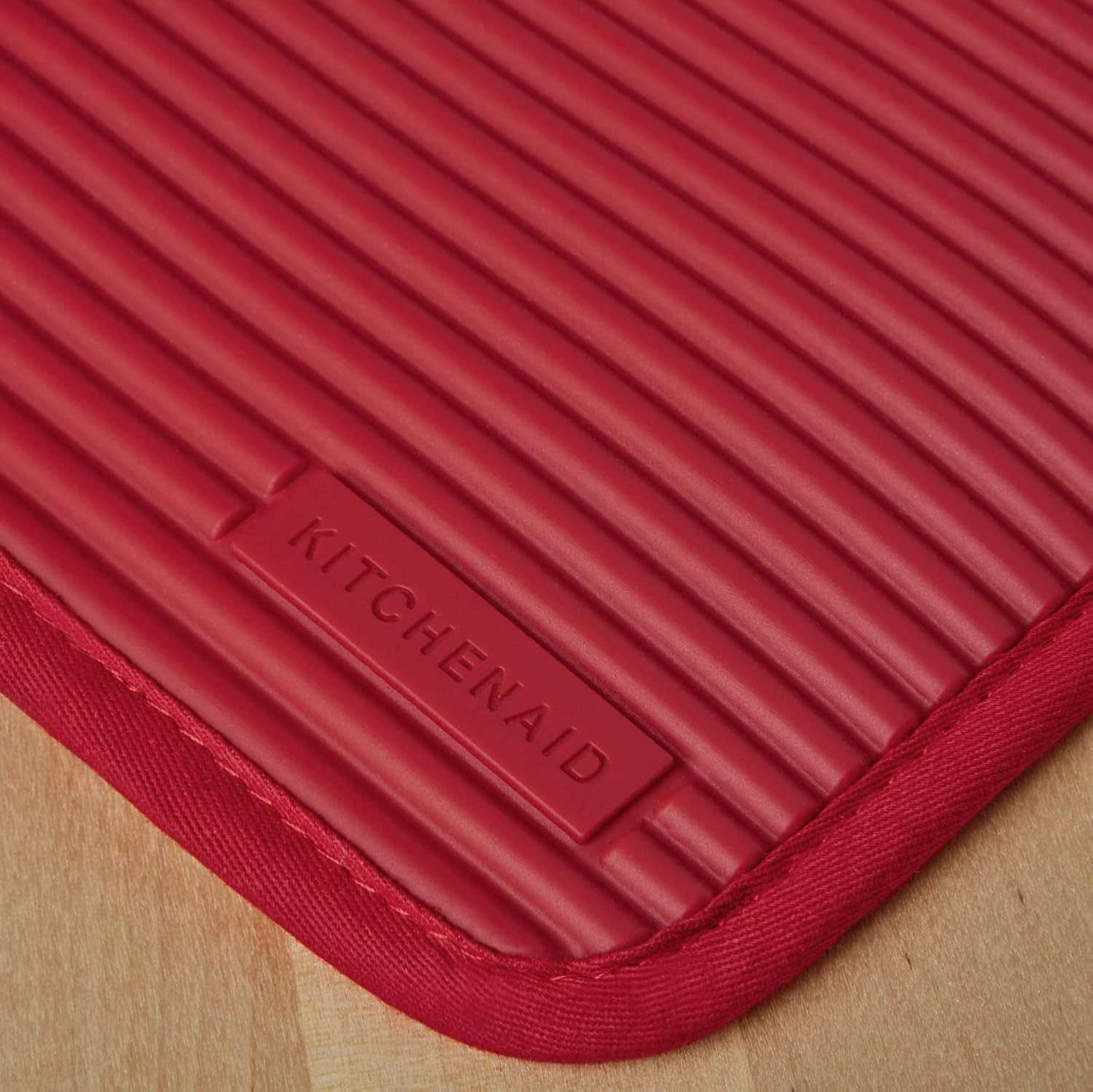 About this itemnDURABLE, HEAT RESISTANT SILICONE – The Kitchen Aid Ribbed Soft Silicone pot holders are heat resistant up to 500 degrees Fahrenheit to safely shield hands from the heat while cooking and handling hot pans and dishes.nWATERPROOF & SLIP-RESISTANT – These silicone pot holders are water resistant for additional protection from hot spills and spots with a textured, ribbed stripe design on one side for a safe and secure grip.nSET OF TWO- Includes two (2) generously sized pot holders that each measures 7