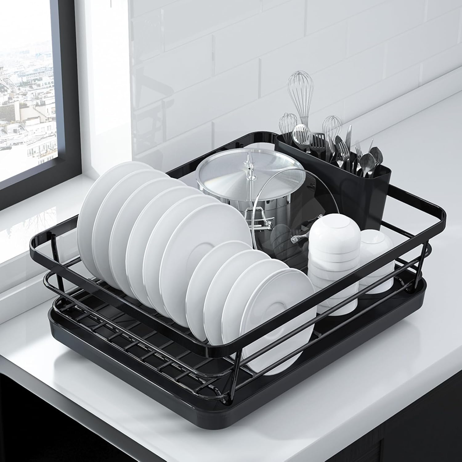 Kitsure Dish Drying Rack- Space-Saving Dish Rack, Dish Racks for Kitchen Counter, Stainless Steel Kitchen Drying Rack with a Cutlery Holder, 12”W x 15”L, Black