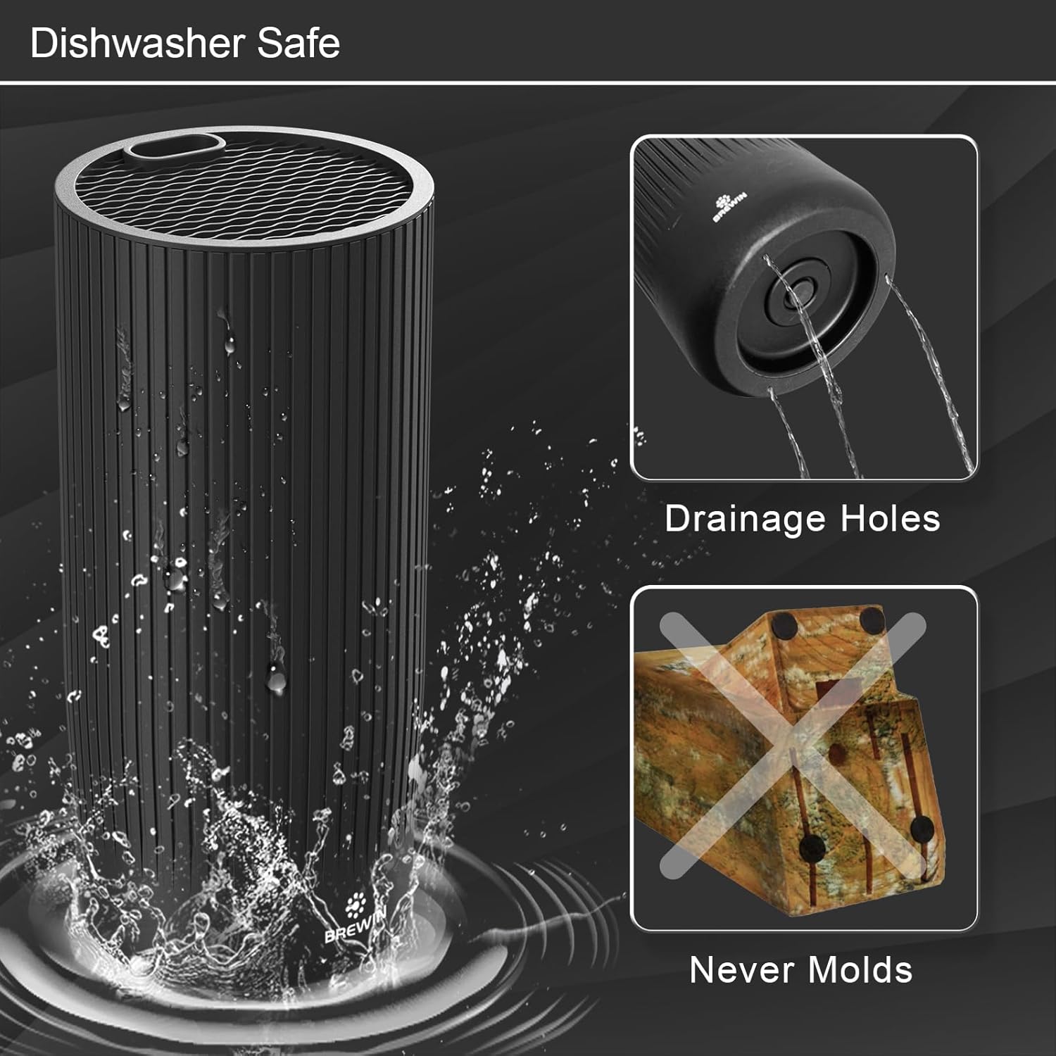 About this itemnPERFECT ALL-IN-ONE SET – Brewin kitchen knife set includes 1 x 8 chef knife, 1 x 8 slicing knife, 1 x 8 bread knife, 1 x 5 utility knife, 1 x 5 Santoku knife, 1 x kitchen scissors, 1 x universal knife block. Germain 1.4116 stainless steel. Aesthetic design. Brewin knife set meets all your kitchen works.nNON-STICK & ERGONOMIC – The black coating on the blade ensures excellent non-stick and rust-resistant properties for our kitchen knives. Our ergonomic knife handle features anti-slip indented dots to ensure a firm and safe grip.nDISHWASHER SAFE – Our aesthetic knife block is made of high density polypropylene, with drainage holes at the bottom. Both knives and block are dishwasher safe.nRAZOR SHARP – The super sharp edge is engineered at 56+ Rockwell hardness score and hand polished at 14-16 degrees per side to minimize cutting resistance. High quality German 1.4116 steel offers a superior balance between long-lasting sharpness and durability.nPERFECT GIFT & MONEY-BACK GUARANTEE – Brewin knife set is the best gift choice for your loved ones. Enjoy peace of mind with our 100% satisfaction or Money-back Guarantee.