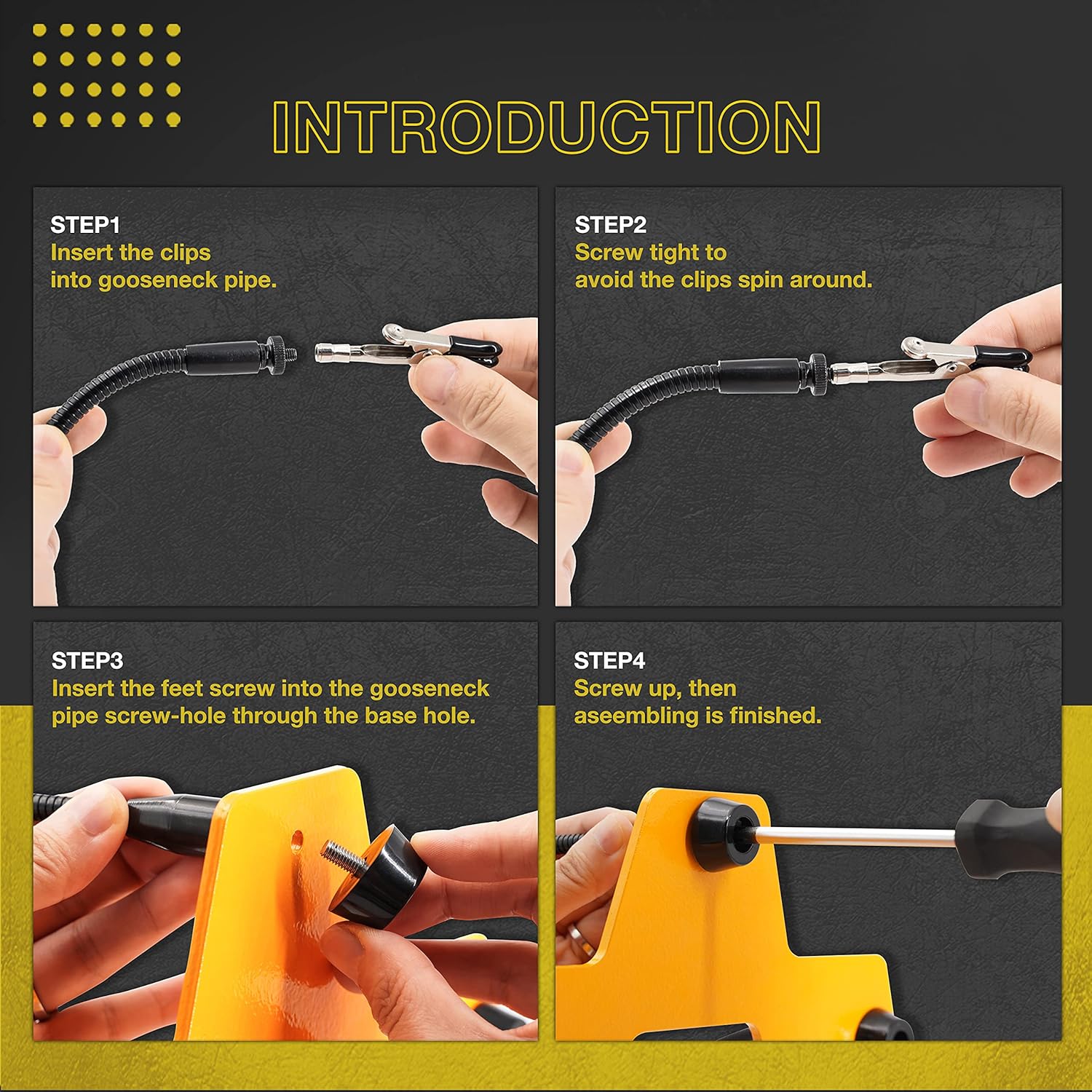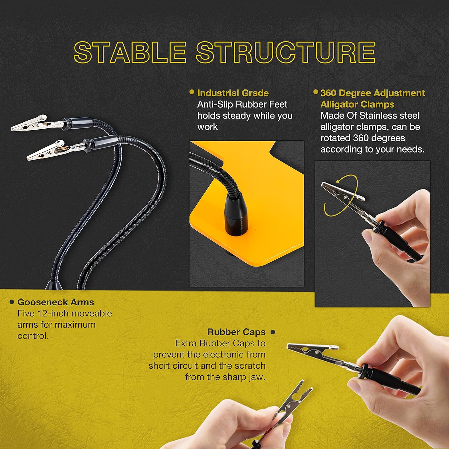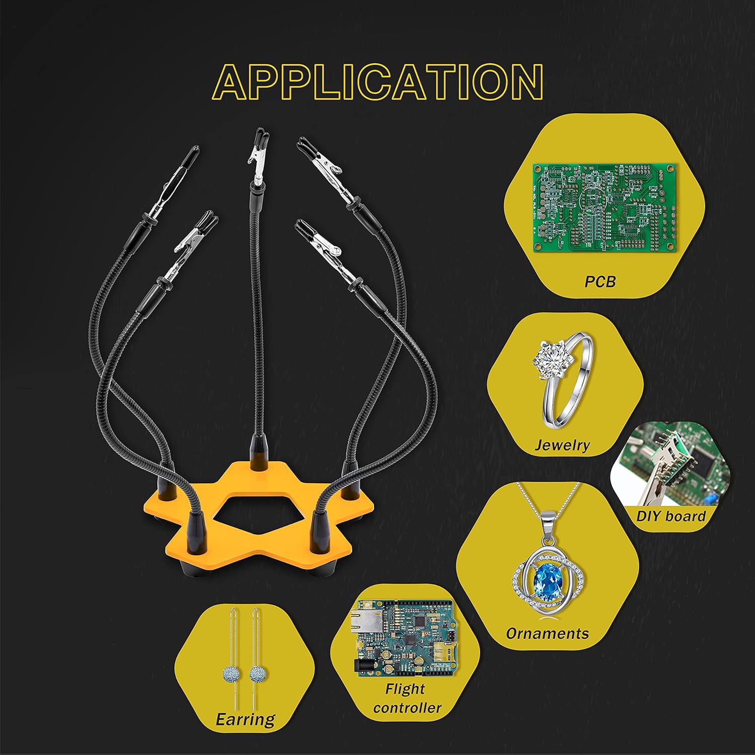About this itemnHOW HAVE YOUR SURVIVED WITHOUT THEM: Our third hand/helping hands soldering stand is essential for every workshop, solder station, and craft room. Ideal for soldering, circuit board holding, assembly, repair, fishing lure, hobby, jewelry, and crafts. 5 adjustable metal gooseneck arms and stainless steel precision alligator clamp tips. 360-degree rotation. The tight grips are strong enough for you to position your hard-to-hold items freelynKOTTO KNOWS WHAT YOU NEED: We are engineers creating high-quality and effective tools because we use them too! Thats why our soldering helping hand tools have a weighted base and anti-slip rubber feet, making these soldering tools one of the sturdiest on the market. We engineered it this way to ensure a stable soldering iron station that does not move. The rubber feet protect your work surface from scratches and scuffsnEVERY DETAIL COVERED: We love tools! You might say we are obsessed. Thats why we engineer quality into all Kotto products right down to the smallest detail. The alligator clamps on this multifunctional helping hands soldering station tool are made of stainless steel. Our thoughtful design allows the alligator clips to be easily rotated 360 degrees and remain strong enough to hold larger projects in placenMAKE YOUR LIFE EASIER: Our helping hands soldering stations tool will be one of your favorite tools, not only because it makes your life easier but also because it can be used for so much! You might want to get 2! Our customers love them! Use them for hobbies, creating fishing lures, electronics, arts and crafts, figurine model painting, and product design prototypingnBASED IN THE USA. WE GOT YOUR BACK: Kotto is based out of California and our USA customer support team is ready and helpful if you should need to reach out for any reason, WE LOVE TO HEAR FROM YOU. We value your satisfaction and were proud to offer a 30 day, full satisfaction, no question asked return period on all Kotto productsn See more product details