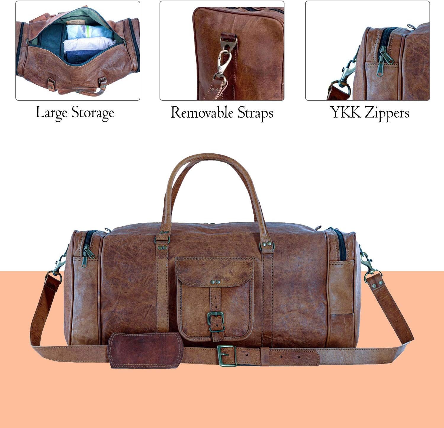 FULL GRAIN LEATHER: Our bags are made from full grain leather and lined with durable canvas and are Handcrafted by skilled craftsmennAPPROVED BY MOST AIRLINES: Most Major Airlines allow a maximum of 22 Inches as cabin baggage. This duffel is cabin friendly and approved by Most Major Airlines as a cabin bag. Detachable shoulder strap adds to the convenience of carrying it on a shoulder or by handles.nSTORAGE AND USE: Size 21