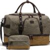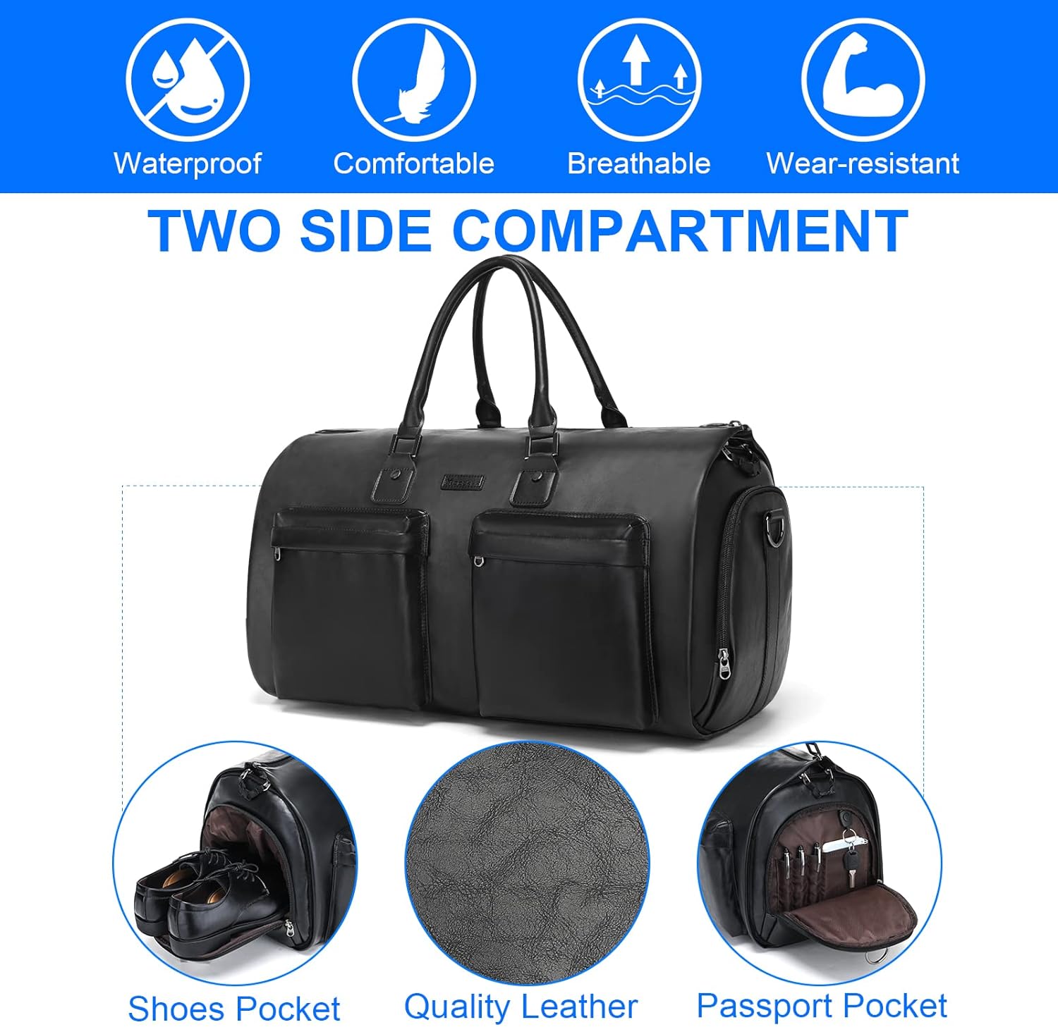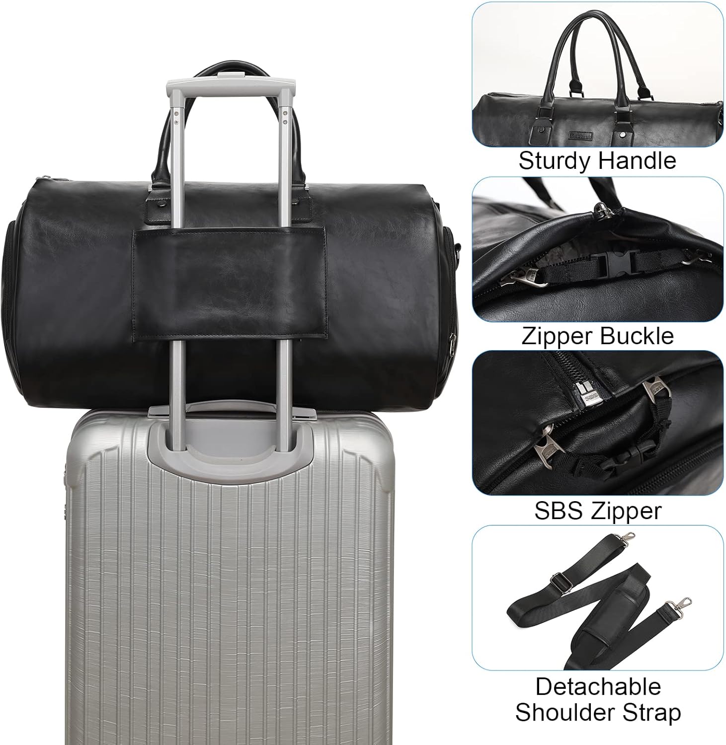 TWO IN ONE MODOKER BAG: With the fancy design of combining the feature of Garment Bag and Duffel Bag, Modoker Leather Garment Duffel Bag is not only a Overnight Travel Weekender Bag, but also a great Duffel Hanging Clothes Bag. It is a solid choice for who heading for a business trips or weekend getawaynNO WRINKLE – HANGING GARMENT BAG: While open this Modoker Garment Bag and lay it out, it can be a great hanging garment bags for travel. With this Modoker Hanging Leather Garment Bag, you can have a wrinkle-free suit or dress at any given time. No Wrinkles Trouble Your Dress or Suits Any Moren45L DUFFEL BAG with SHOES COMPARTMENT: After assembled, this garment duffel bag work perfect as a 45L duffel bag/travel weekender bag. At the left side pocket of this leather garment bag is a shoes pouch. And the right side pocket is designed for passport, keys and some other small items. Vegan Leather Garment Bag with Two front pockets for small pieces. Convenient pockets for Quick accessnCARRY ON GARMENT BAG: Garment Bag Dimension: 37.5L x 20.8W, 45L Duffel Bag Dimension: 22.8L x 11W x 11.8H; Weight: about 3.4 pounds. This soft- sided garment bag meet the require of sizer at the airport (Length + Width + Height: up to 51 inches / 130 cm). So this Modoker Leather Garment Duffel Bag can be taken as your carry on luggage itemnWATER-RESISTANT DUFFEL BAG: Using high-quality waterproof PU leather and high quality polyester Fiber, sturdy SBS zipper, jacquard with Vegan Leather accents, this garment bag is scratch-resistant, anti-tear & anti water splashing. With a Detachable Shoulder Strap, it can be shoulder bag if needed. The detachable shoulder strap is adjustable to make this garment bag fits your shoulder well