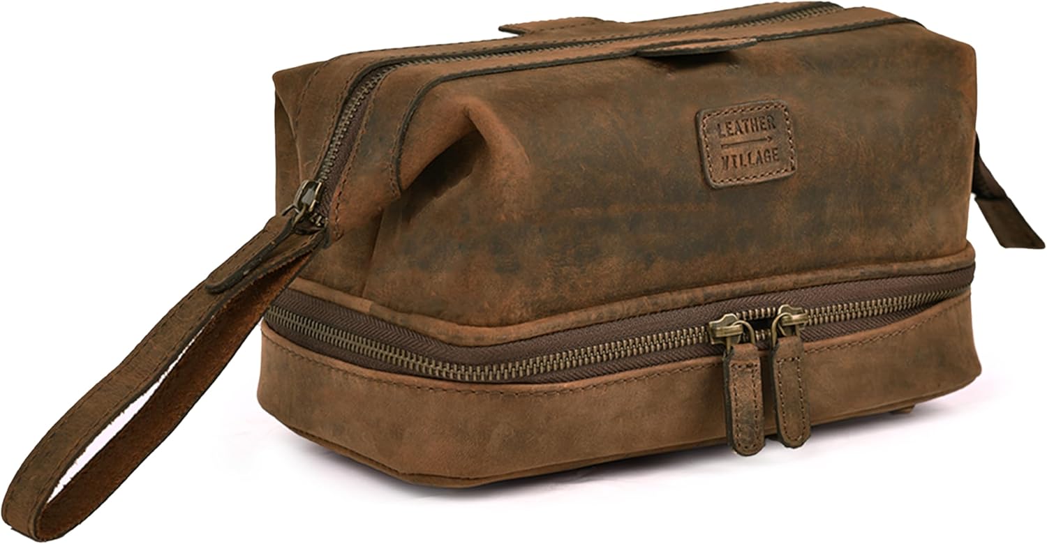 LEATHER VILLAGE Genuine Leather Dopp Kit – Large Travel Toiletry Bag with Waterproof Lining, Dual-Zip Design for Men & Women, Organizer for Shaving, Makeup & Essentials – Brown