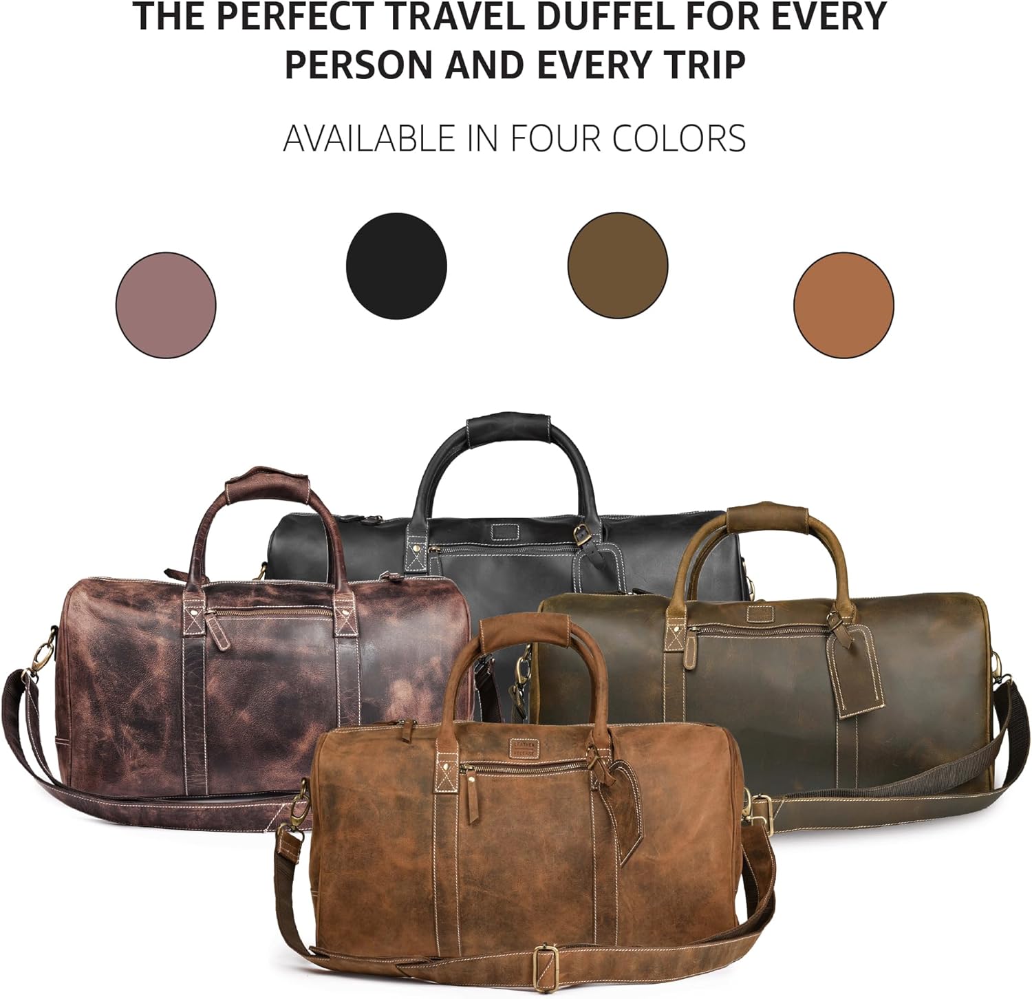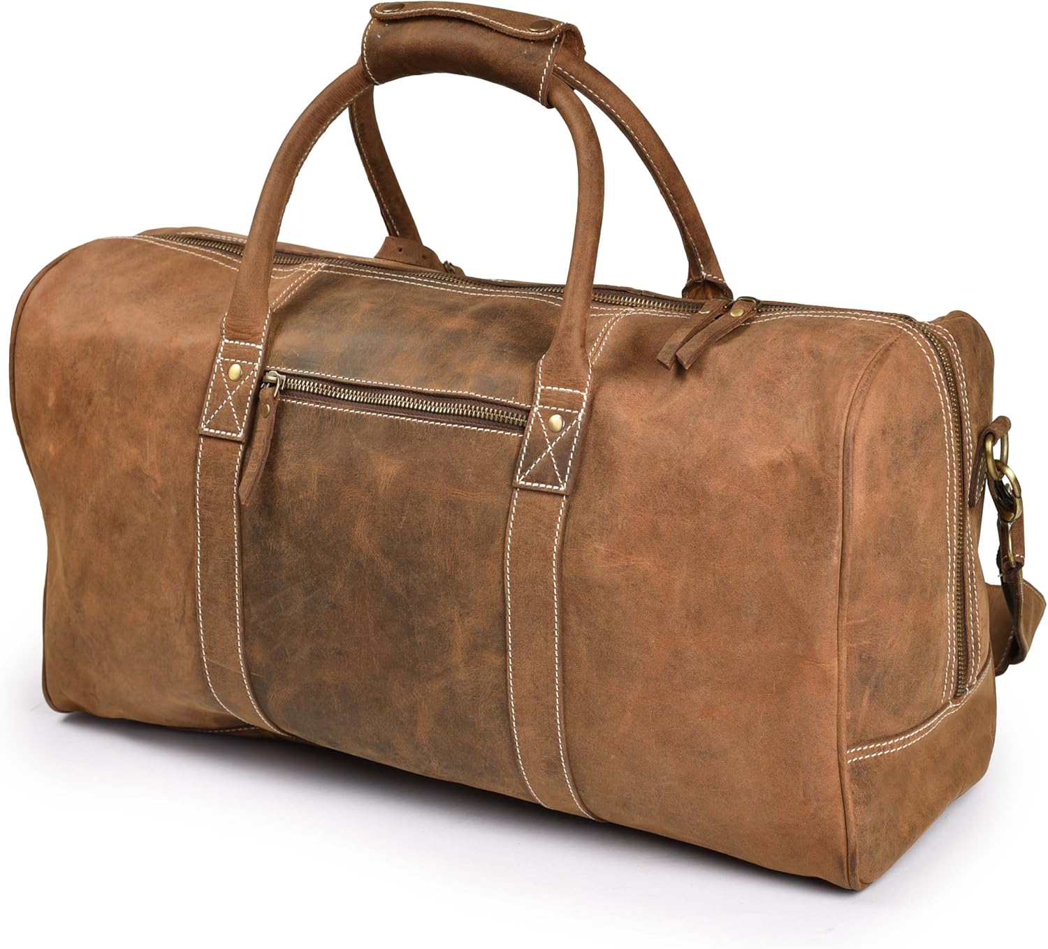 Premium Full Grain Leather for a Classy Look Made from top-quality buffalo leather, this bag combines durability with vintage charm, making it ideal for both men and women. Our leather duffle bags feature a rustic design that only gets better with age.nTSA-Friendly Carry-On Size The 20-inch version is approved for cabin use by most airlines, allowing you to keep your essentials close during flights. The detachable shoulder strap offers added convenience, giving you multiple carrying options.nSpacious and Organized Storage With front and back pockets for easy access to essentials like your phone or wallet, this bag is as practical as it is stylish. It includes pen loops, hooks for AirTags or keys, and an interior zippered pocket to keep your belongings safe.nDurable with Water-Resistant Lining Our duffle bags feature YKK zippers, antique brass fittings, and a water-resistant inner lining for extra protection. Metal studs on the base shield the leather from wear, making this bag the perfect companion for weekend getaways or gym sessions.nPerfect Gift for Every Occasion This leather duffle bag makes an ideal gift for birthdays, anniversaries, Father’s Day, Thanksgiving, Christmas, and other special occasions. Its timeless style and practical features are perfect for anyone who loves travel, sports, or the gym.