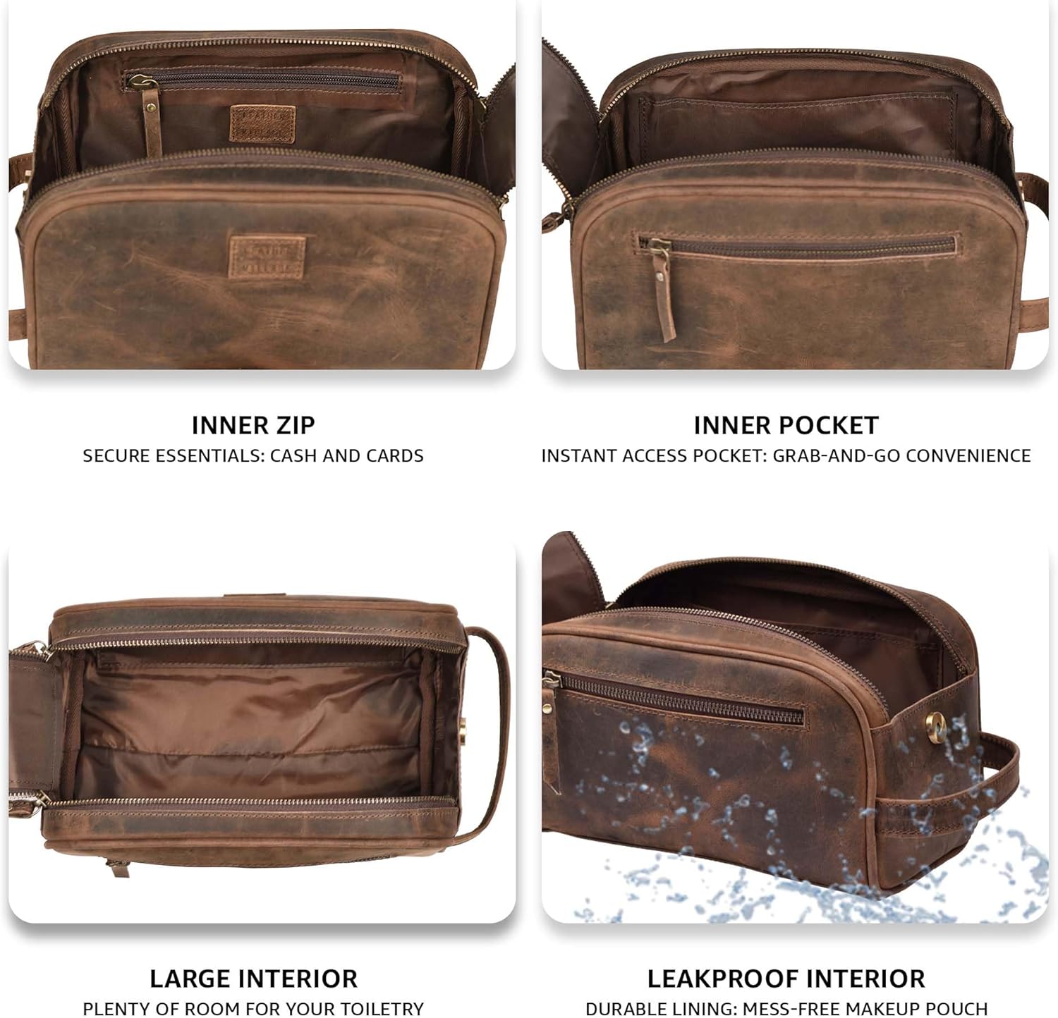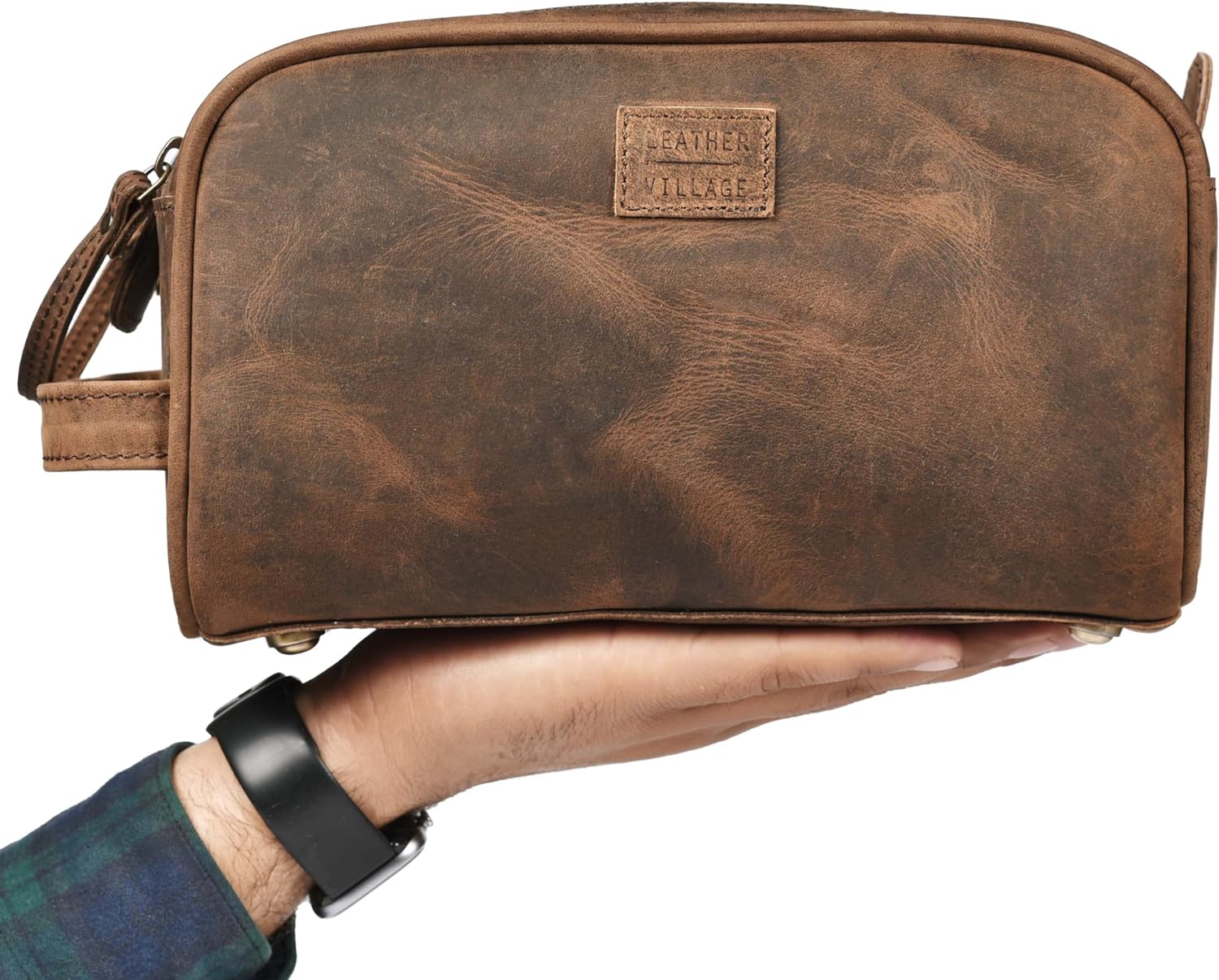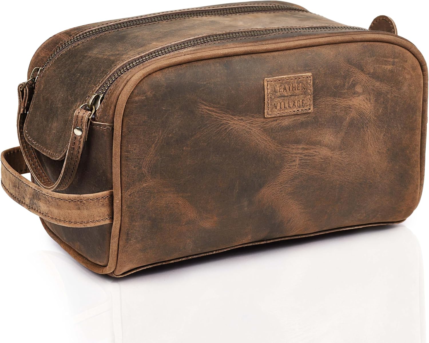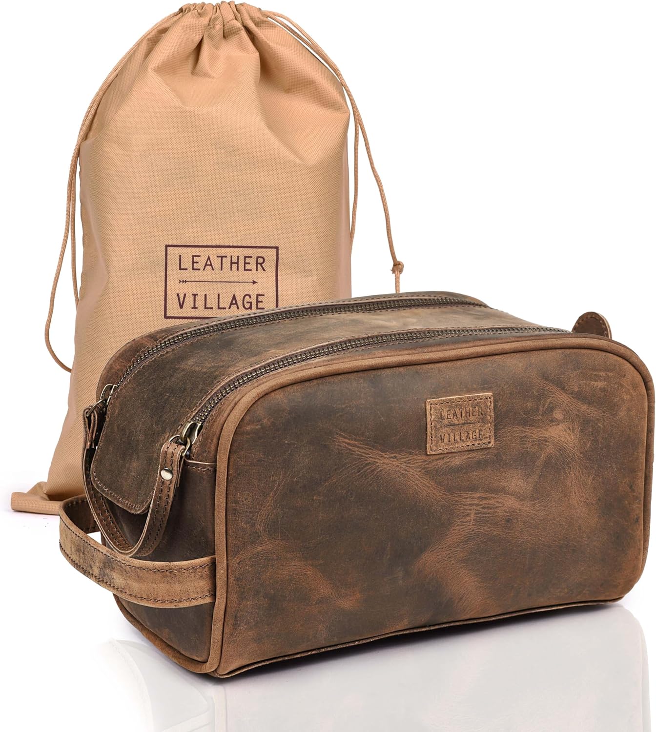 Luxurious Craftsmanship: Elevate your style with Leather Village’s premium Full Grain buffalo leather toiletry bag. Ideal for shaving, as a versatile travel companion, it caters to modern grooming needs for both men and women.nDurable Elegance: Experience lasting luxury with high-end YKK zippers, offering a rich aesthetic and unmatched resilience for your essentials, be it a grooming kit or leather travel companion.nPractical Sophistication: The water-resistant interior and external metal zipper bring practicality and elegance to this chic dopp kit, an ideal travel companion suitable for various genders.nCompact Convenience: Sized at 10X6X6 inches, this must-have kit blends style and functionality seamlessly for your toiletry and travel essentials.nIdeal Gift for Men & Women: A chic and thoughtful gift, Leather Village’s toiletry bag transcends utility, providing a classy solution for on-the-go grooming. Compare for top-tier quality and unmatched style in this versatile leather travel kit.