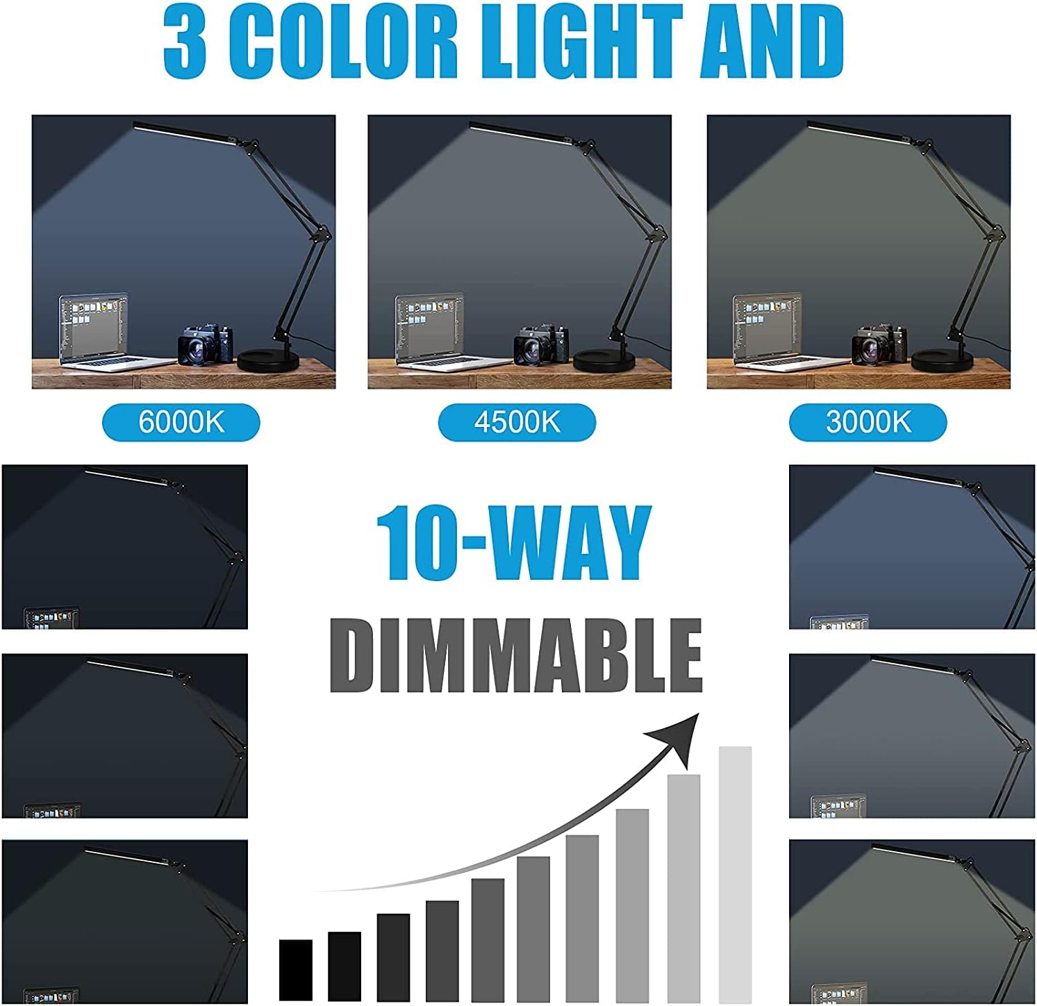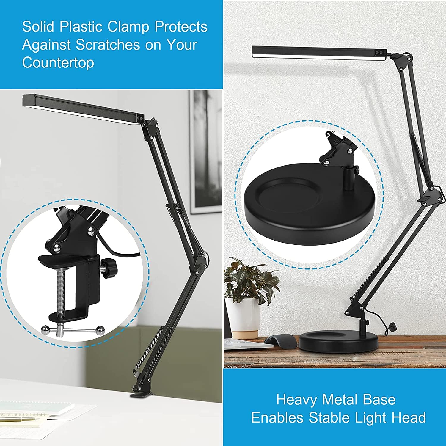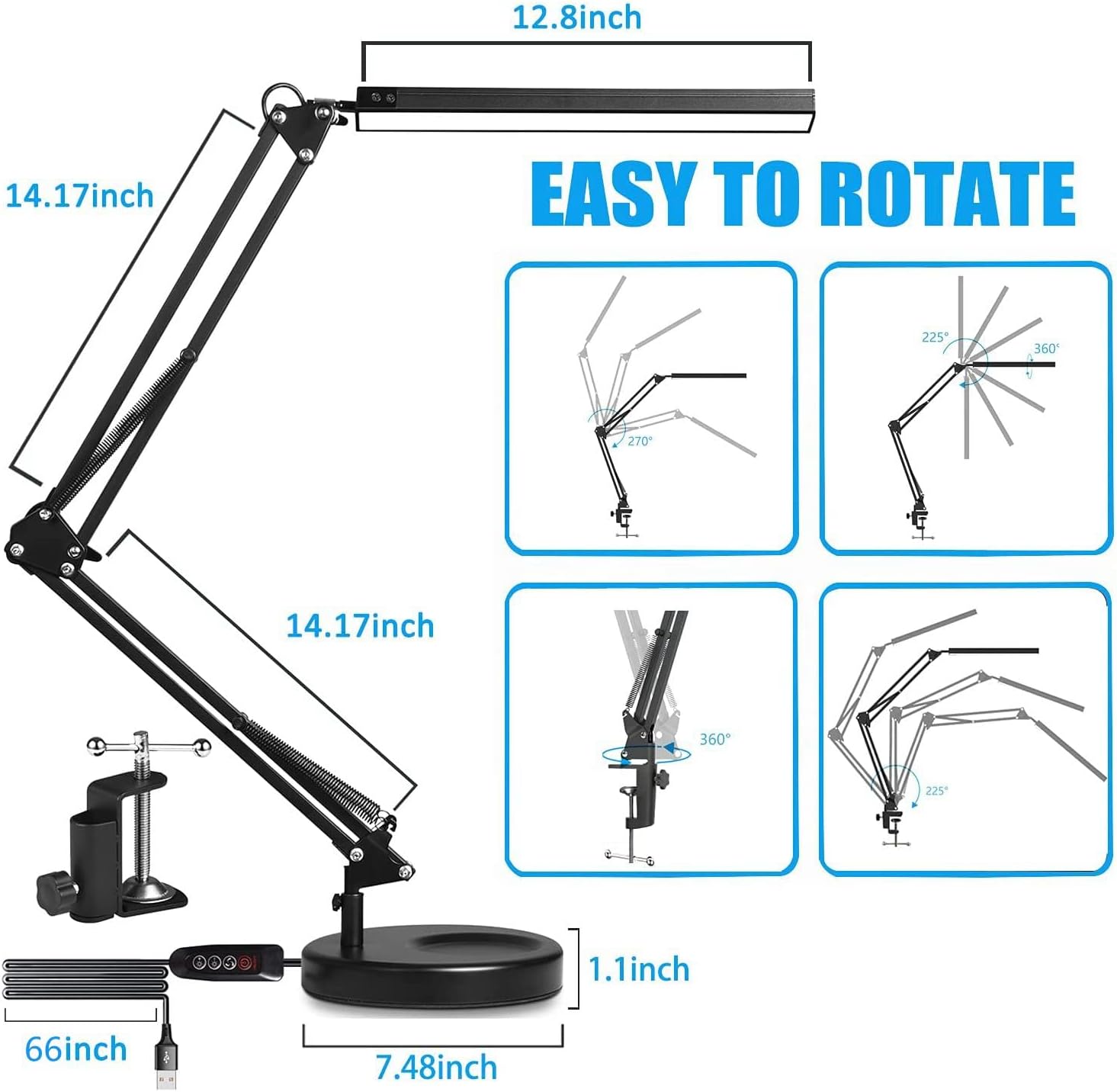 About this itemn?10 Brightness Eye-Caring & 3 Color Temperature?Long arm lamp provides Dimming Design (from 3200K to 6500K). Its light is very uniform, can prevent blue light damage to the eyes. This lamp is suitable for all ages, no matter the children or grandparents, easily protect your family’s eyes.n?Memory Function & Many Scenes?The LED desk lamp has memory function, it will restore your last setting when you use next time. Suitable for office, workbench, reading room, painting, study, bedside table lighting, nail salon.n?Foldable Lamp Arm & Clamp Design?Space-Saving with a versatile three-axis design, provide more larger lighting area. Allows you to fix it in different directions. Easy to install. Extra wide metal clamp comes with silicone pads, supports up to 2 inches table top.n?LED Light Bead & USB Powered?With 80 LED Light Beads ,USB powered is easy to fit any available USB port to power the lamp Adapter include. LED is a green light source, cold light source that has low heat and can be touched safely. The voltage of the included adapter is 5V/2A. The length of the power cord is 59 inch.n?What will you get? 1x swing arm folding desk lamp (Material: Aluminum Alloy), 1x Metal Clamp, 1x Power Adapter(5V/2A), 1x table lampstand,1x User Manual.n See more product details