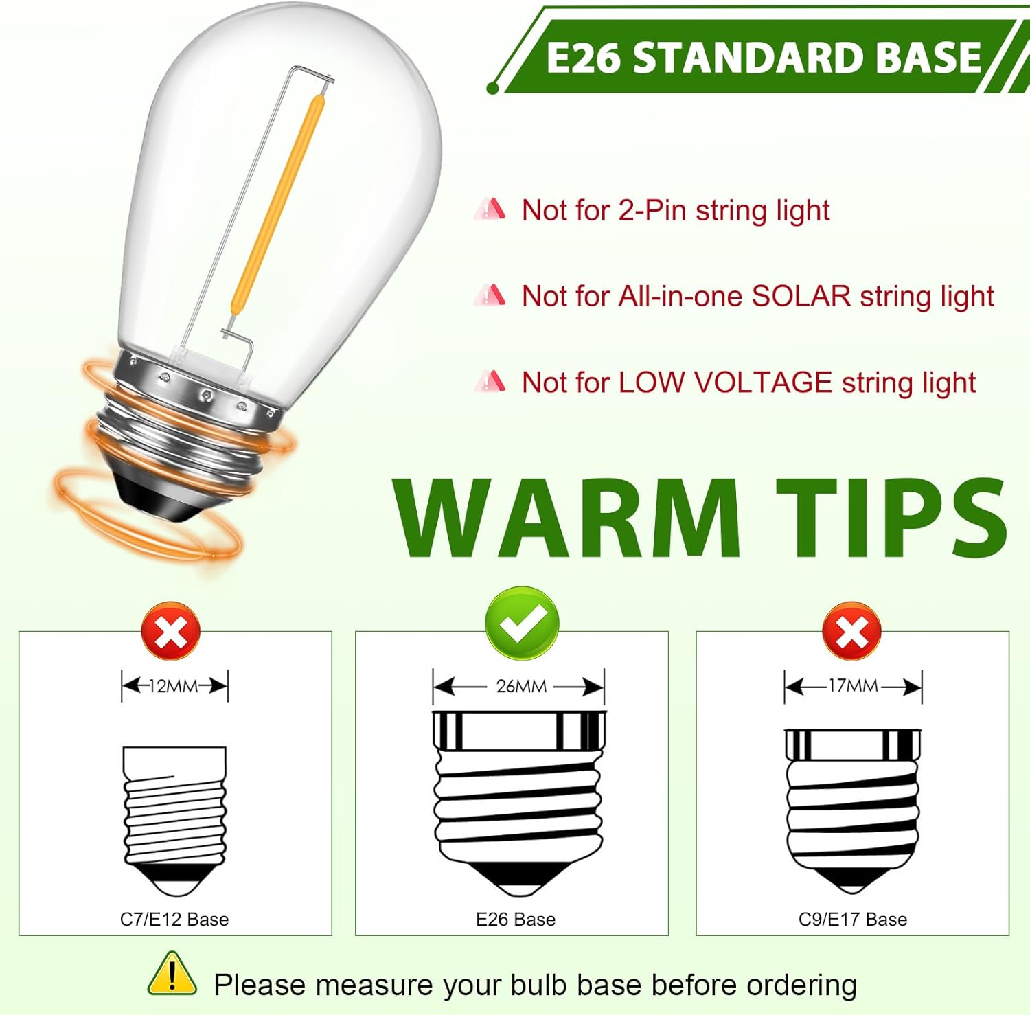 About this itemnVersatile Dimmable LED Bulbs: These S14 LED string light bulbs are compatible with a wide range of dimmers, making them perfect for creating the desired ambiance in gardens, backyards, and balconies. They feature an E26 regular bulb base for easy installation.nDurable Outdoor Construction: Designed for outdoor use, these shatterproof LED bulbs are weather-resistant, ensuring reliable performance in rain, wind, and extreme temperatures. They are made from safe materials, free from lead, mercury, UV, and IR.nEnergy-Efficient Illumination: With an impressive lifespan of 20,000 hours and energy savings of up to 90% compared to incandescent bulbs, these 1W LED bulbs with 30 lumens of brightness offer an economical and long-lasting lighting solution.nVersatile Applications: Suitable for both indoor and outdoor use, these UL-listed decorative lights can be used as string lights, bistro lights, or patio lights, providing a warm and inviting atmosphere for various occasions.n See more product details