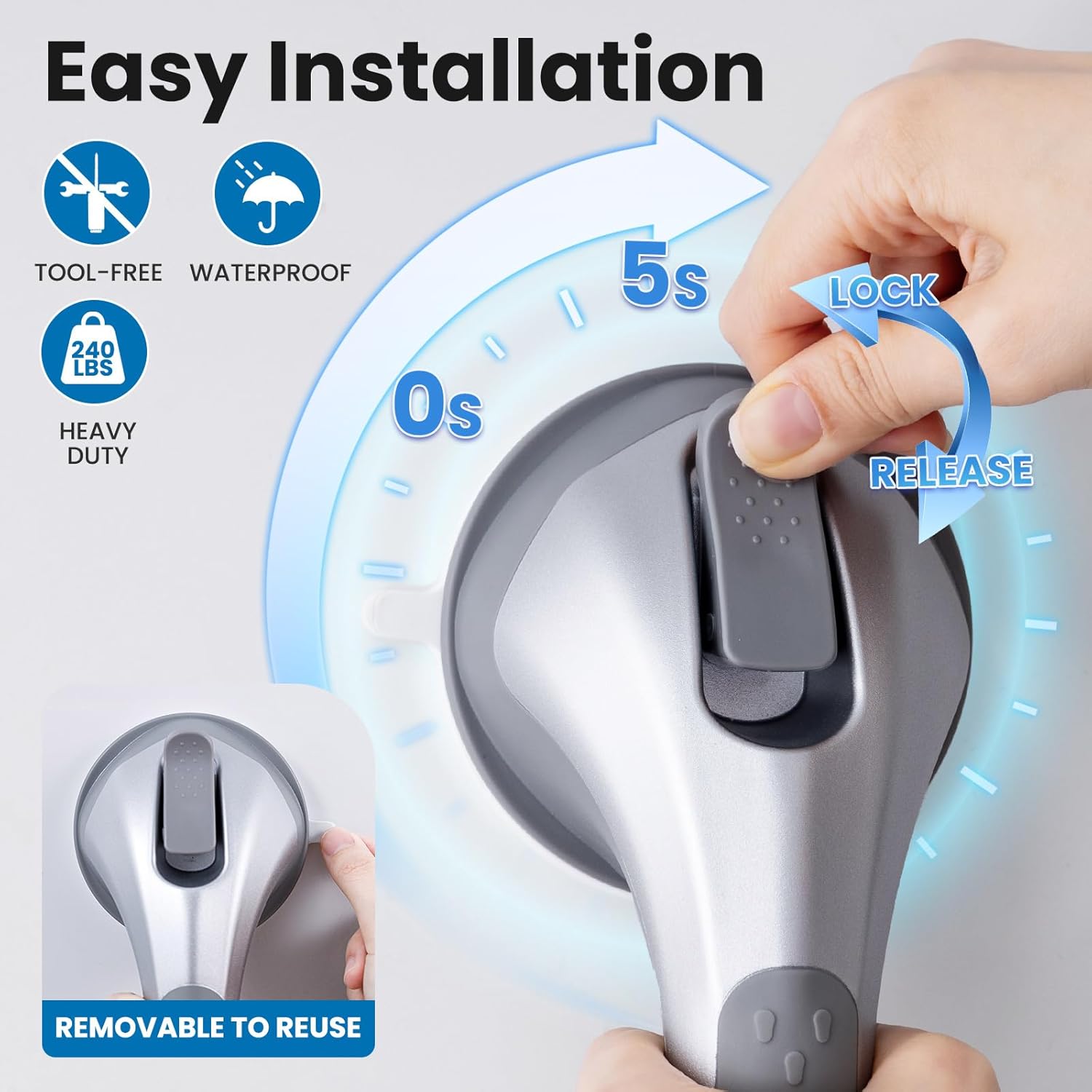 LEVERLOC Grab Bars for Bathtubs and Showers 2 Pack Suction Grab Bar, Heavy Duty 12 Inch Shower Handle Removable Handrails for Seniors and Elderly, Bathroom Safety Grip No Drilling Waterproof Silver