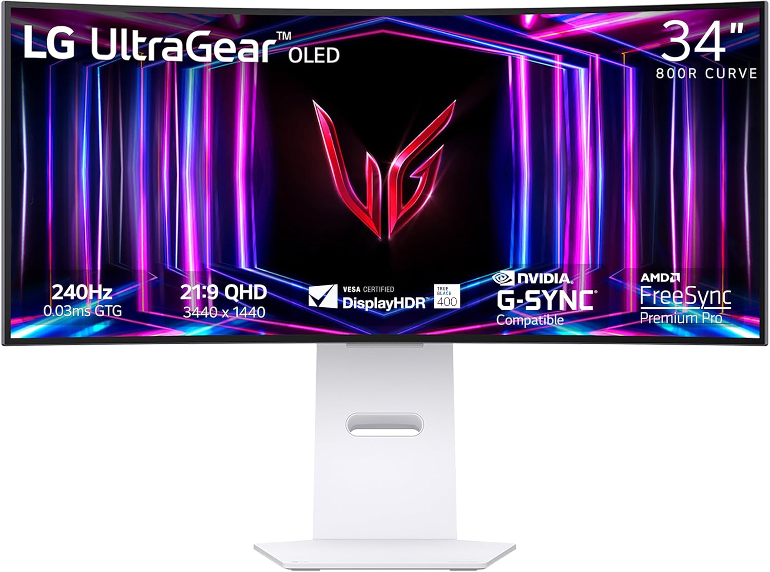 About this itemnImmersive Gaming Experience: Feast your eyes on the LG UltraGear 34GS95QE-W’s massive 34-inch OLED display with a dramatic 21:9 aspect ratio and an ultra-wide 800R curve, enveloping you in the heart of the action for an immersive gaming experience.nBlazing-Fast Performance: Enjoy buttery-smooth gameplay with a blistering 240Hz refresh rate and an incredible 0.03ms response time, minimizing lag, ghosting, and tearing for a seamless, uninterrupted experience.nVibrant Visuals: Marvel at the stunning DisplayHDR True Black 400 with a remarkable 1.5M:1 contrast ratio, delivering rich blacks, vivid colors, and impeccable detail in even the darkest scenes for a breathtaking visual spectacle.nAdaptive Sync Technology: Experience tear-free and stutter-free gameplay with NVIDIA G-SYNC Compatible and AMD FreeSync Premium Pro adaptive sync technologies, ensuring a fluid and responsive gaming experience.