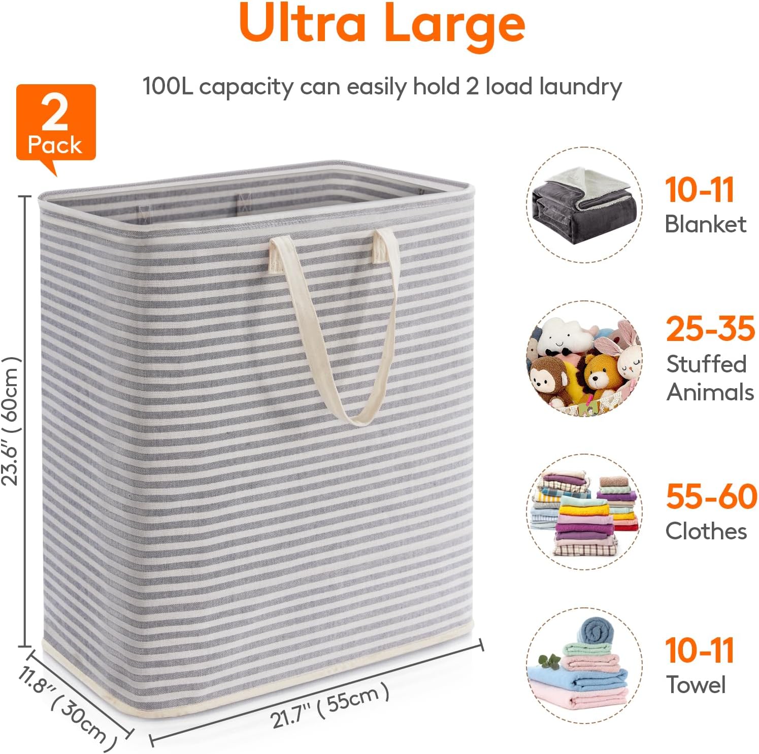 Lifewit 100L Freestanding Laundry Hamper, Collapsible Waterproof Large Laundry Basket with Easy Carry Extended Handles for Clothes, Towels, Grey, 2 Packs
