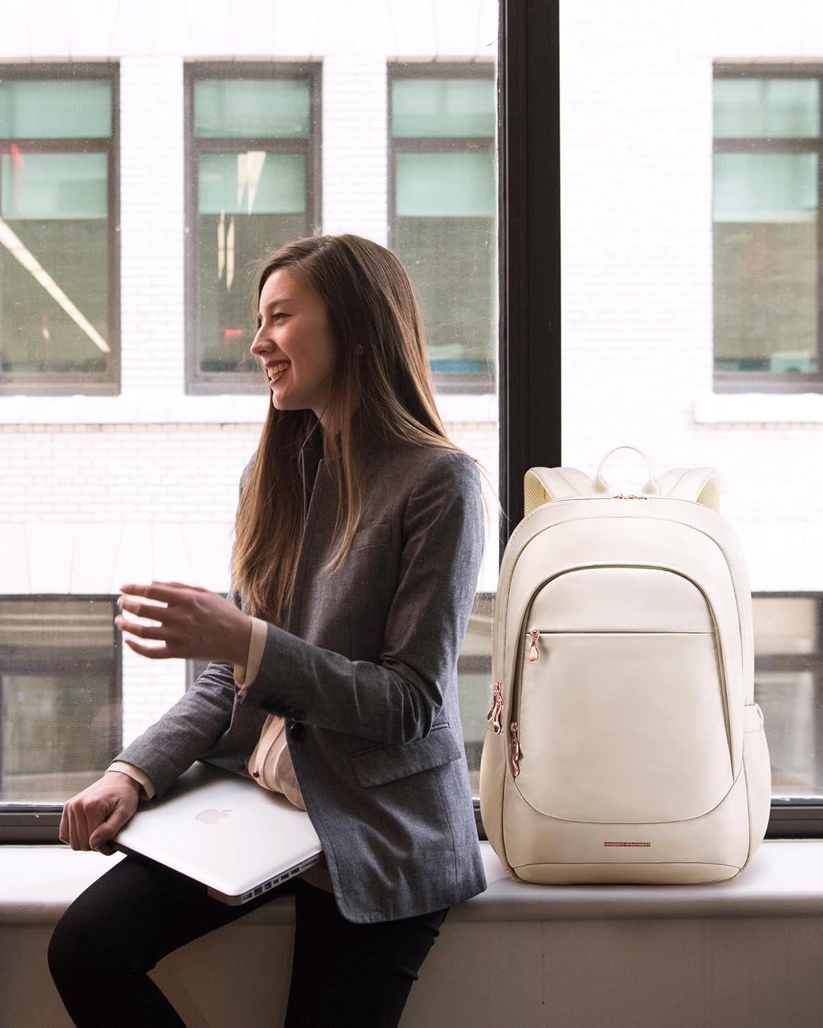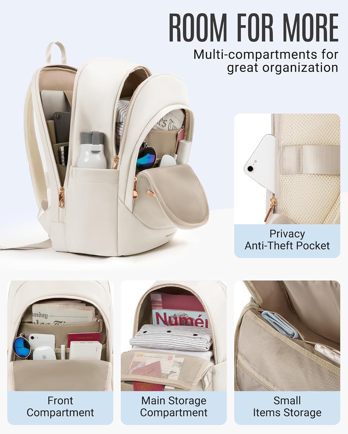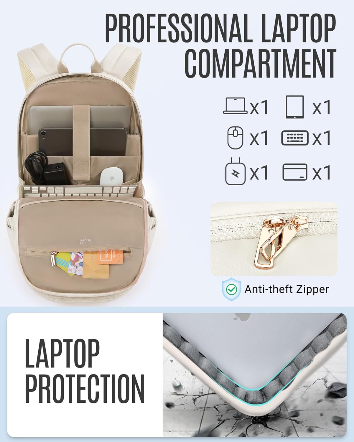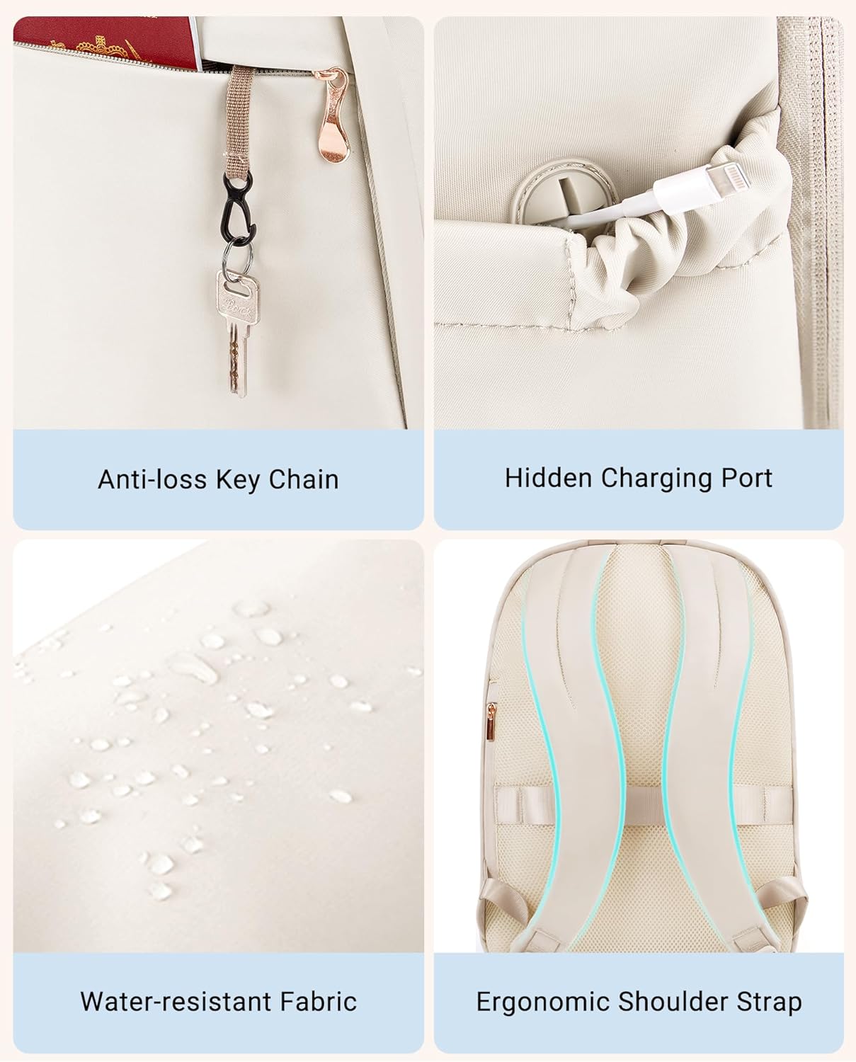 LIGHT FLIGHT Travel Laptop Backpack for Women, 15.6 Inch Anti Theft Backpack with USB Charging Hole, Water Resistant College Bookbag, Large Capacity Black Computer Backpacks for Work, Beige