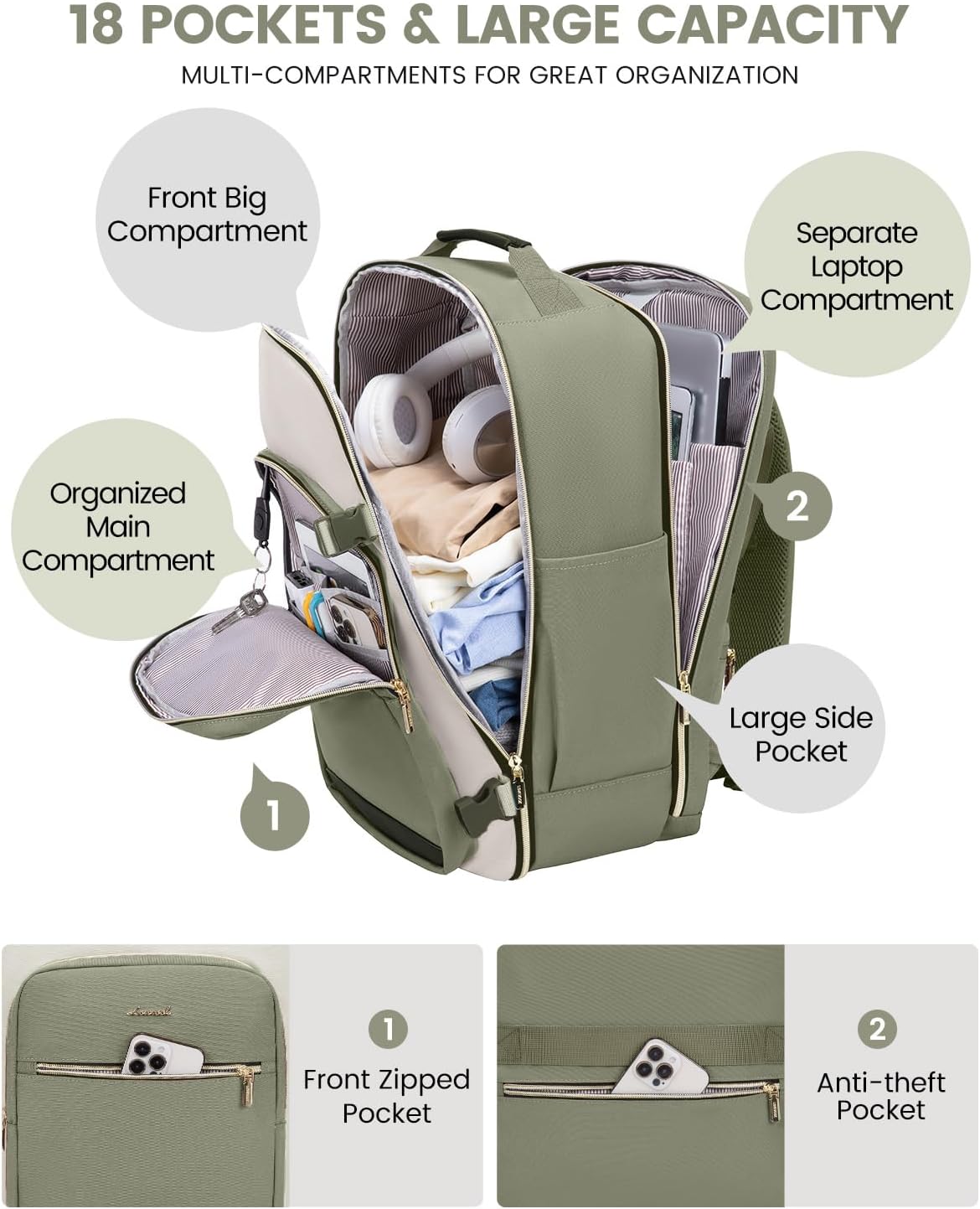 ?Airline Approved & Convenient?Our carry on backpack measures 18*14*8 inches, meeting the requirements of budget-friendly airlines like Spirit, Frontier, and JetBlue. It easily fits under the seat or in the overhead compartment, making it the perfect personal item for air travel.n?Spacious & Organized?With a capacity of 40L, 4 compartments, and multiple pockets, this travel backpack allows you to easily separate and organize your belongings. Pack 3-7 days worth of travel essentials with ease.n?Smart Packing Features?Our carry-on bag includes 3 extra packing cubes for effortless organization, as well as a wet compartment to keep your wet clothes and toiletries separate from your dry items. Say goodbye to leaks and protect your belongings!n?Long-Lasting & Comfort?Built to withstand the rigors of travel, our carry-on backpack is made from tear-resistant, water-resistant, and abrasion-resistant materials with adjustable shoulder straps and padded back panel for comfort during long trips.n?Secure & Practical?The suitcase-style opening offers easy access to your belongings at security checkpoints, while the padded electronics compartment and side pockets provide secure storage for your items. A luggage strap on the back adds convenience for your journey.