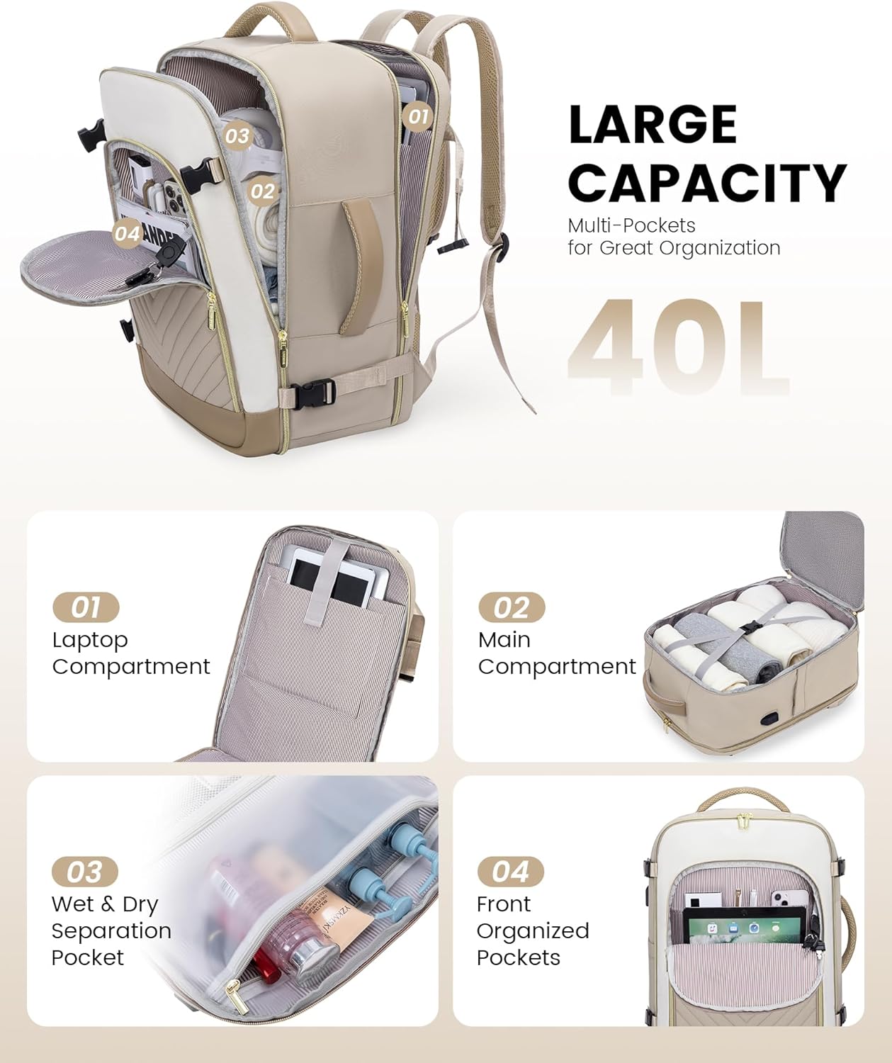 ?Large Capacity & Well Organized?40L capacity, 4 main compartments, and 15 pockets, designed to allow you to easily separate and organize your travel personal items, roomy space can even fit in 3-7 days of travel essentials.n?3 Packing Cubes and Wet Pockets?Equipped with 3 extra packing cubes, including 2 storage bags and a shoe bag. A zippered wet compartment pocket can help you to separate dry items and wet items, and prevent any leaks or moisture from affecting your other items. If you have wet clothes or towel, just put it in this travel backpack.n?Airline Approved Travel Bag?Size :18*13.5*8
