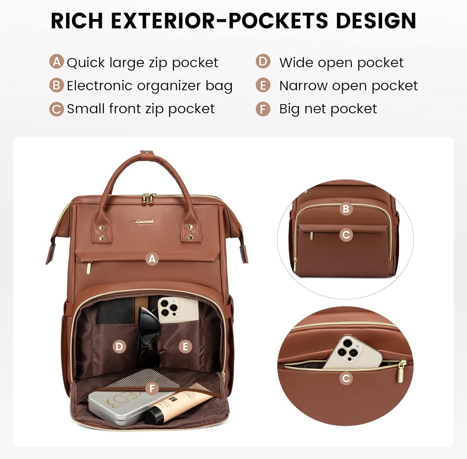 ???Upgraded LOVEVOOK Leather Laptop Backpack for Women?: STURDY UPGRADED REINFORCED SEAMS. Made of high quality waterproof PU leather,thick shoulder straps,unique leather handles,no-slip zippers.HEAVY DUTY & DURABLE.Total of 2 compartments and 19 pockets,easy to organize all work necessities,college supplies,travel essentials.Dimensions: 16.5