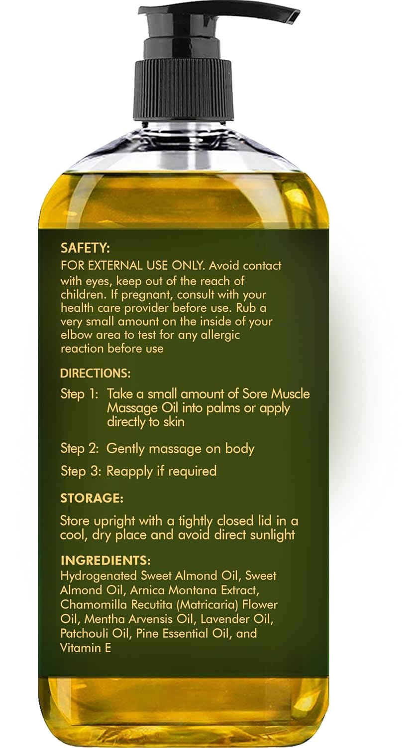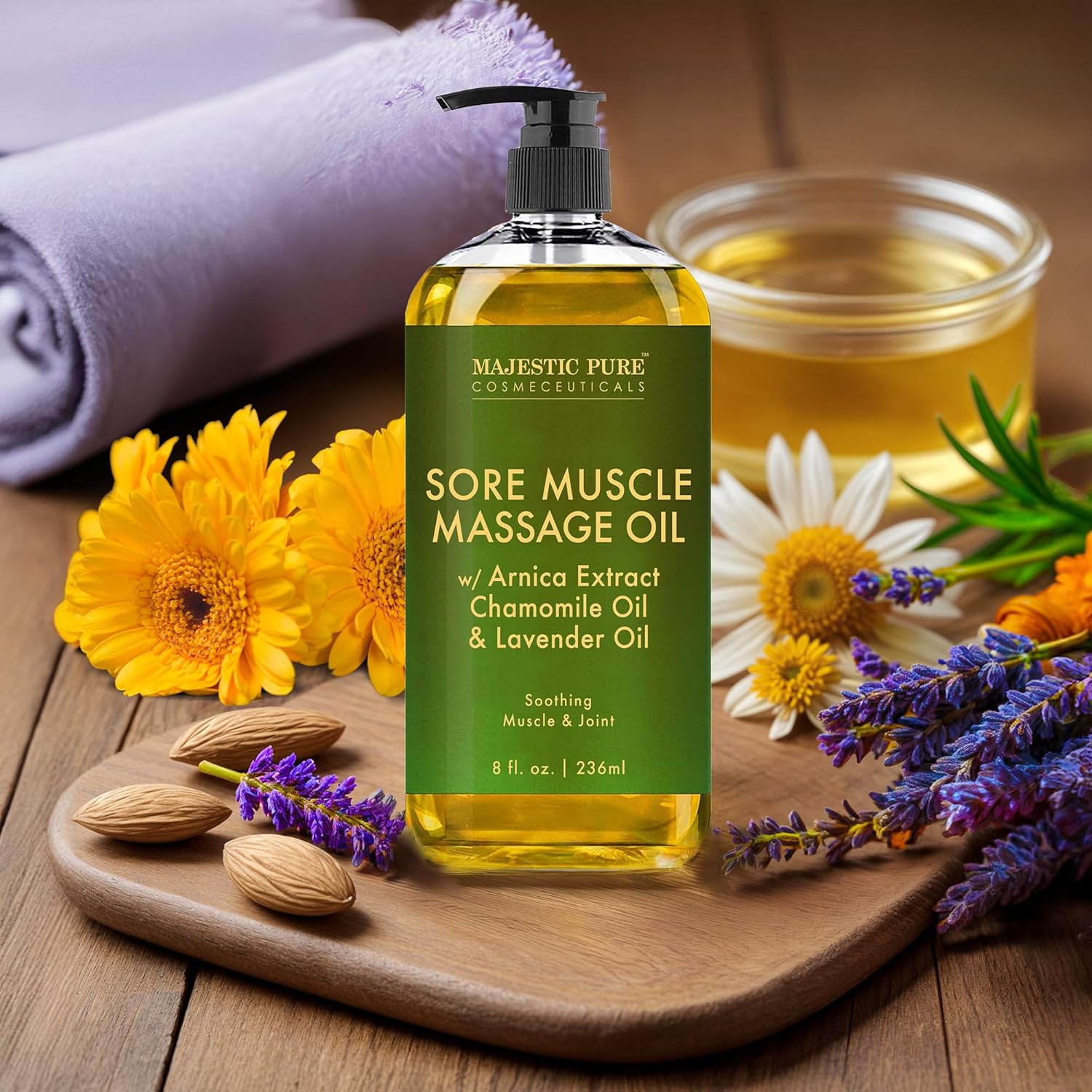 About this itemnSoothing Plant-Infused Formula: Majestic Pure Sore Muscle Massage Oil is a nourishing blend of chamomile, lavender, and arnica extracts, specially formulated to support muscle health and promote relaxation.nMulti-Purpose Massage Oil: Ideal for massage therapy, post-workout recovery, and everyday muscle tension relief, this unscented oil is quickly absorbed and gentle on all skin types.nCruelty-Free and Natural: Proudly PETA certified and featuring potent plant extracts, this 8 fl oz massage oil is a natural and ethical choice for self-care.nEasy Application: Simply dispense a small amount, rub between hands, and massage into desired areas to release tension and hydrate the skin.