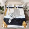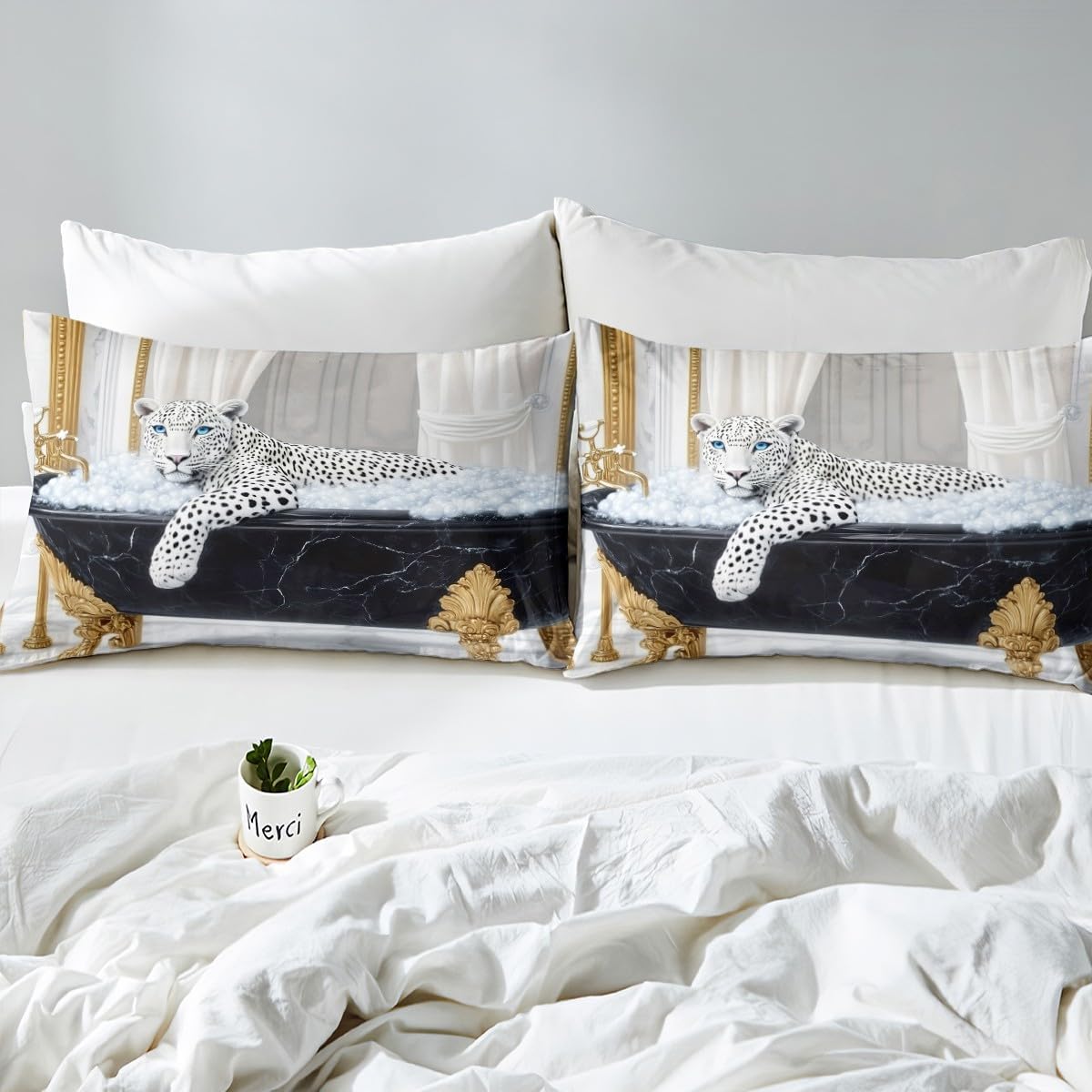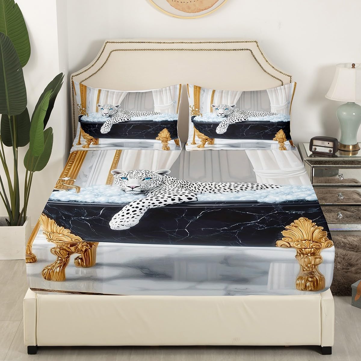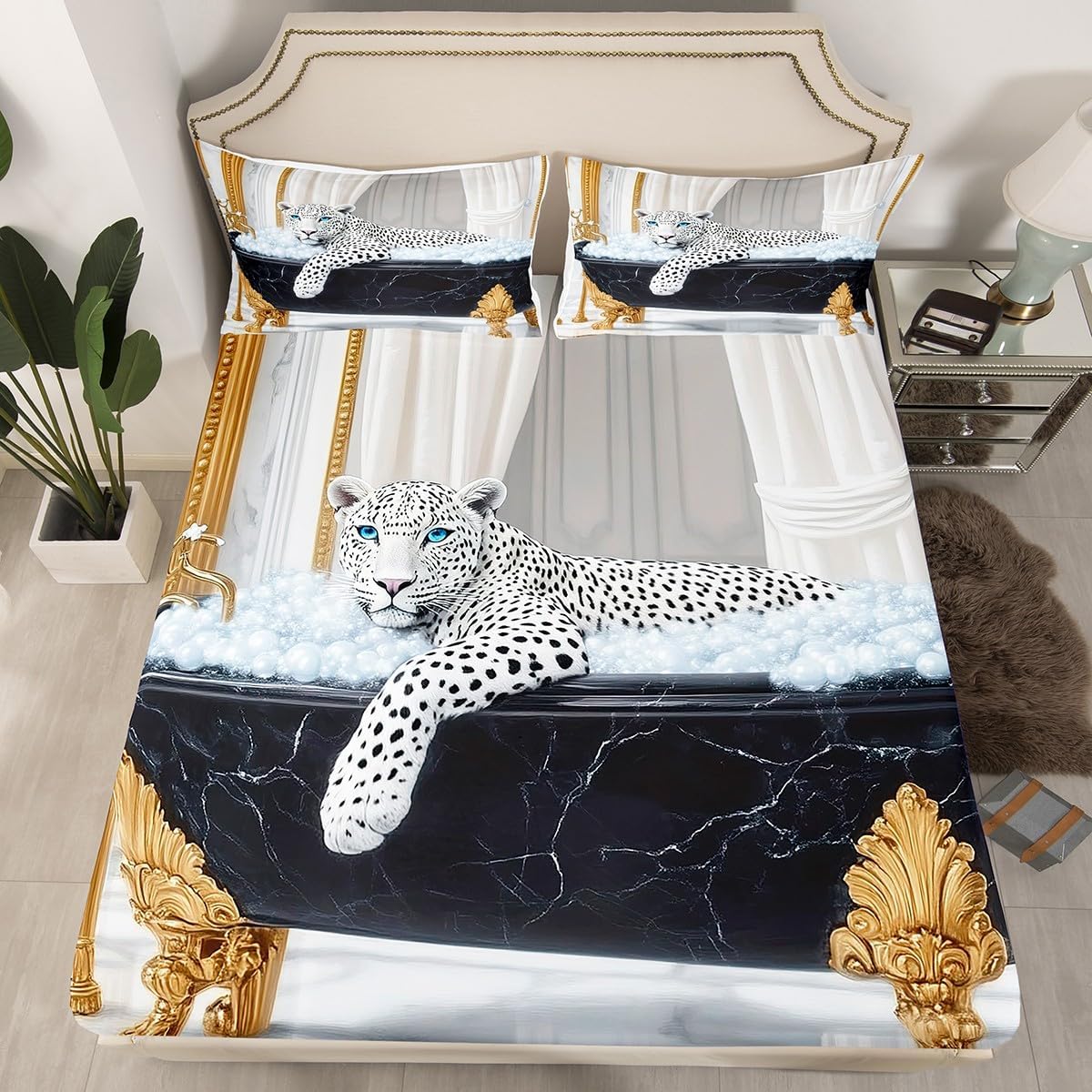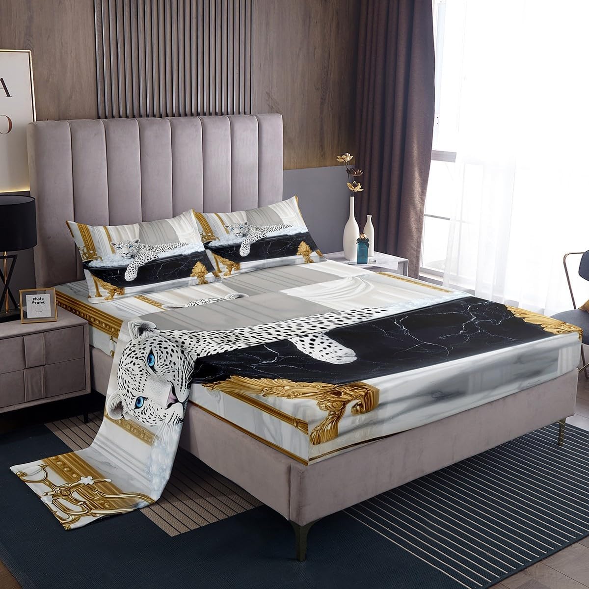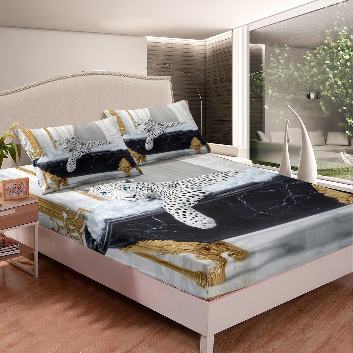 Manfei Snow Leopard Bed Sheet 4 Piece,Natural Wild Animal Cheetah White Leopard Fur Print Sheets Full Size Bed Set,European Style Bathtub Luxury Bedding Set with Flat,Fitted Sheet,2 Pillow Cases