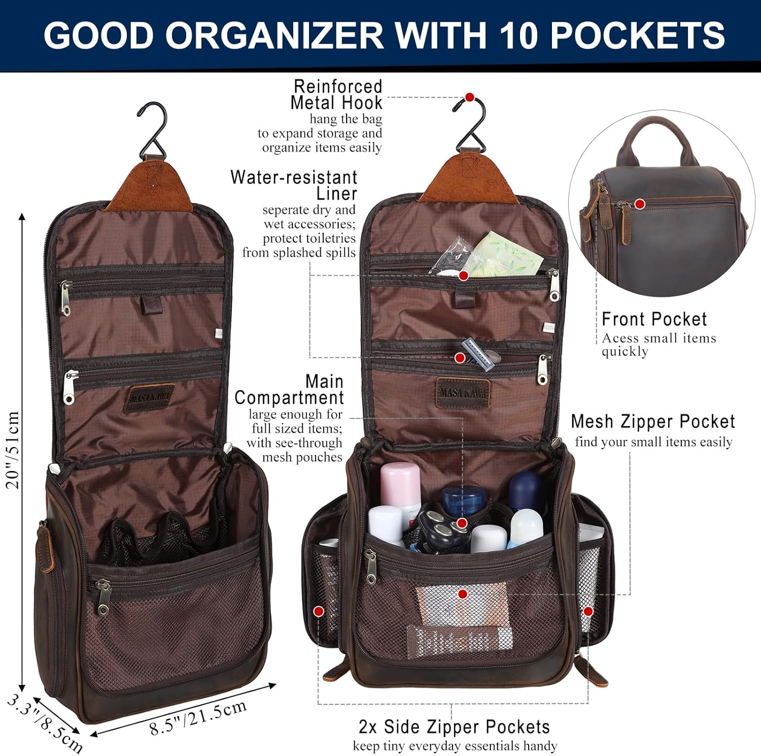 ?Quality Materials? Toiletry bag for men, crafted of 2mm thick full grain leather, processed with crazy horse leather tech to enhance durability and keep original pores and texture of cowhide, rough rugged look being good match to masculine style; Outfitted with ykk zippers and metal hook to to withstand long-lasting use of traveling; Water-resistant liner, easy to wipe clean, to separate dry and wet items, and to protect the toiletries from common bathroom splashed spills.n?Expandable Storage with Hanging Hook?The storage of the toiletry kit can be expanded after hanging. Totally with 10 divisions: 1 main compartment, 3 inner zip pockets and 3 mesh pouches, 2 external side pockets to neatly organize and easily access your cosmetics, makeup, and toiletries. Size: 8.5