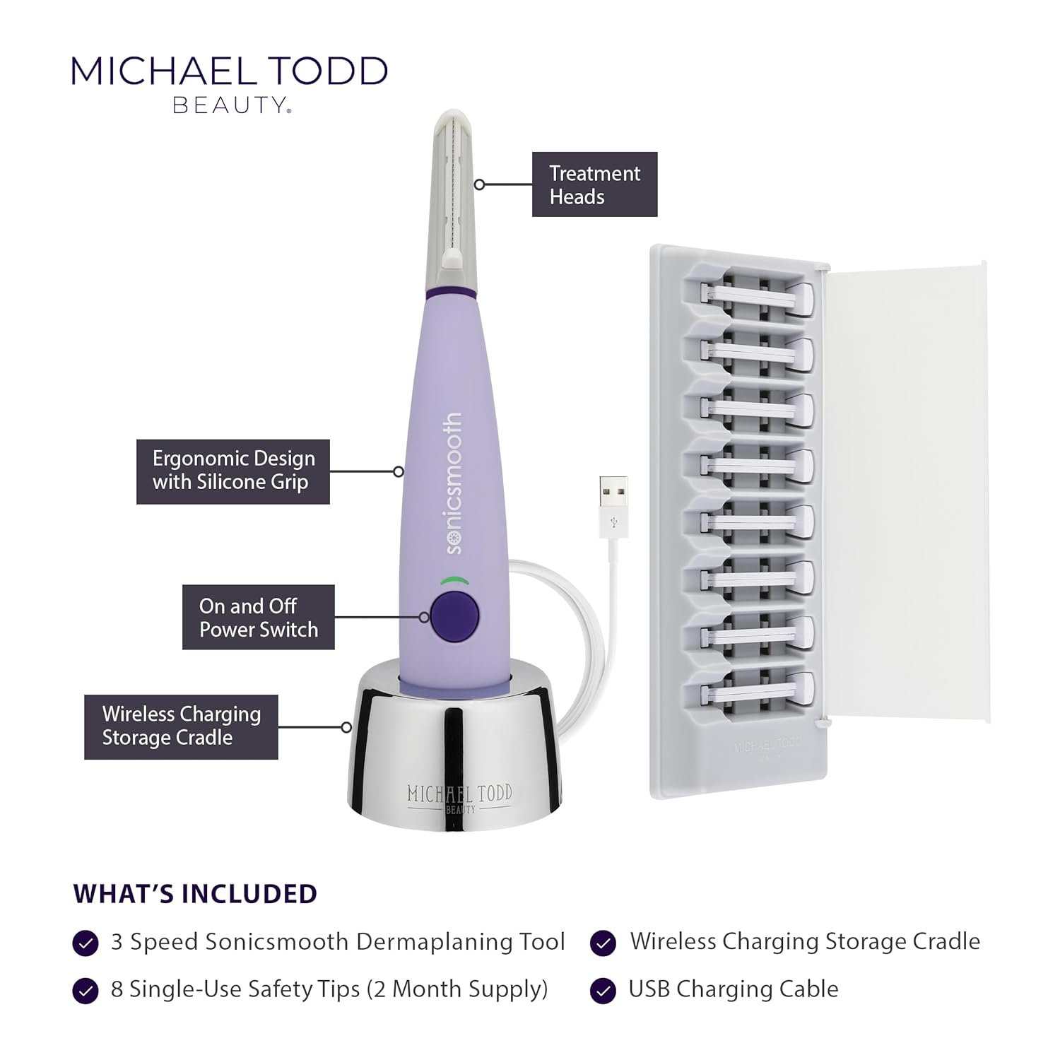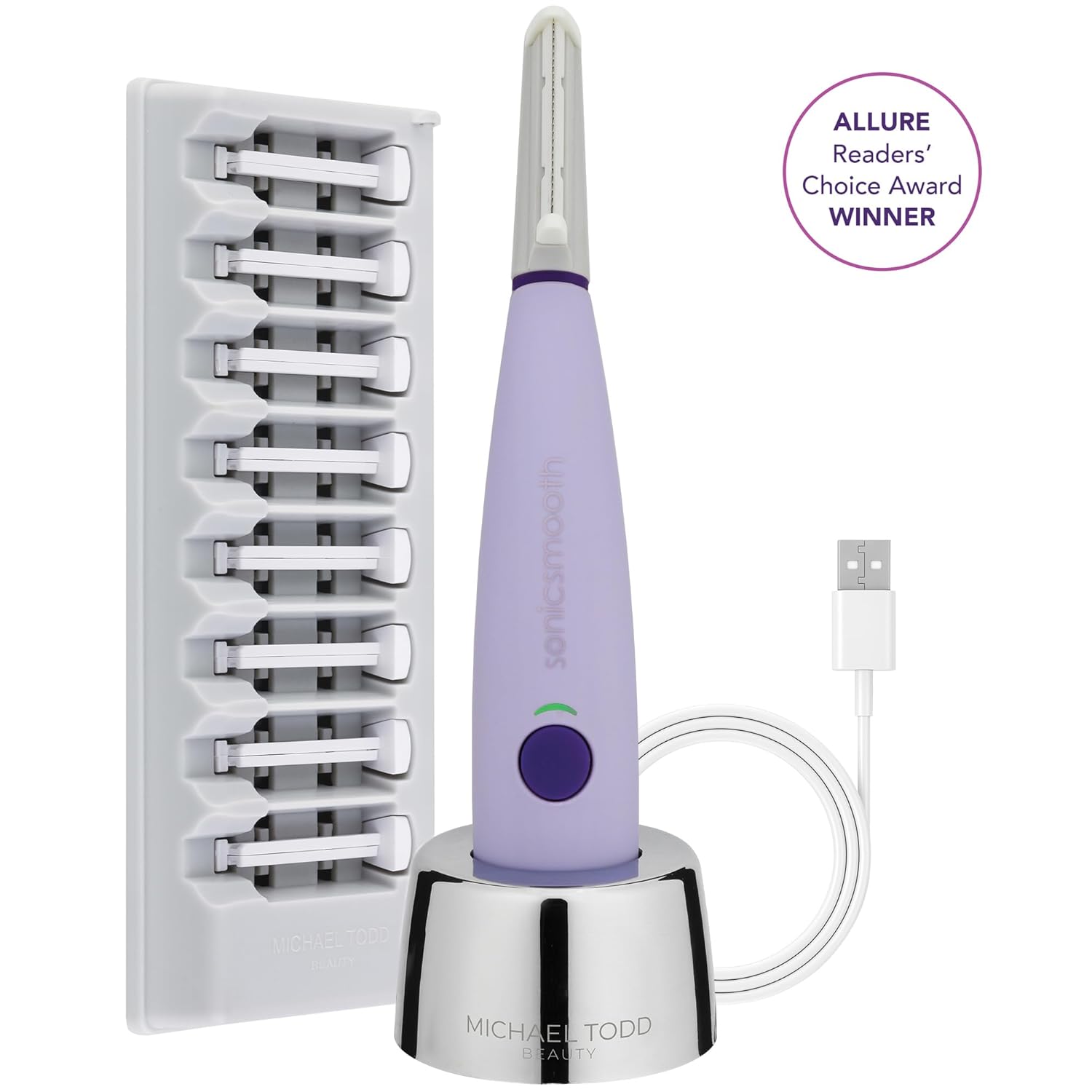 SONICSMOOTH – Experience the instant transformation to youthful, smoother, softer, and radiant skin with Michael Todd Beauty’s award-winning, at-home sonic dermaplaning system. Now with 3 times more sonic power, Sonicsmooth delivers unparalleled results. Dermatologist approved, it offers quick, easy, and painless exfoliation, along with effective peach fuzz removal.nPERSONALIZED SKIN CARE – Unlock the secret to a renewed and luminous appearance with Sonicsmooth – your ultimate beauty companion for achieving visibly rejuvenated skin and a seamless makeup finish. This innovative dermaplaning tool not only exfoliates away dead skin and removes unwanted facial hair, but it also works wonders in reducing fine lines and wrinkles, revealing a youthful radiance like never before.n3 CUSTOMIZABLE SPEEDS – Indulge in the personalized experience of Sonicsmooth’s 3 customizable speeds, designed to cater to your skin’s unique needs and ensure optimal comfort during your dermaplaning session. Plus, enjoy peace of mind with the included 8-week supply of stainless steel safety edges.nEASILY RECHARGEABLE – Travel-friendly and safe for carry-on luggage, Sonicsmooth grants you the freedom to move and prioritize your skincare wherever you go with its built-in rechargeable battery. Enjoy up to 3 hours of cord-free operation after an initial 12-hour charge. Say farewell to being tied to a wall and embrace the convenience of uninterrupted skincare.nHOW TO USE – Achieve smooth, flawless skin by following these simple steps. After cleansing and drying your face, gently glide Sonicsmooth over the desired treatment area using short, gliding motions. This will effectively remove unwanted facial hair and exfoliate dead skin cells. For best results, it is recommended to avoid applying makeup directly after using this device.