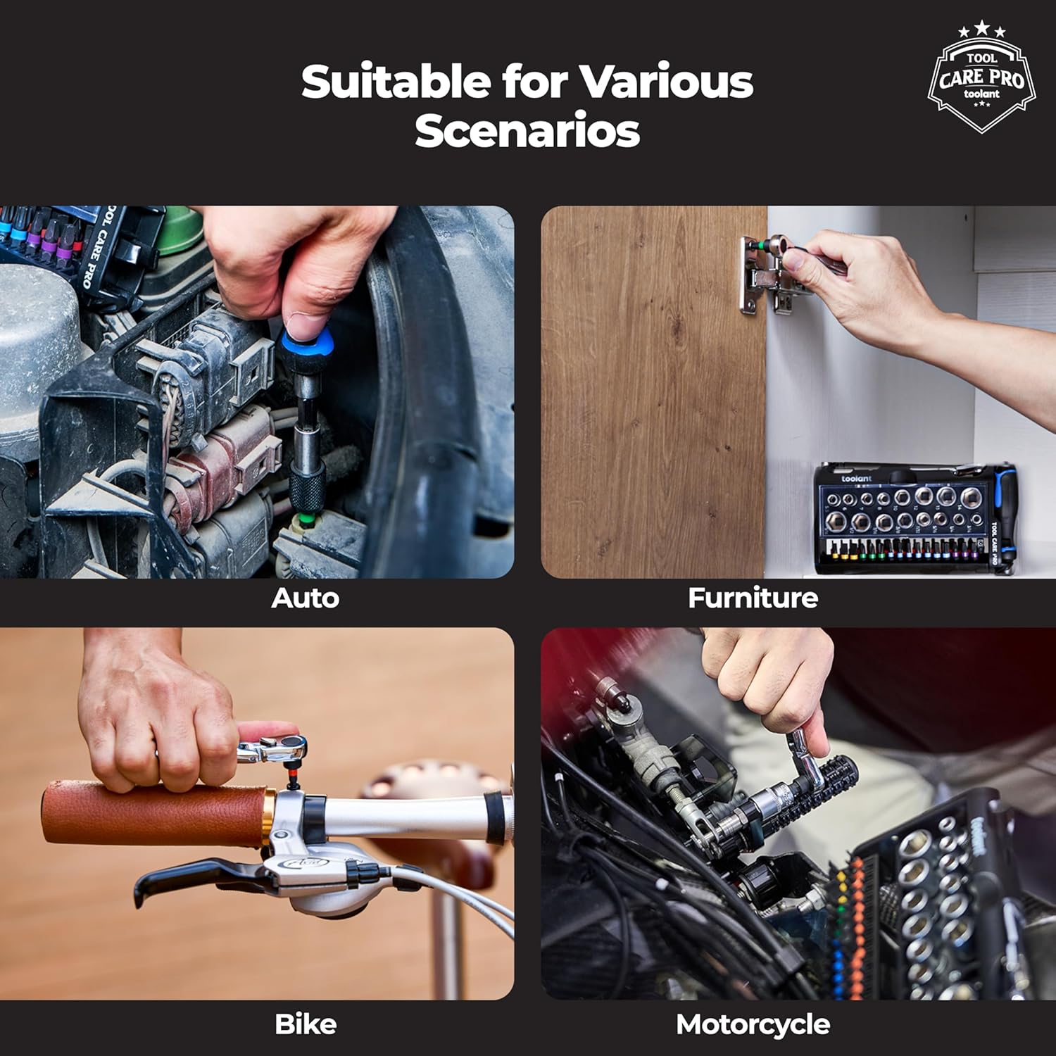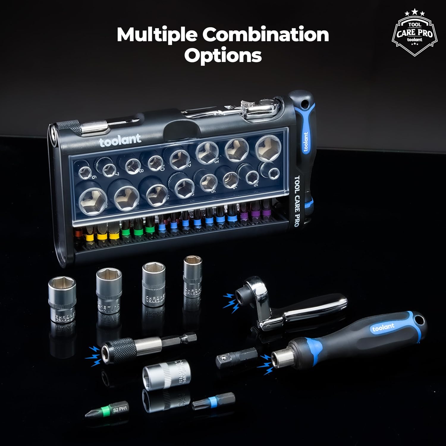 About this itemnA complete mini ratchet set with socket and screwdriver bits to meet your daily needs. All the bits are made of S2 alloy steel, which is characterized by its high wear resistance. Suitable for household appliances, repairing bicycles, furniture, automotive, industrial machines, computers, electronics repair, hobbies, toys and crafts, DIY home improvement project, etc.n2 In 1 dual flex head 1/4 mini ratchet wrench can be used in even the tightest spaces and close quarters, especially in awkward places like U shape corner. The mini ratchet wrench constructed with high quality chrome vanadium steel for prolonged use and product longevity, polished for corrosion and rust prevention.nScrewdriver bit size – Phillips(1*PH1*3, 1*PH2*3, 1*PH3*3, 2*PH1*1, 2*PH2*3, 2*PH3*2), Square(S1, S2, S3), Slotted(SL3/16), Hex Metric(H2.5, H3, H4, H5, H6), Hex SAE(3/32, 1/8, 5/32, 3/16, 1/4), Torx(T10, T15, T20, T25, T27, T30, T40). Socket bit size – 1/4 DR gear lock sockets(3mm, 4mm, 5mm, 6mm, 7mm, 8mm, 9mm, 10mm, 11mm, 12mm).nA compact designed sturdy blow molded tool case is included with designated slots and imprinted sizes for every bit and socket, help you always stay neat, organized and prepared. Foldable design for easy carry and store,nPerfect EDC gift for man, father, son, boyfriend, etc. Torque in ONE set! 42pcs mini ratchet wrench with daily use socket and screwdriver bits meet all you needs in home improvement. If you are not fully satisfied for any reason, please feel free to contact us via Amazon for 100% refund or replacement.n See more product details