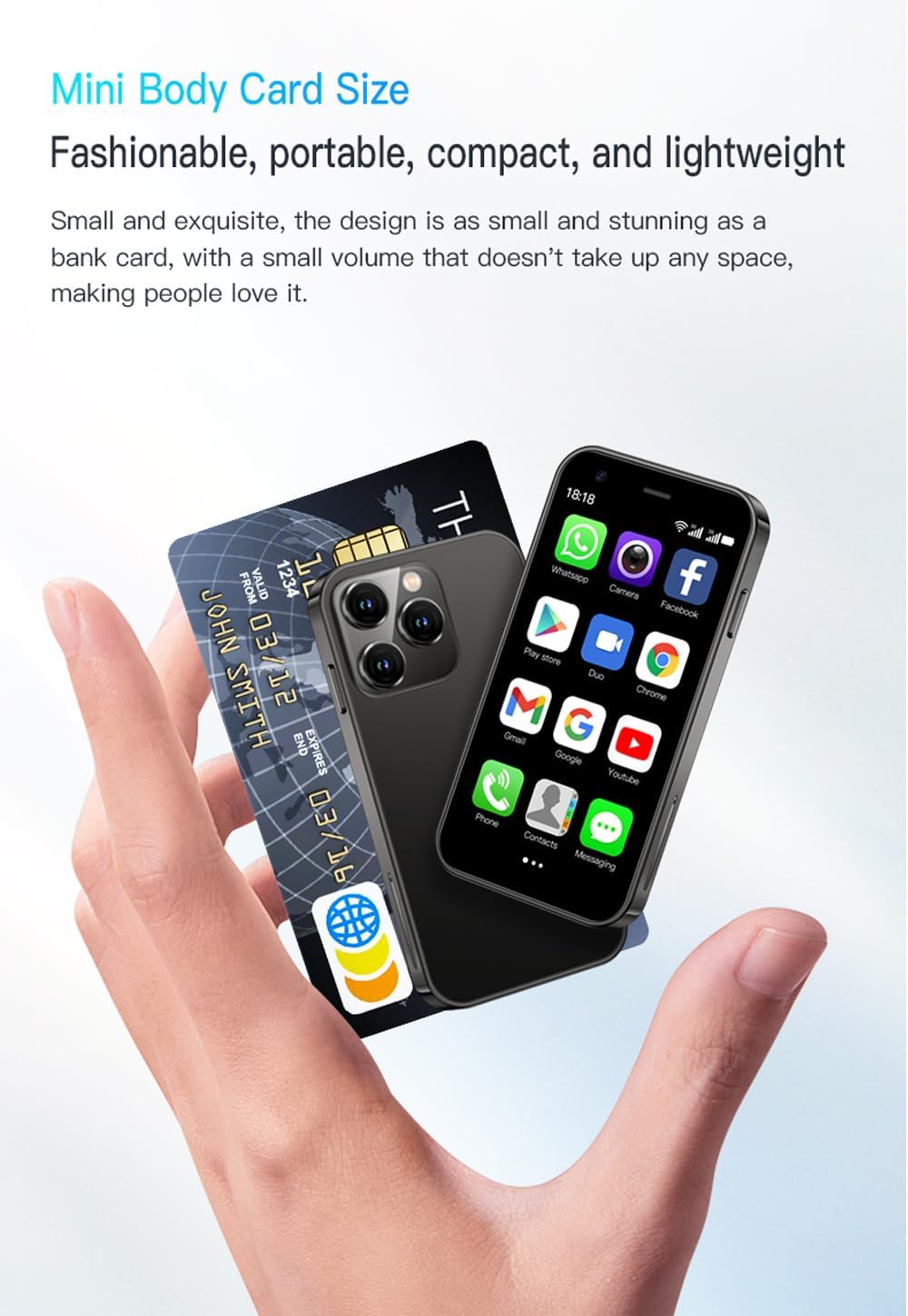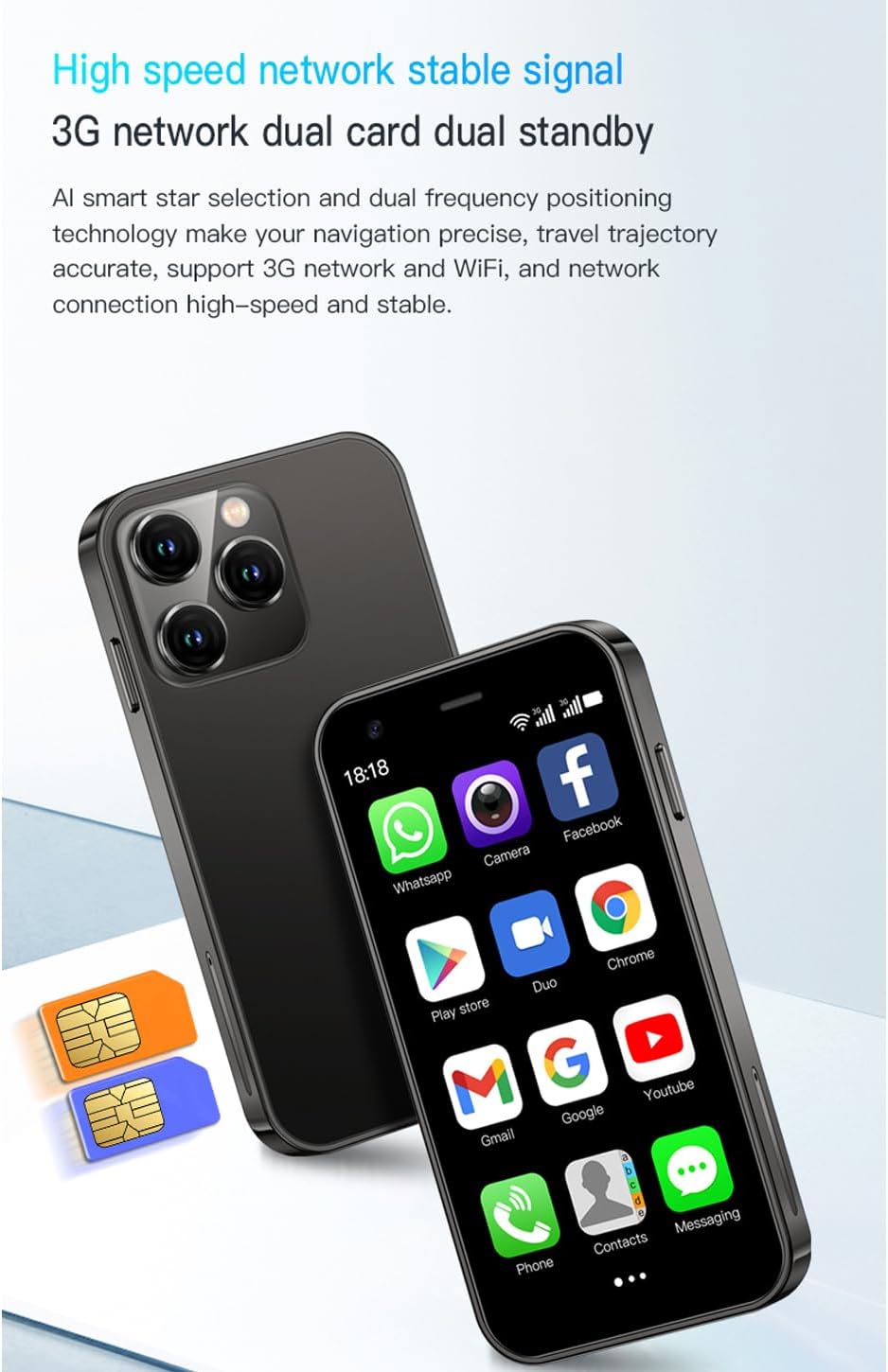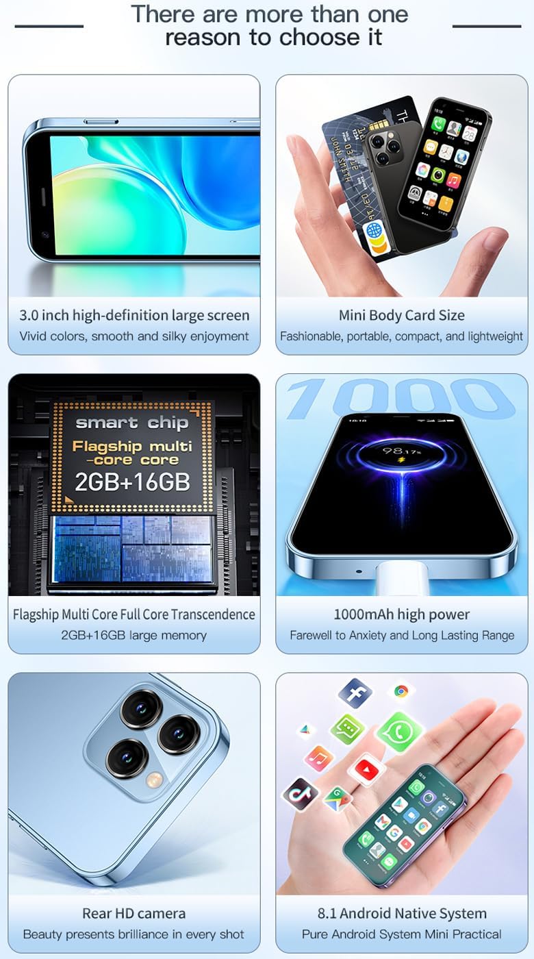 About this itemnSUPER 3G Mini Smartphone: As a smartphone, you can use it like any other mobile phone, browsing the Internet anywhere and using Google Play Store to download apps. Frequency: GSM: 850/900/1800/1900; WCDMA: B1/B2/B5/B8.nTiny But Functional: The mini smartphone supports voice calls, video calls, camera, recording, email, MP3, GPRS, FM radio, touch screen, GPS navigation, message, SMS, MMS, video player, memory card slot, Internet browser, Google map, etc.nSupport Most Apps: This unlocked mobile phone supports most apps in Google Play Store such as Facebook, Youtube, Instagram, Whats app, Tiktok, Twitter, etc.nGreat Gift for Kids: It’s soo Cute and Functional, suitable for kid’s hands. Children will be fell in love with it’s MINI, FUNCTIONAL, CUTE, EASY CARRY, INTERESTING. It has three color you can choose: Black, Purple and Blue. It will be an indispensable gift for children in the Festival.nGood Backup Phone: Dual Sim Dual Standby, meeting your daily use needs. When you go cycling, hiking, traveling, mountain climbing, seaside vacation, the advantages of lightness and portability are reflected. It meets your daily needs, while having a smaller size, so that your backpack is no longer heavy and your Life is easier.nAll under control by single hand: Very suitable for our palm which makes you feel comfortable from all sides due to our high tech artwork and precise design.