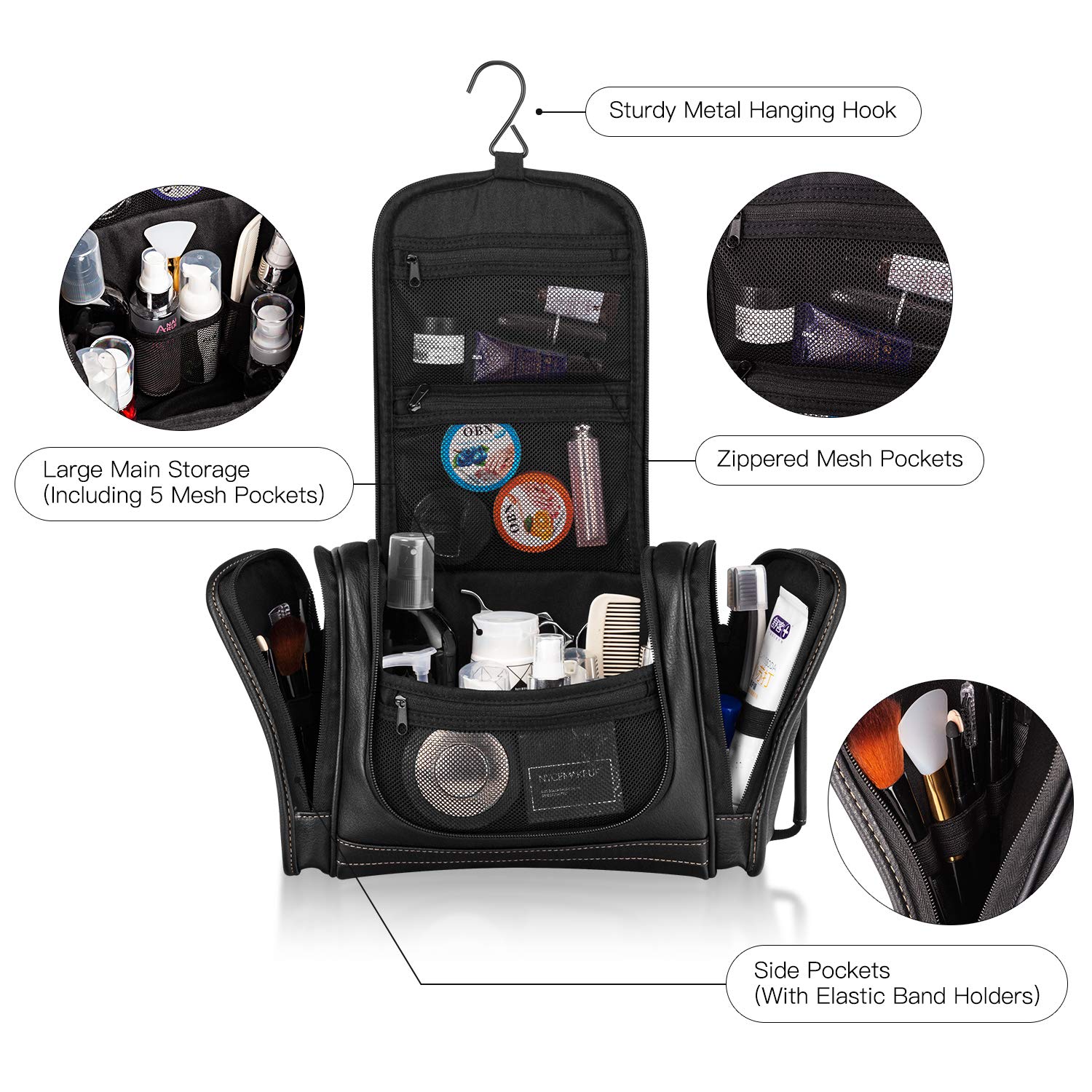 Plenty Room for Storage — This dopp kit features a main compartment for large items such as shampoo bottles or shaving cream. Equipped with 3 zipper mesh pouch, 5 mesh pockets and 2 side pockets with 5 elastic loops, this is the ultimate men toiletry organizer bag.nLeather & Waterproof Lining — This exceptional toiletry bag by MIRASON is made of high grade hard-wearing PVC leather, with nylon inner lining and water resistant inner bottom. Easy to clean and 100% leak-proof.nMultiple Use — It can be hung on the door or other indoor and outdoor places with the sturdy metal hook. With the quality durable fabric,this travel toiletry bag can remain in shape and sit on the counter even empty. Easy to carry with the creative thickened handle, suitable for daily use or travel.nLarge Capacity — Shower travel bag size: 11.5