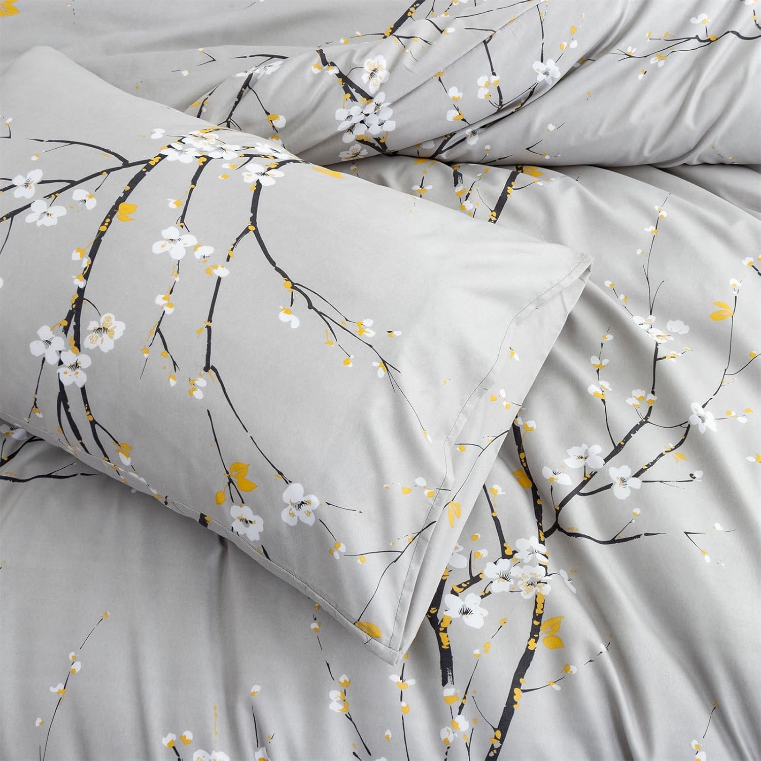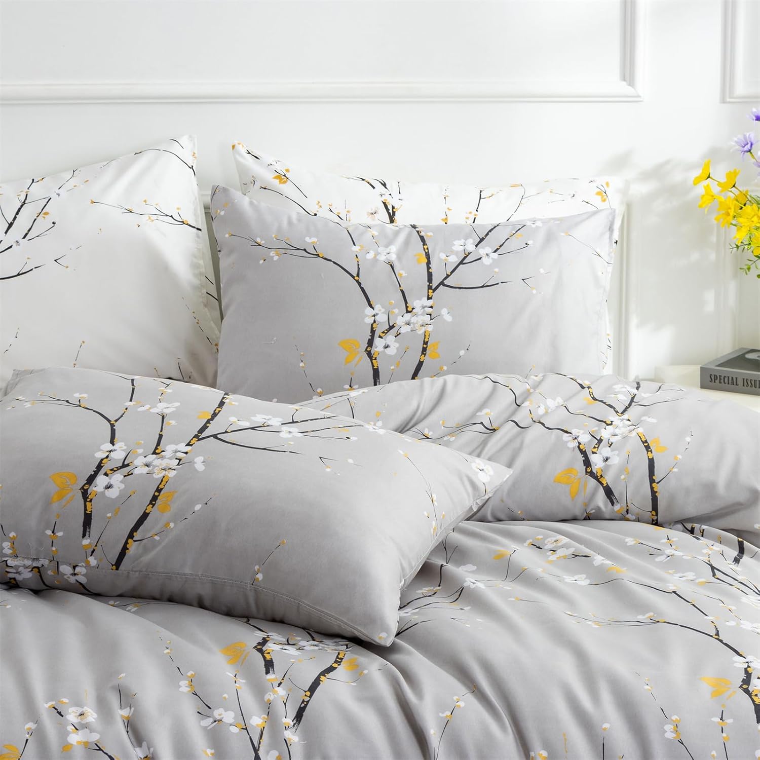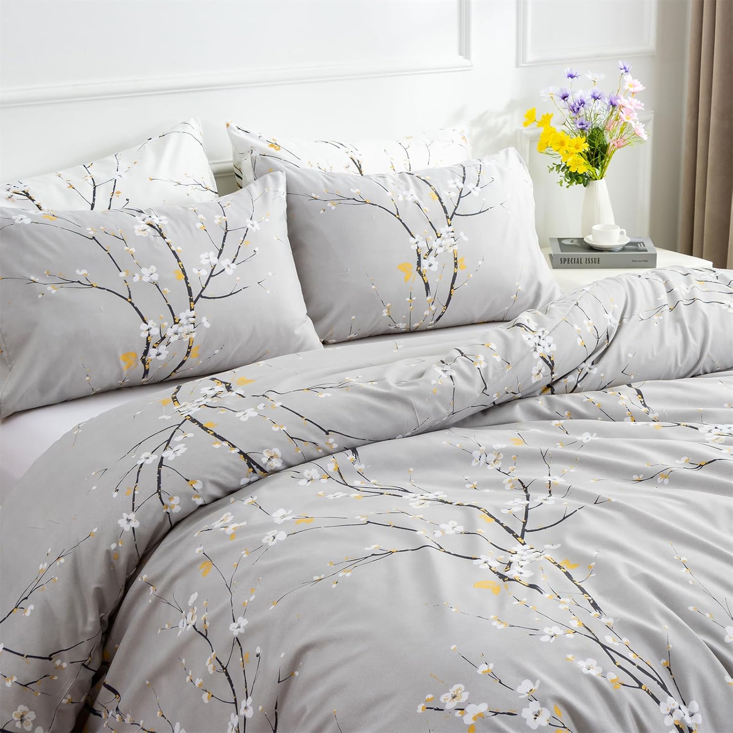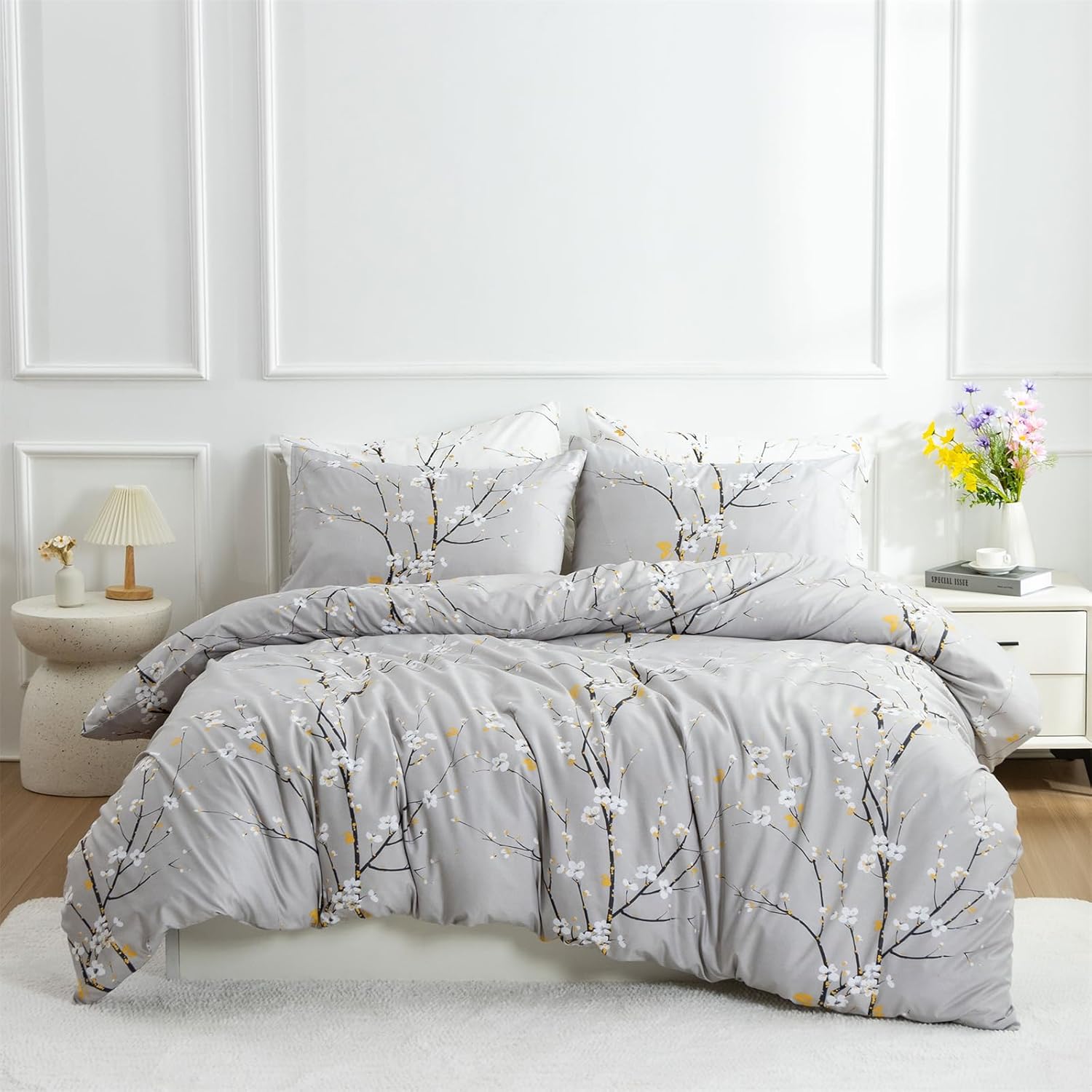 mixinni Grey Comforter Set Twin XL Size-Tree Branch Bloom Flower Pattern Printed Bedding Sets Cute Floral Soft Fluffy Comforter with 2 Pillowcases, Botanical Bed Set for All Season