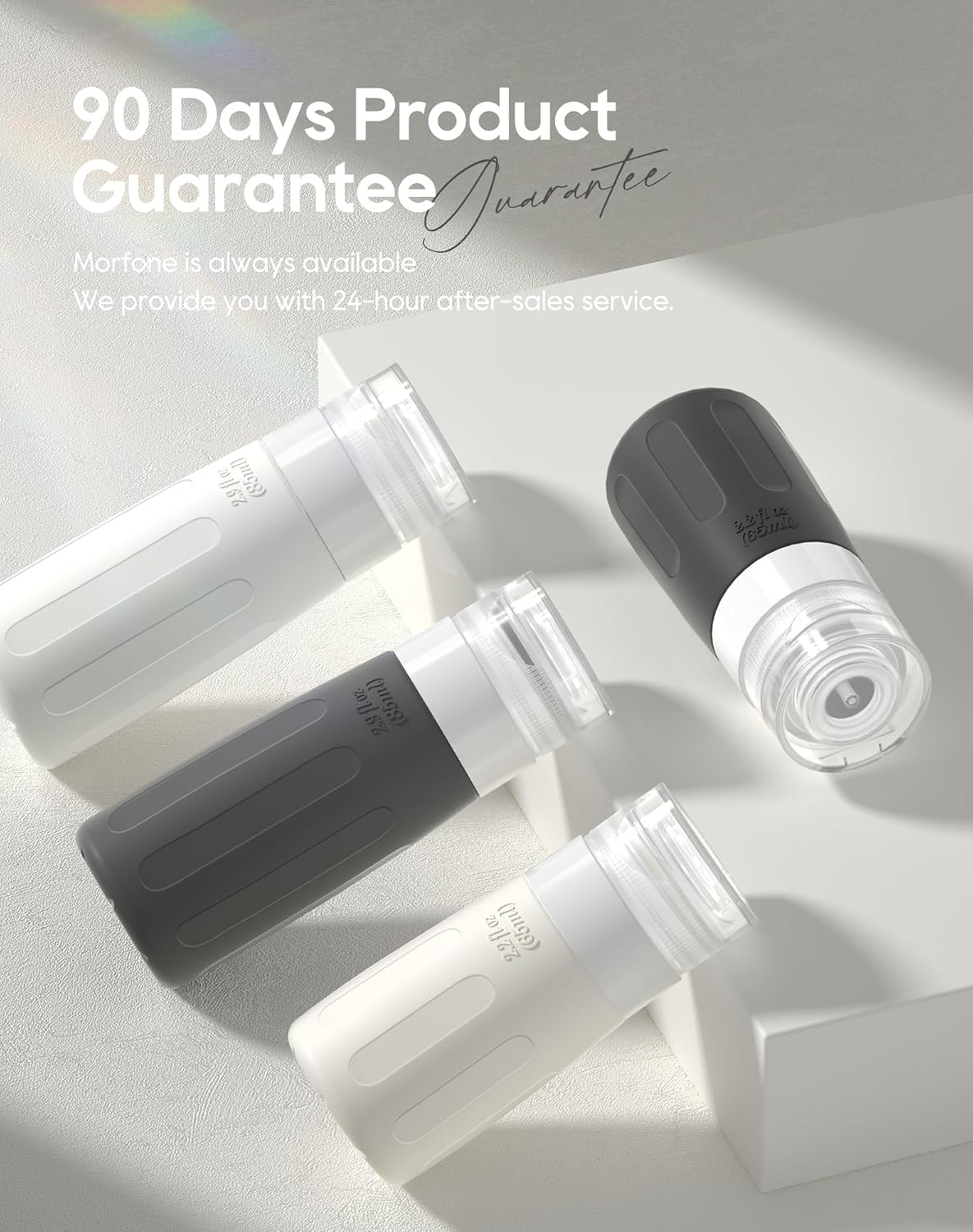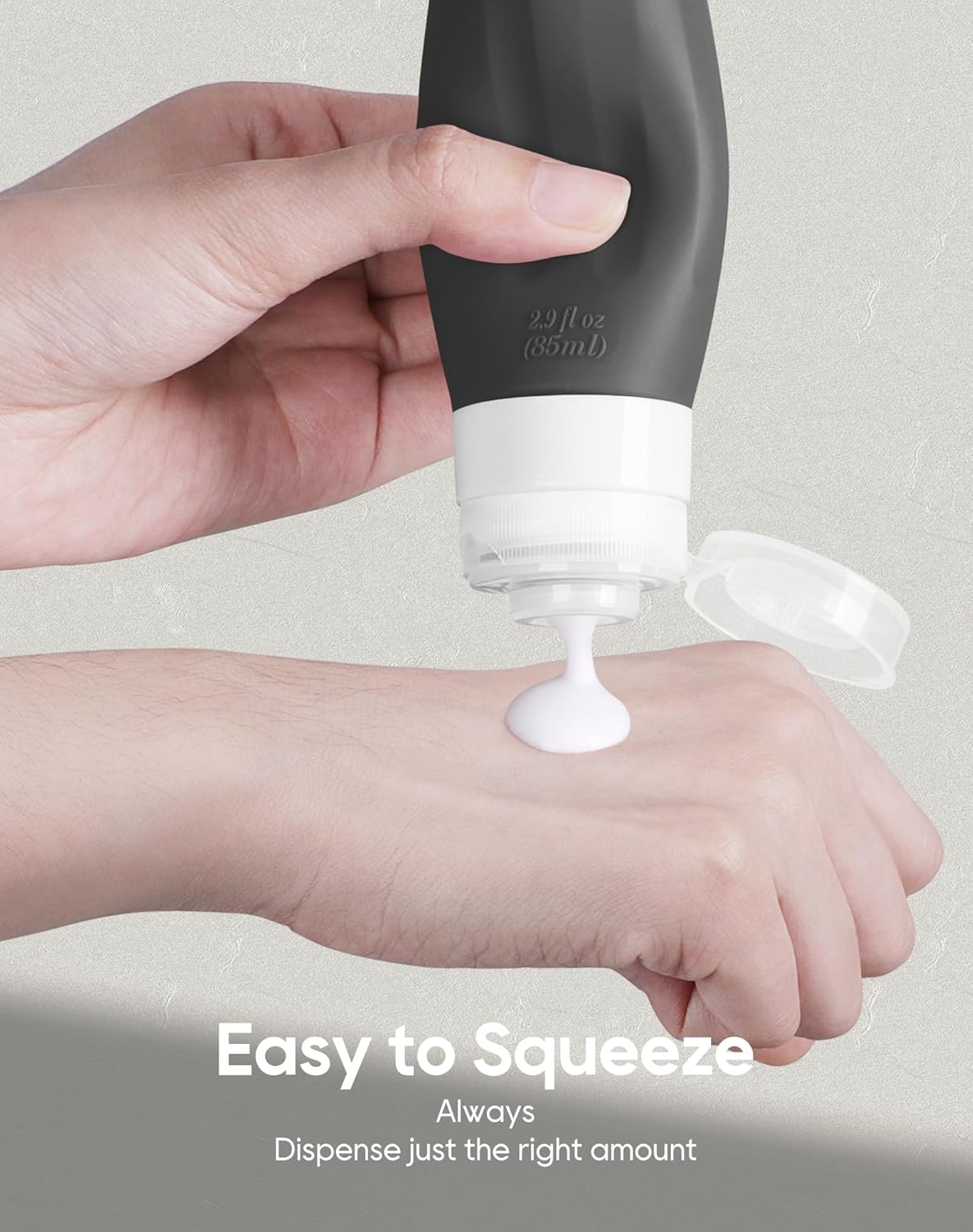 PORTABLE TRAVEL ACCESSORIES: Would you want to make your life simpler, more organized when traveling? Then this classic travel bottles set are the best and latest thing you should have. It comes with high quality upgraded zip bag + 4 Bottles + 4 Jars + 2 Spray Bottles + 2 Spoons + 1 Funnel + 1 Clean Brush + 1 Page Label. Believe us, it would be a fantastic set for your vocationsnLEAK PROOF & WIDE MOUTH DESIGN: With 3 layer cover design, the travel containers prevent your luggage and clothes from messing by leaking liquid during transportation. The wide opening design will make your travel set easy to pour in liquids and help you get the last drop without wastingnEASY TO CARRY: This travel size bottles are lightweight, portable and meets the standards of TSA Approved, which provide you confidence to pass the security check. Perfect for travelling and excellent as gifts for your families, friends or business partnersnSAFE SILICONE MATERIAL: Made of Food Grade BPA Free Silicone, this travel set is sturdy, soft, squeezable, flexible and reusable. Safe material guarantee that you can not only use them to store shampoo, conditioner, face soap, sunscreen, creams, lotion or etc, but also safe for food, various seasonings. Soft silicone body make you squeeze out contents easilynMUST-HAVE TRAVEL KIT: This travel size toiletries bottles includes all necessary containers, which will fit together nicely to take up less room in your luggage, giving more room for souvenirs! The classic black and white are suitable for men and women, and will never be out of date no matter when and where. It is ideal for inside or outside activities
