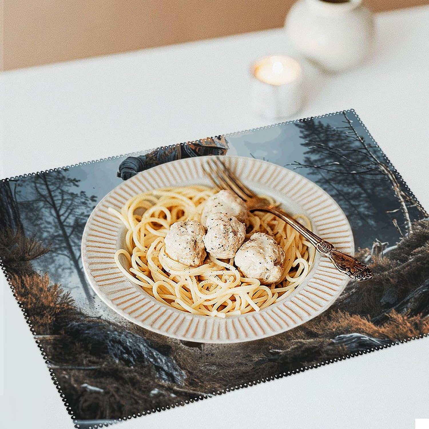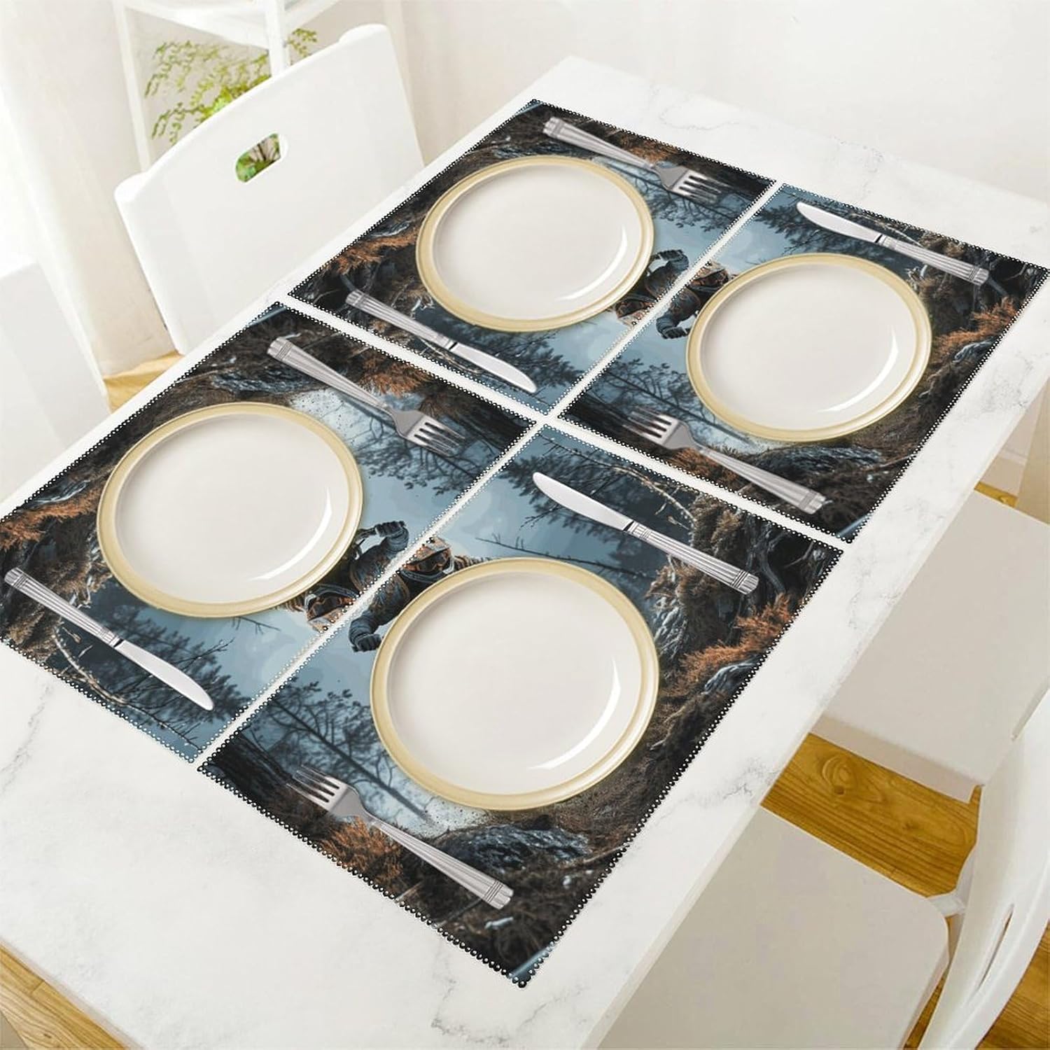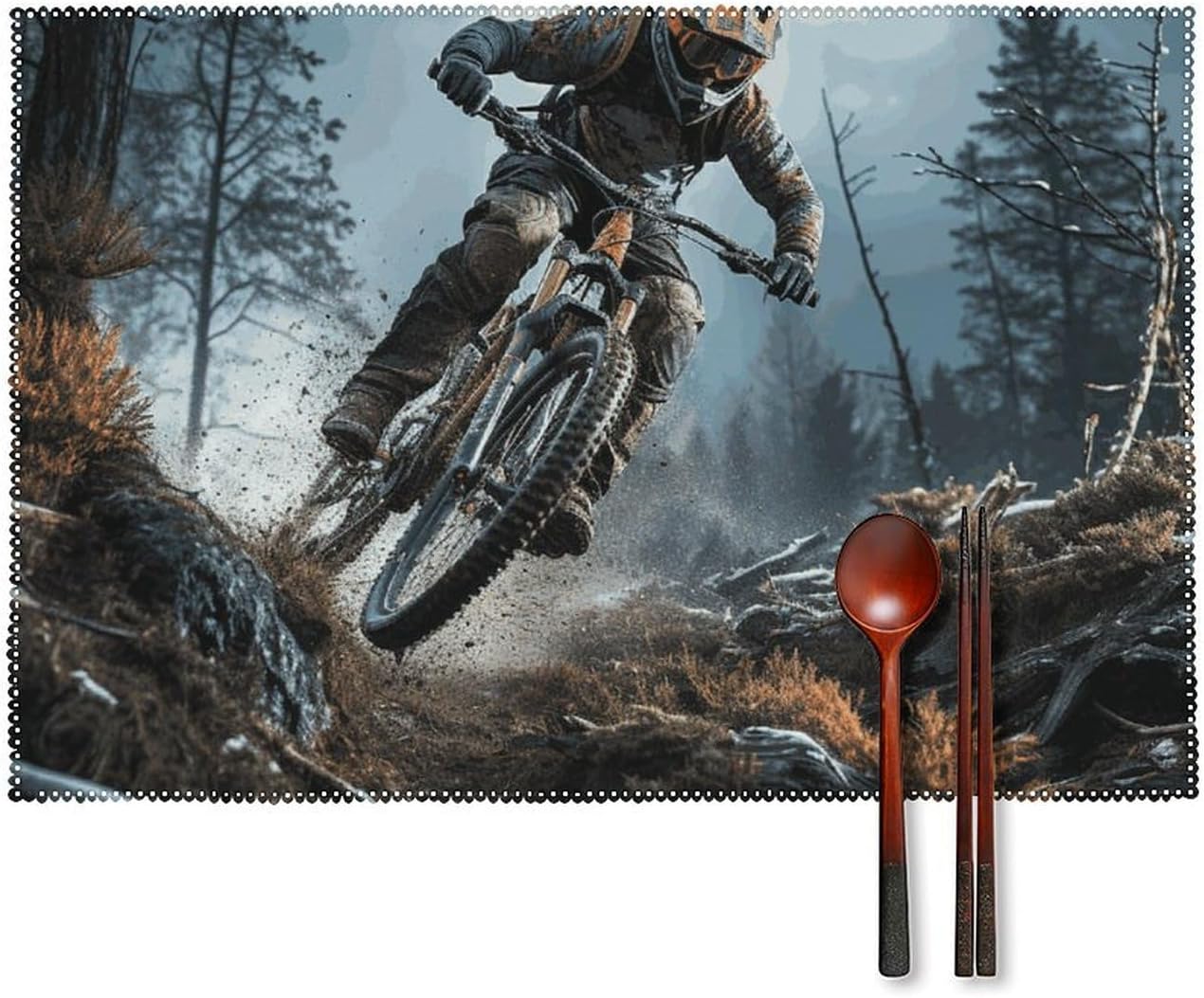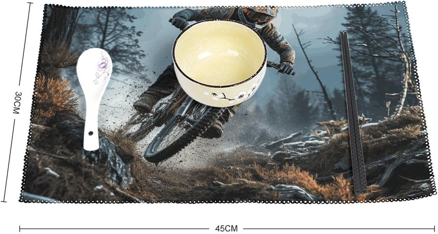 About this itemnPerfect Protection: Crafted from high quality canvas fabric, the Mountain Bike Tournament table protector is thick, protecting your tables and furniture from hot dishes, stains and scratches.They provide a non-slip surface, resist fading, and are easy to clean, elevating your dining experience.nMeasurements: Each package includes 4 pieces of placemats measuring 17.7 x 11.8Inch.If there is any problem,please contact us, our customer support team is always ready to help you. It is suitable for all hot drinks and plates, protect your dining table from scalding.nGreat Gift Idea: The stylish placemats set makes s great housewarming, wedding or birthday gift. They are quality assured, practical, stylish, and add a touch of elegance to any home. Add style to your dining setting while ensuring table protection.nVersatile Uses:Our placemats can be used as nice accessories to match your different decor purposes such as table mats, pot holders, coasters, laptop pads, etc. The rustic and neutral design fits any occasions and helps to create a warm and inviting atmopshere.nEasy to Care: Hand wash with warm soapy water or wipe dry directly; do not wash in a washing machine or use steel balls or something very difficult to clean.They provide a non-slip surface, resist fading, and are easy to clean, elevating your dining experience.