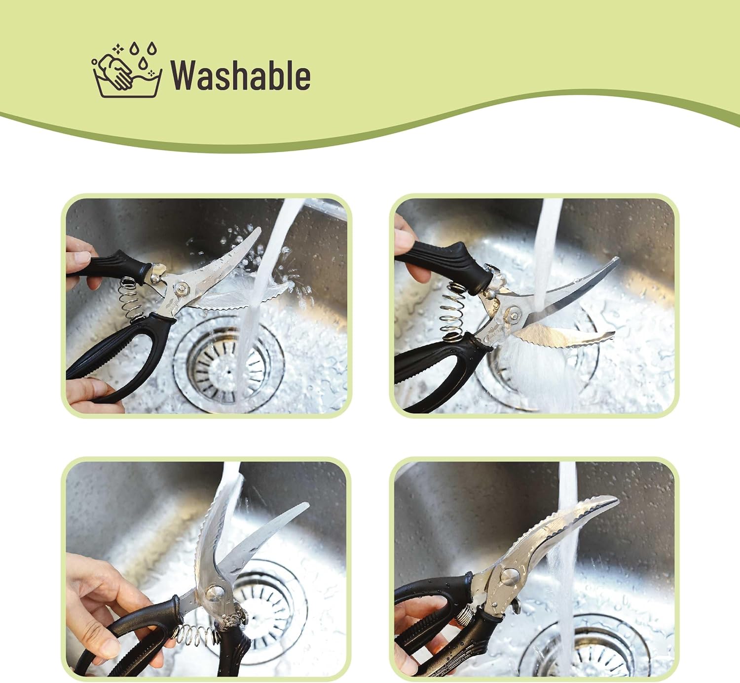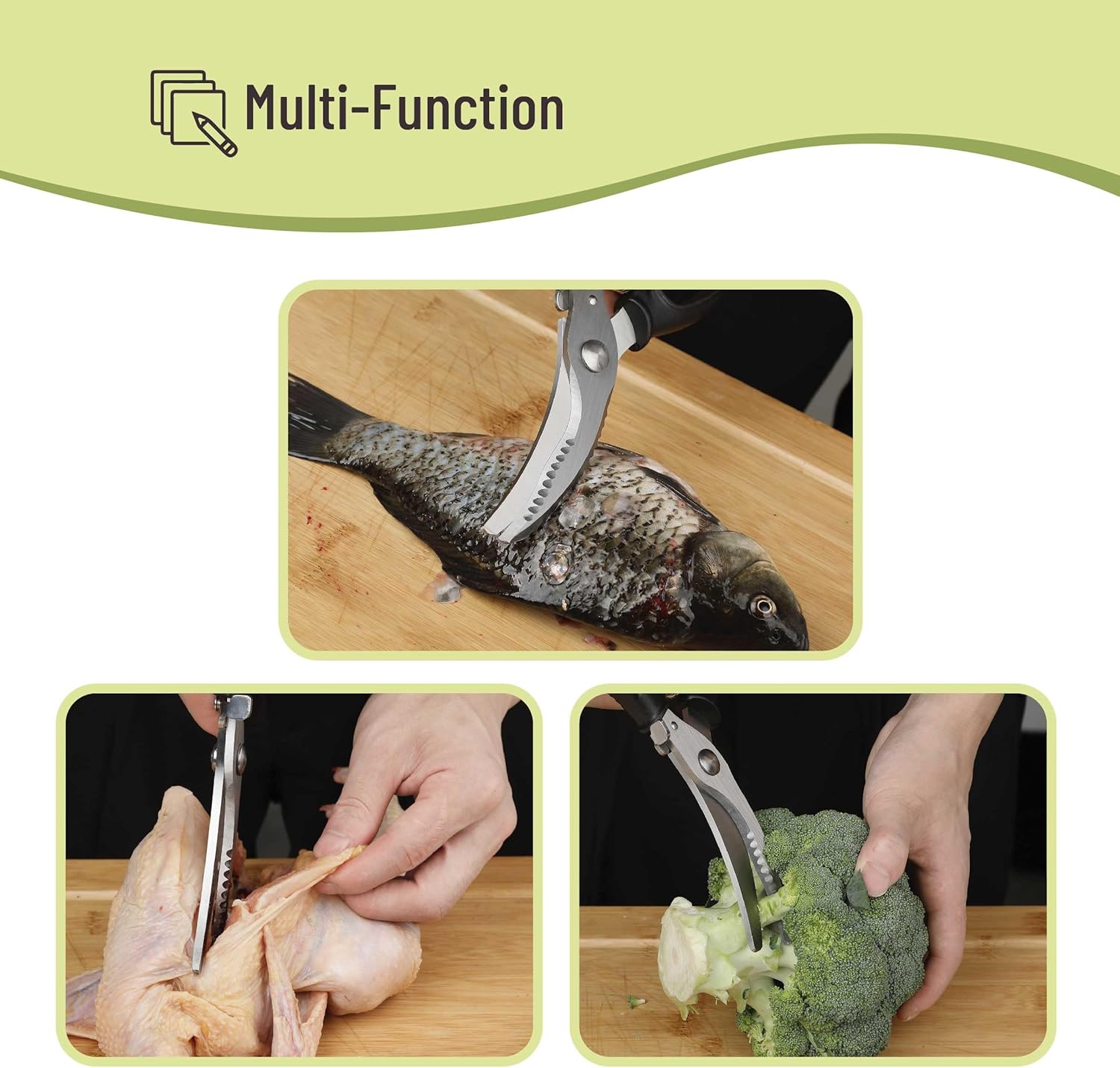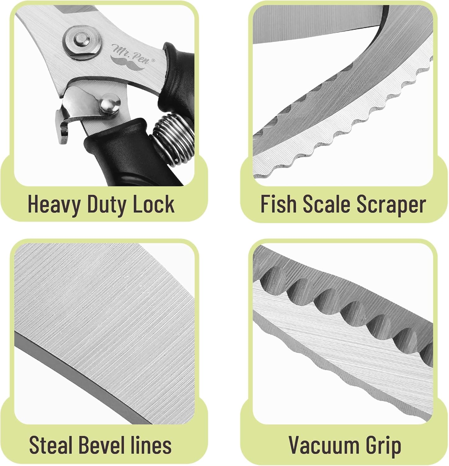 About this itemnMr. Pen kitchen scissors are designed with heavy-duty stainless steel blades, providing precise cuts and long-lasting durability for various kitchen tasks.nThese scissors feature a built-in fish scale scraper, allowing you to easily clean and prepare fish without needing extra tools.nThe ergonomic, non-slip handle ensures a comfortable and secure grip, even when wet, making them safe and easy to use.nEquipped with a steel compression spring, these scissors reduce hand fatigue, making them ideal for extended use during meal prep.nThe scissors also include a heavy-duty lock for safe storage and additional safety, preventing accidental cuts when not in use.n See more product details