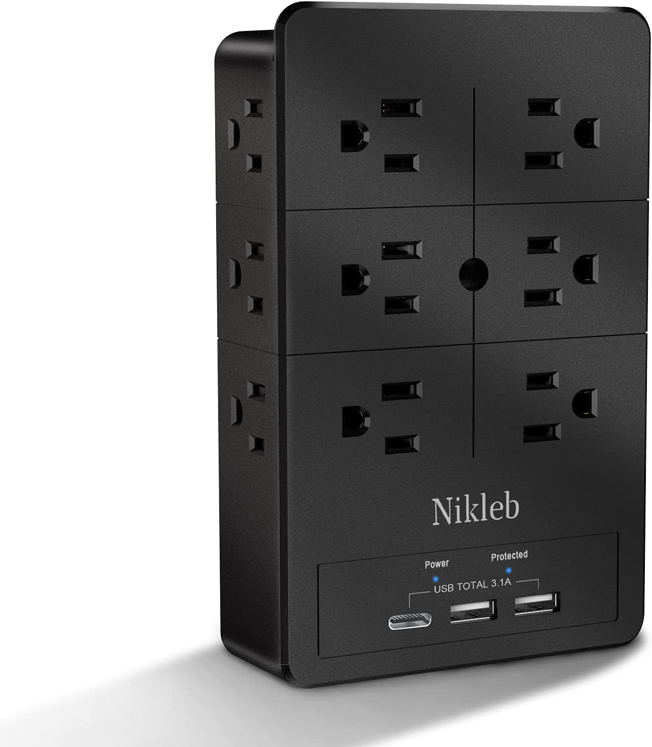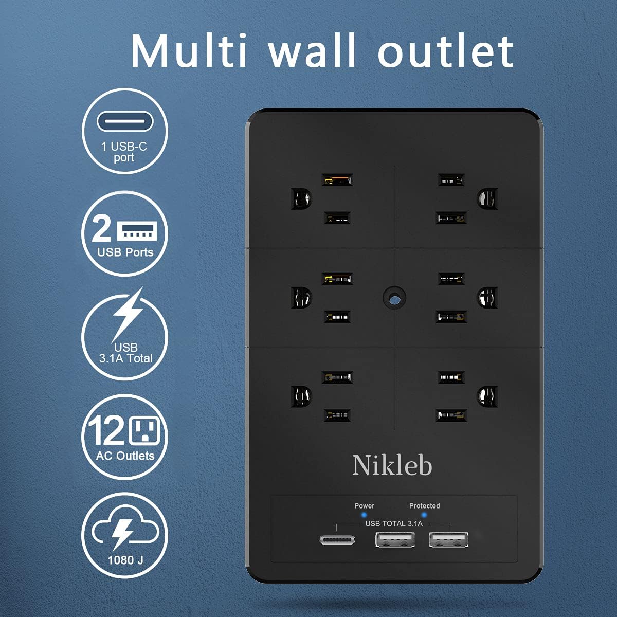Multi Plug Outlet Extender Nikleb, Surge Protector 12 Outlets, Wall Plug with 2 USB+ USB C Ports Total 3.1A, Charger Blocks Wall Mount, Outlet Splitter Heavy Duty for Home, Office, Garage Improvement