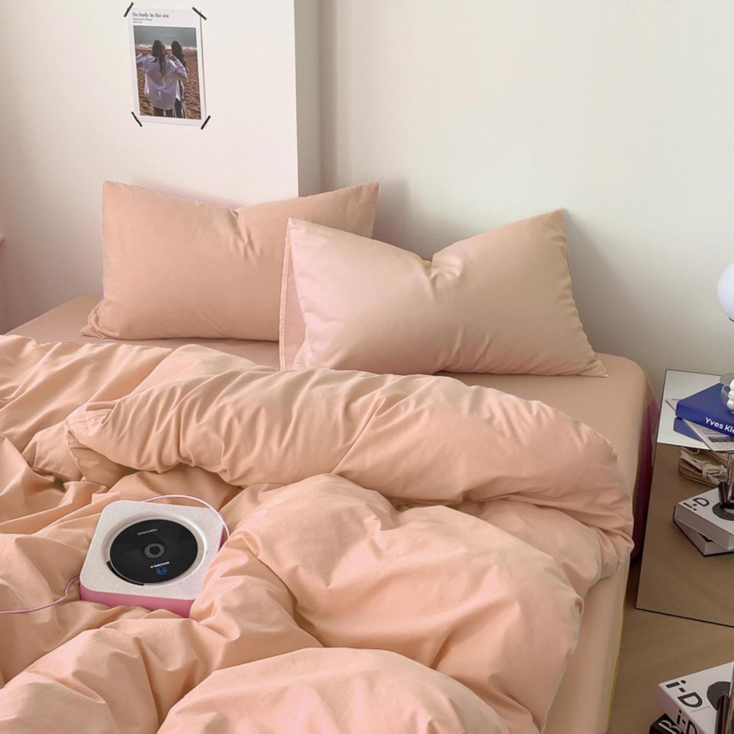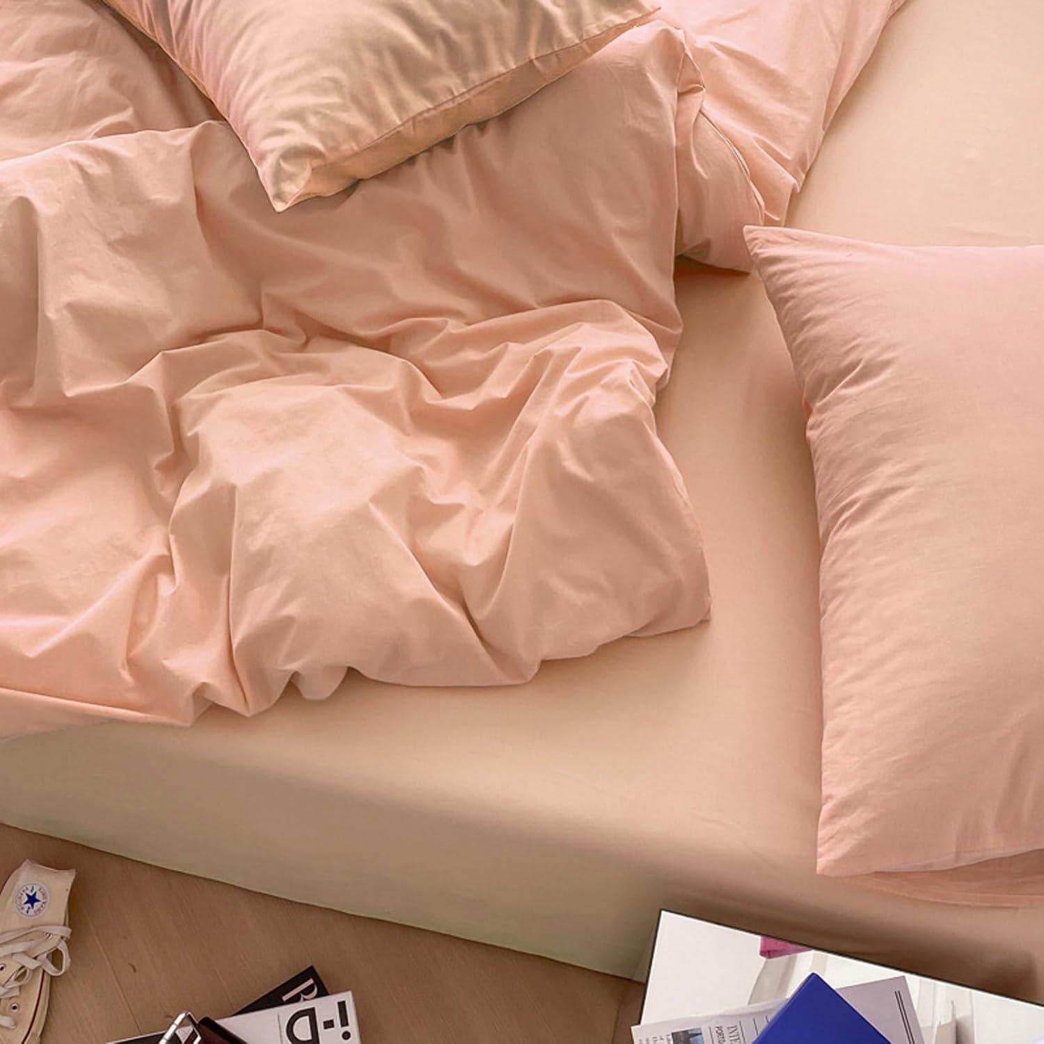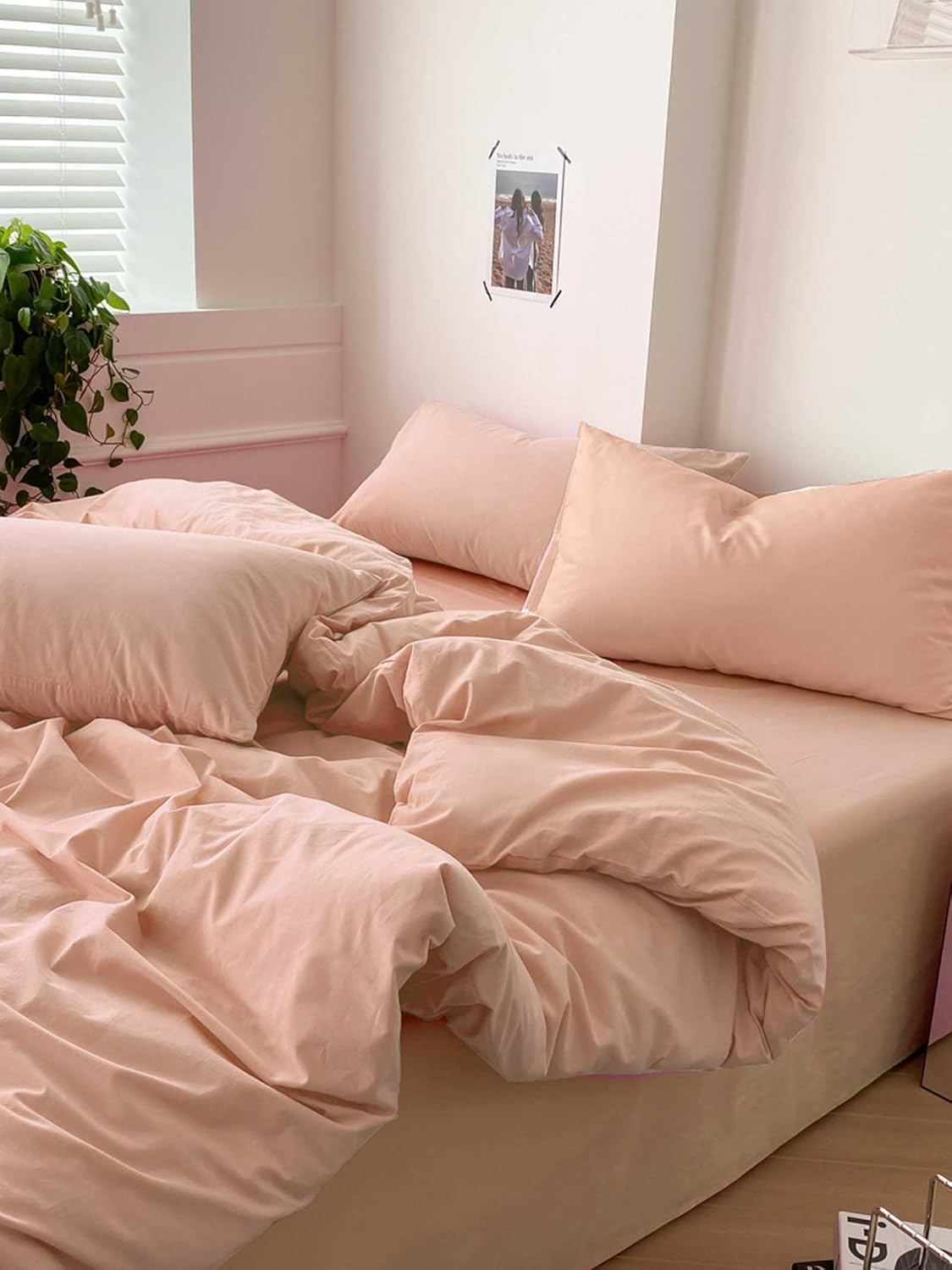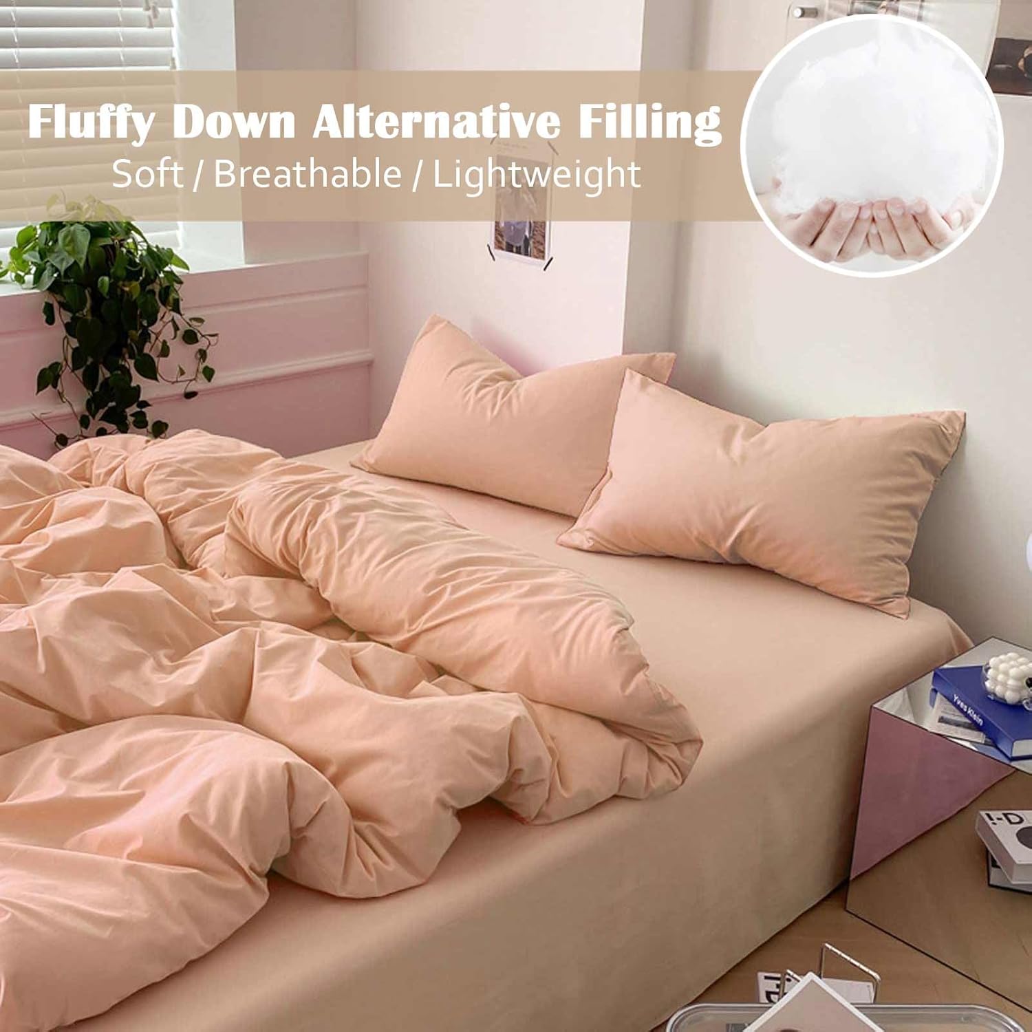 100% MicrofibernThe queen size peach coral comforter set 3 piece includes 1 duvet insert or stand-along comforter (88 x 90 inches) and 2 matching pillow shams (20 x 26 inches) Elegant Design – Stylish and modern, great for your bedding décor. You may also use this comforter set for guest room or as a gift for family members or friends to present your good taste. It is cute bedding set for men or women.nSoft & Fluffy All season comforter with down alternative filling, lightweight and fluffy. Fabrics is made of luxury brushed microfiber, giving you exceptionally soft and silky feeling. Our breathable comforter will ensure you a cozy sleep throughout the night, cool in the summer, comfortable in the spring and fall, and even warm in the winter in southern area.nDurable Our unique solid stitching for the comforter largely improve its durability, well preventing bunching.nEasy Care – Machine wash in a gentle cycle with cold water. Plus, you may secure the comforter with pre-sewn tabs to a duvet cover. With the help of duvet cover, you will be able to protect it easily for a longer period of time. You may also find matching covers in our shop.nPLEASE NOTE that upon receipt of your new bedding product, it is highly recommended to dry it in low heat or tap it gently while baking it in the sun for a few hours to make it fluffy again.