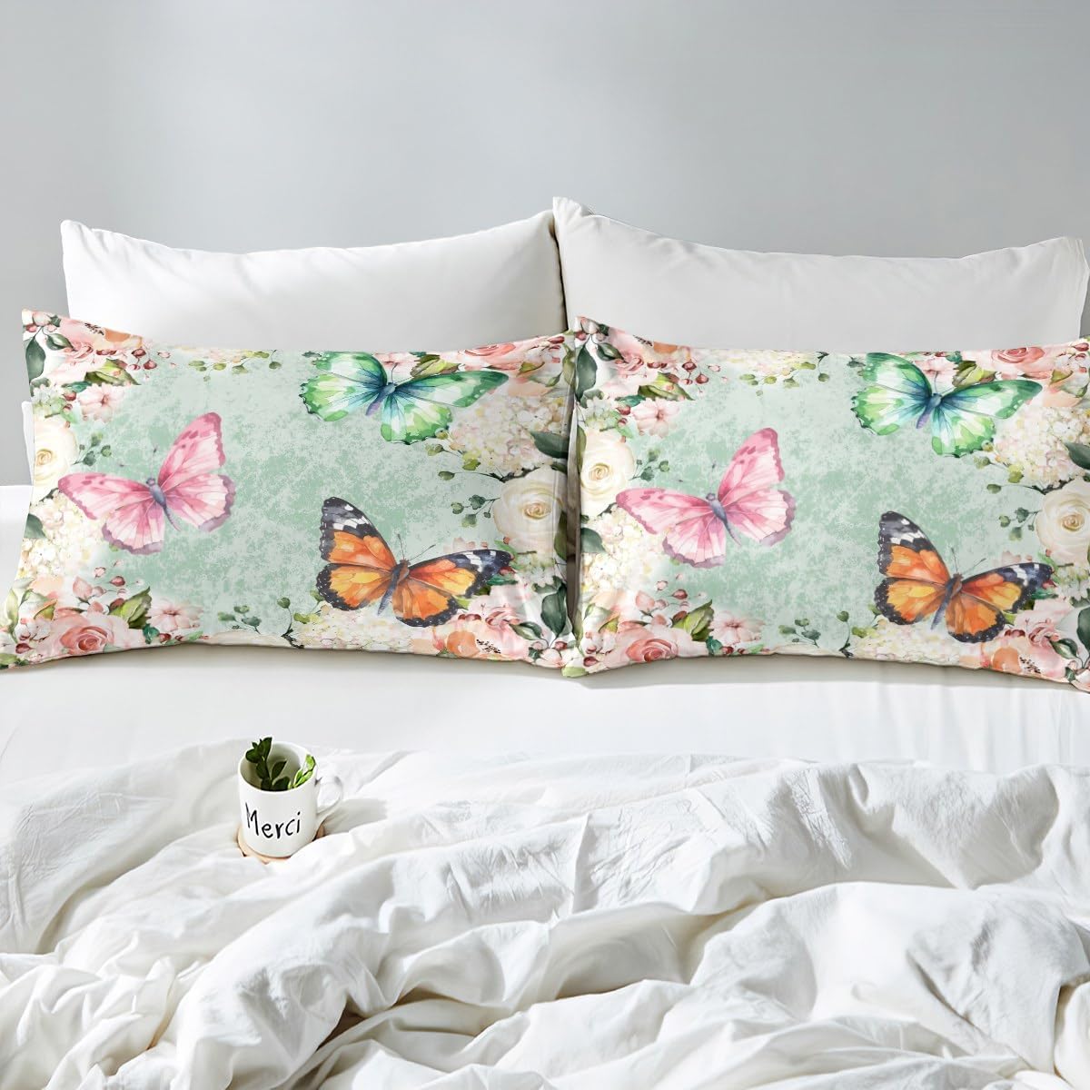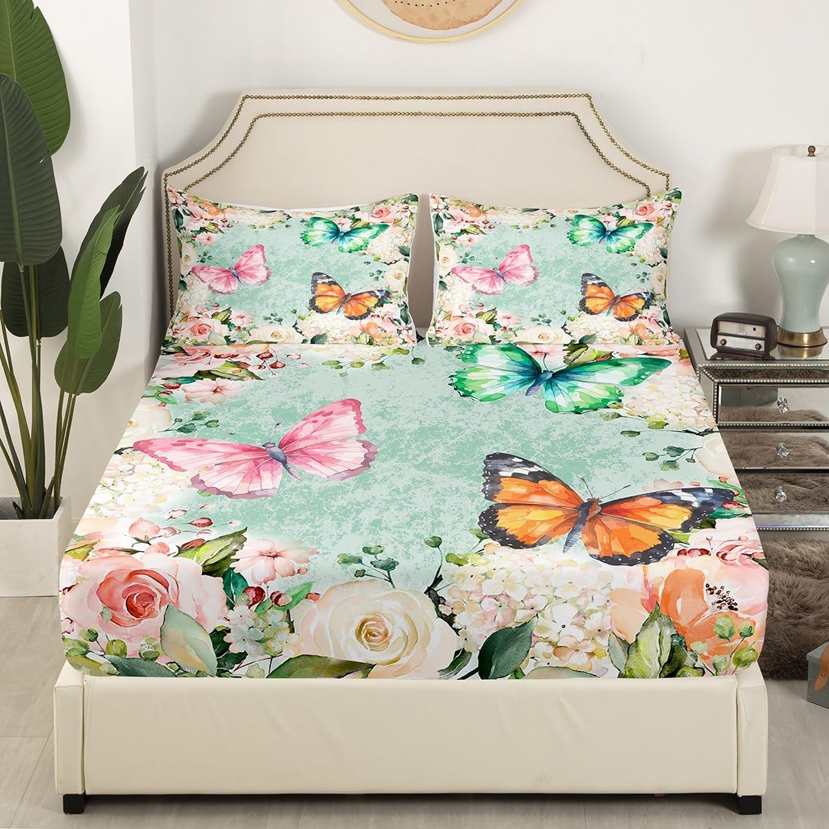 Natural Animal Fitted Sheet Queen Size Watercolor Floral Botanical Bedding Sheet Set,Colorful Butterfly Bed Cover Ultra Soft Breathable Bedding 3 Pcs