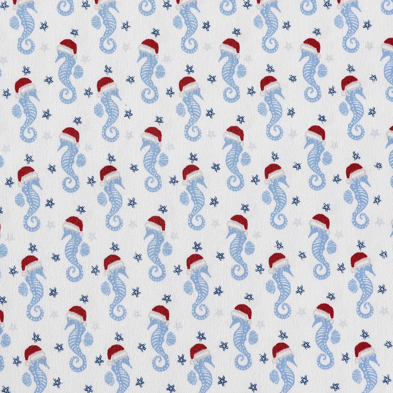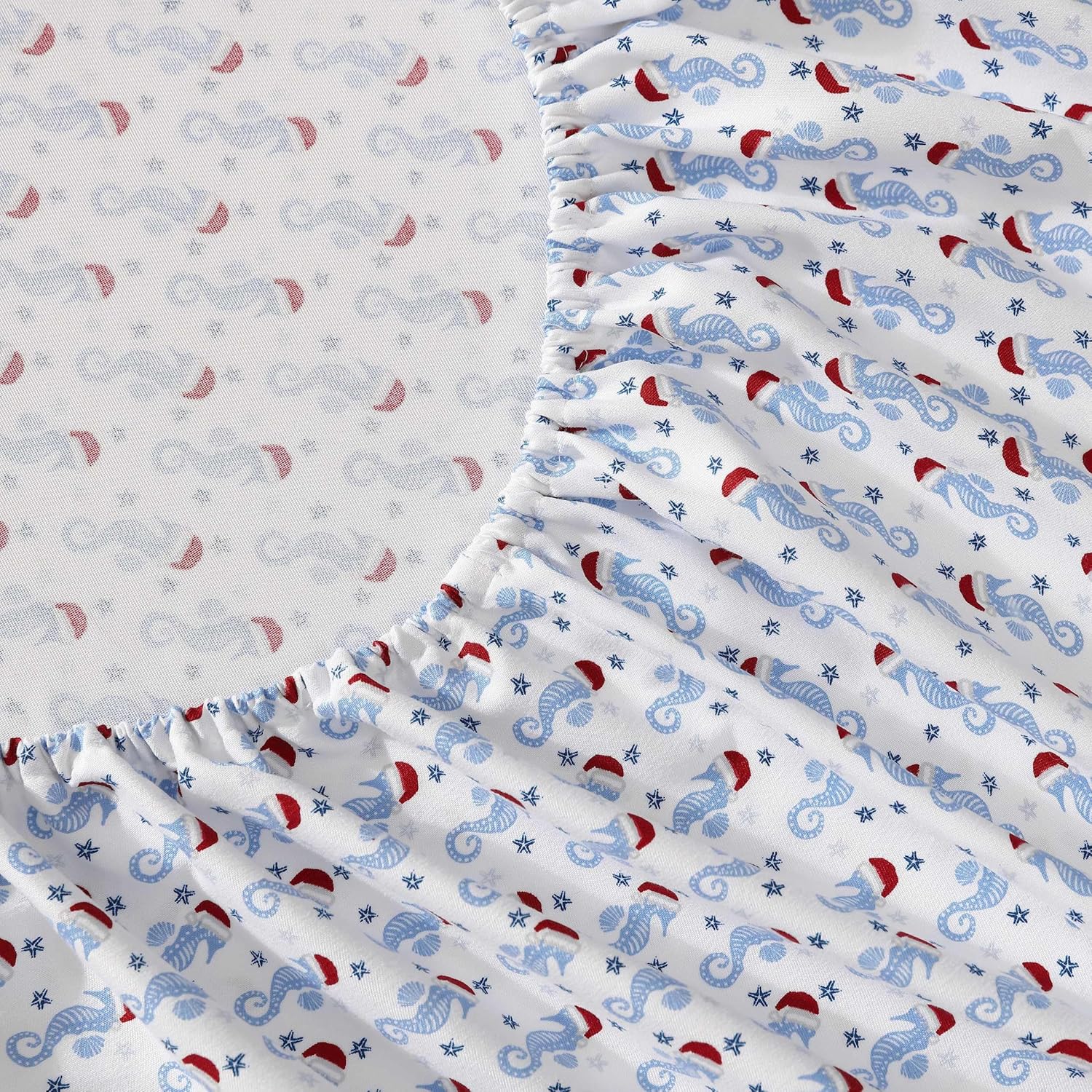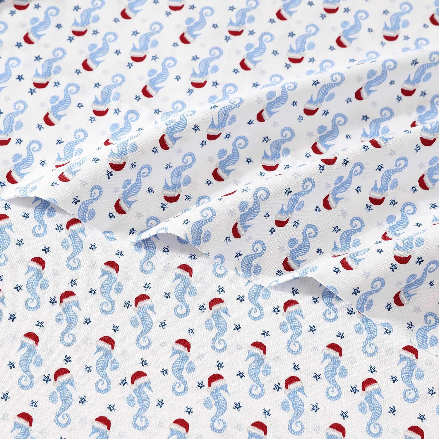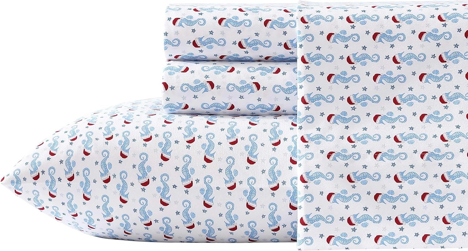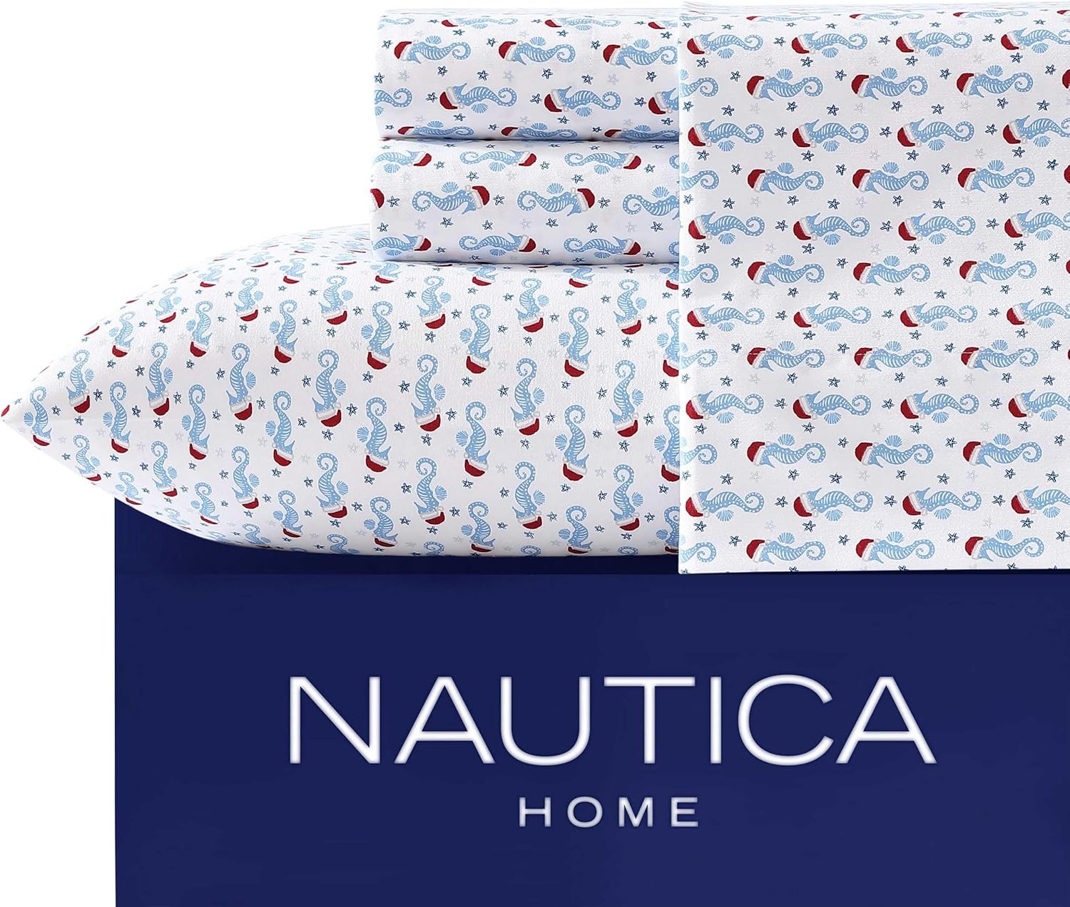 About this itemn100% FlannelnNAUTICA HOME: Sustainably crafted bedding and bath collections inspired by the sea. Our collections combine style and functionality for products that are comfortable, versatile, and ideal for everyday use.nFEATURES: The Nautica Holiday Seahorse flannel sheet set features fun novelty seahorses in blue ready for the holiday time in red Santa hats tossed on a white ground. Crafted with 100% flannel and brushed for extra softness, this sheet set is perfect for a cozy night’s sleep. The Nautica Polyester Flannel Sheet Set coordinates beautifully with any Nautica bedding sets.nINCLUDES: One queen flat sheet, one fitted sheet, and two standard pillowcases. The flat sheet measures at 102